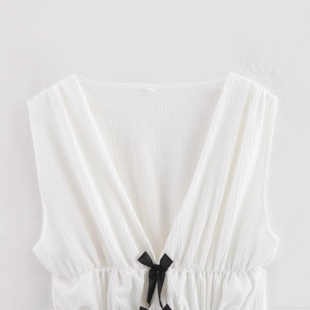 Women's V-Neck Sleeveless Tank Top Sexy Textured Crinkle Pullover With Black Bow Ruffled Hem Summer Streetwear Party Vest