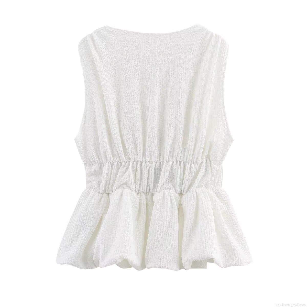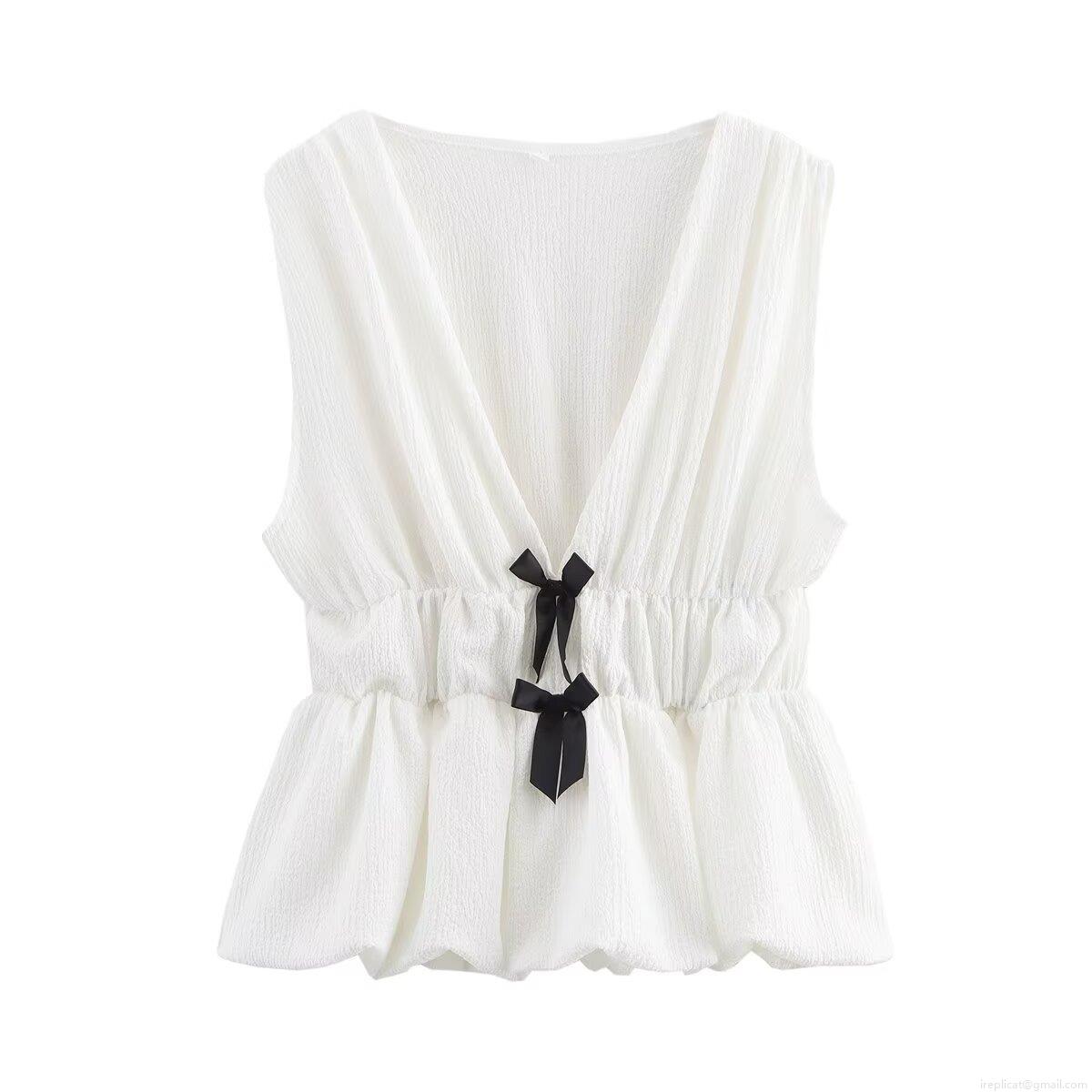 • Women's V-Neck Sleeveless Tank Top Sexy Textured Crinkle Pullover With Black Bow Ruffled Hem Summer Streetwear Party Vest