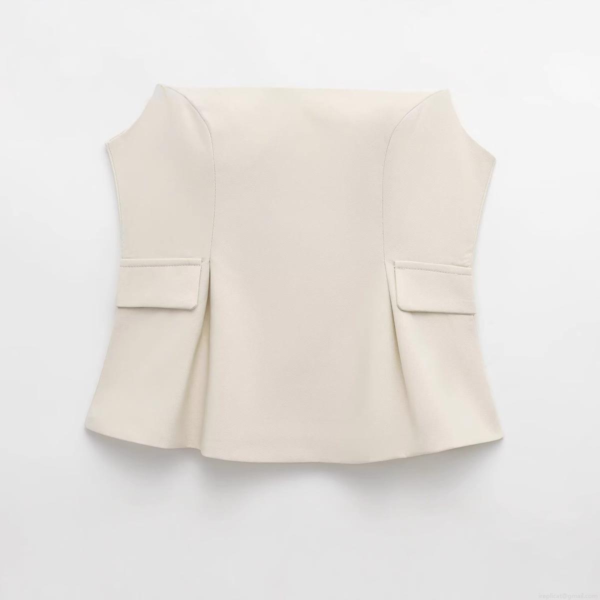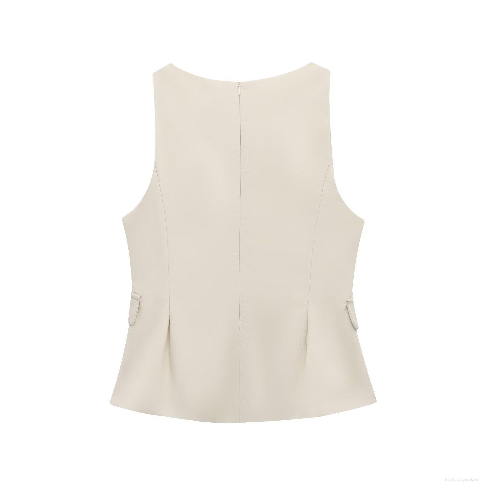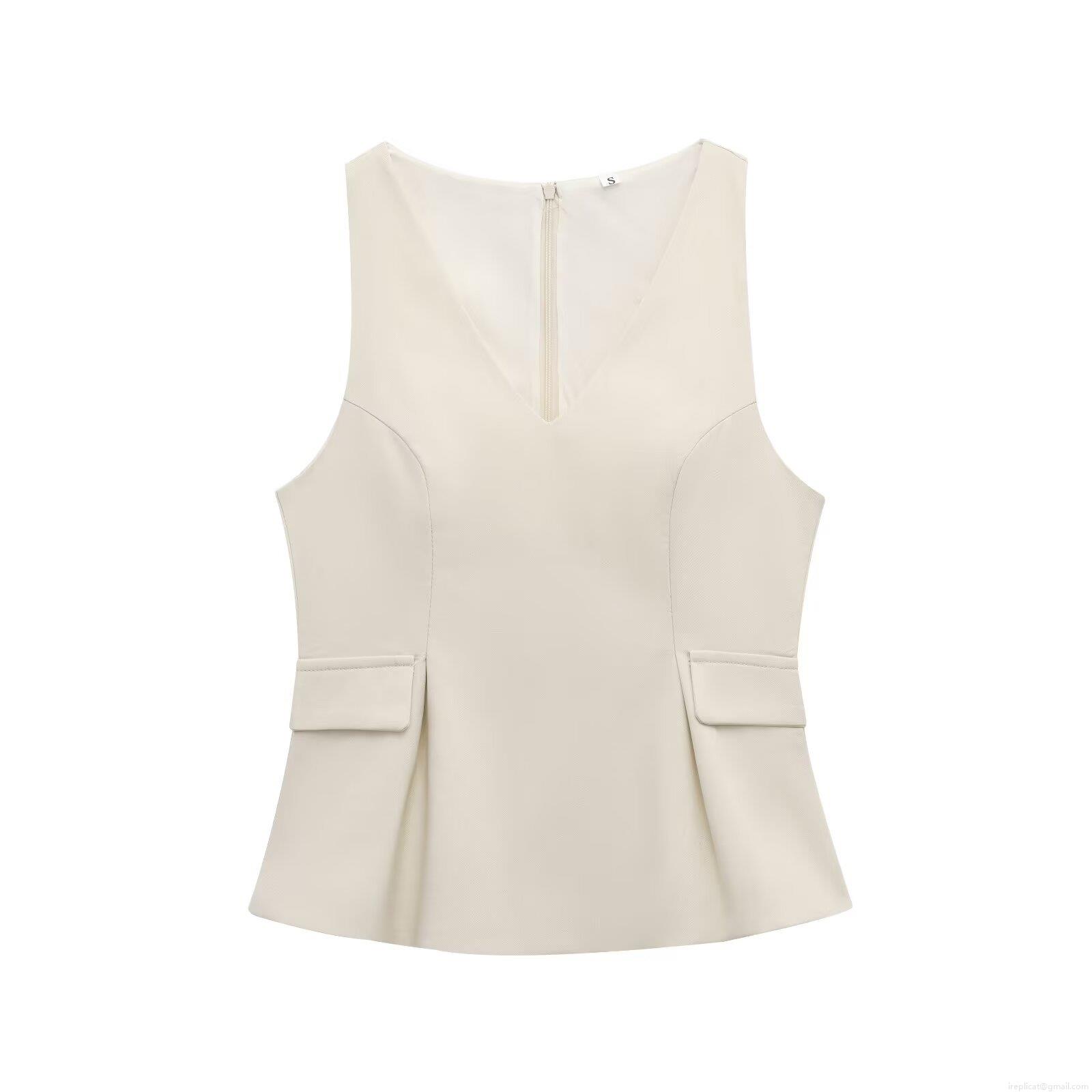 • Women's V-Neck Sleeveless Woven Polyester Vest Top With Decorative Pockets Back Zipper Peplum Hem Slim Fit Cream White Blouse For Summer Daily Commute Party