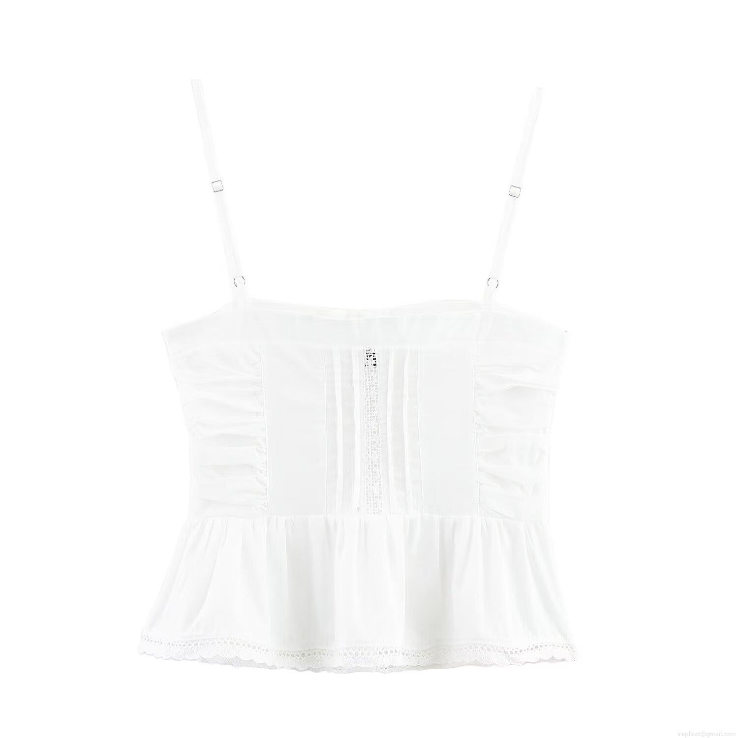 Women's White Cami Top Embroidered Lace Trim Ruching Cotton Blend Sleeveless Crop Top Button Down Strappy Tank Top For Summer Casual Streetwear