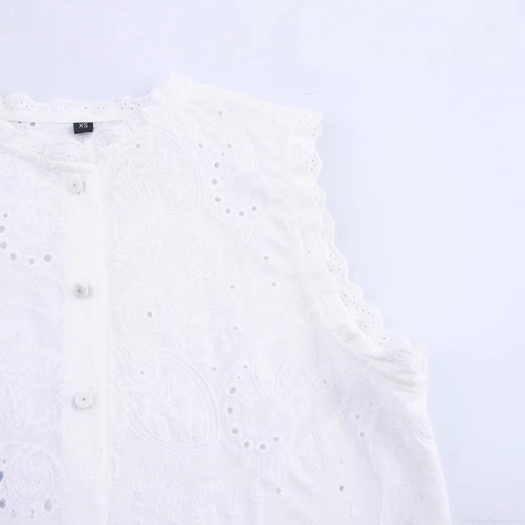 • Women's White Cotton Blend Embroidered Eyelet Vest Top Sleeveless Button Down Round Neck Hollow Out Lace Shirt For Summer Casual Beach Streetwear