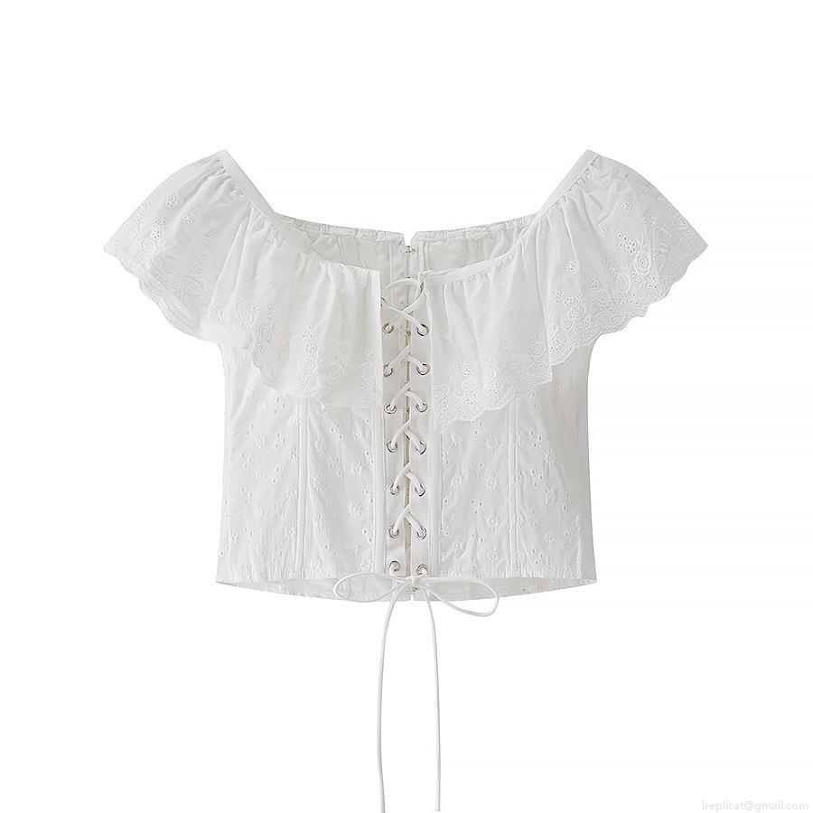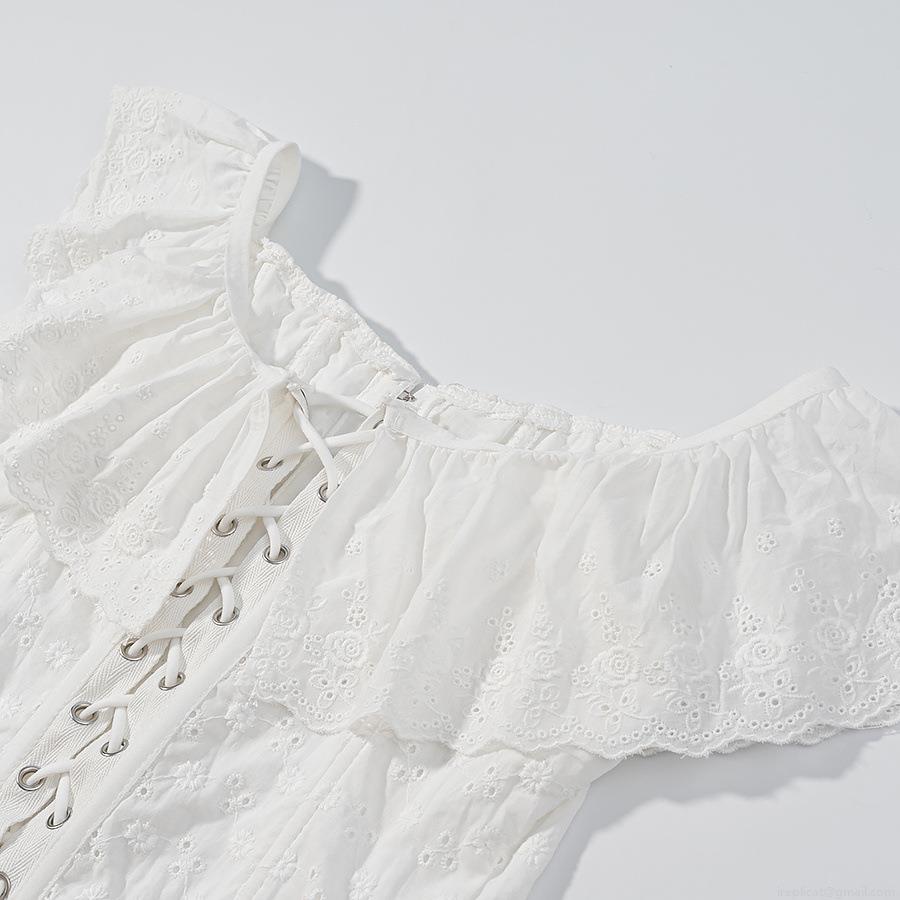 • Women's White Eyelet Embroidery Corset Crop Top Ruffle Off Shoulder Lace Up Chiffon Polyester Bustier Blouse For Summer Beach Date Sweet French Style