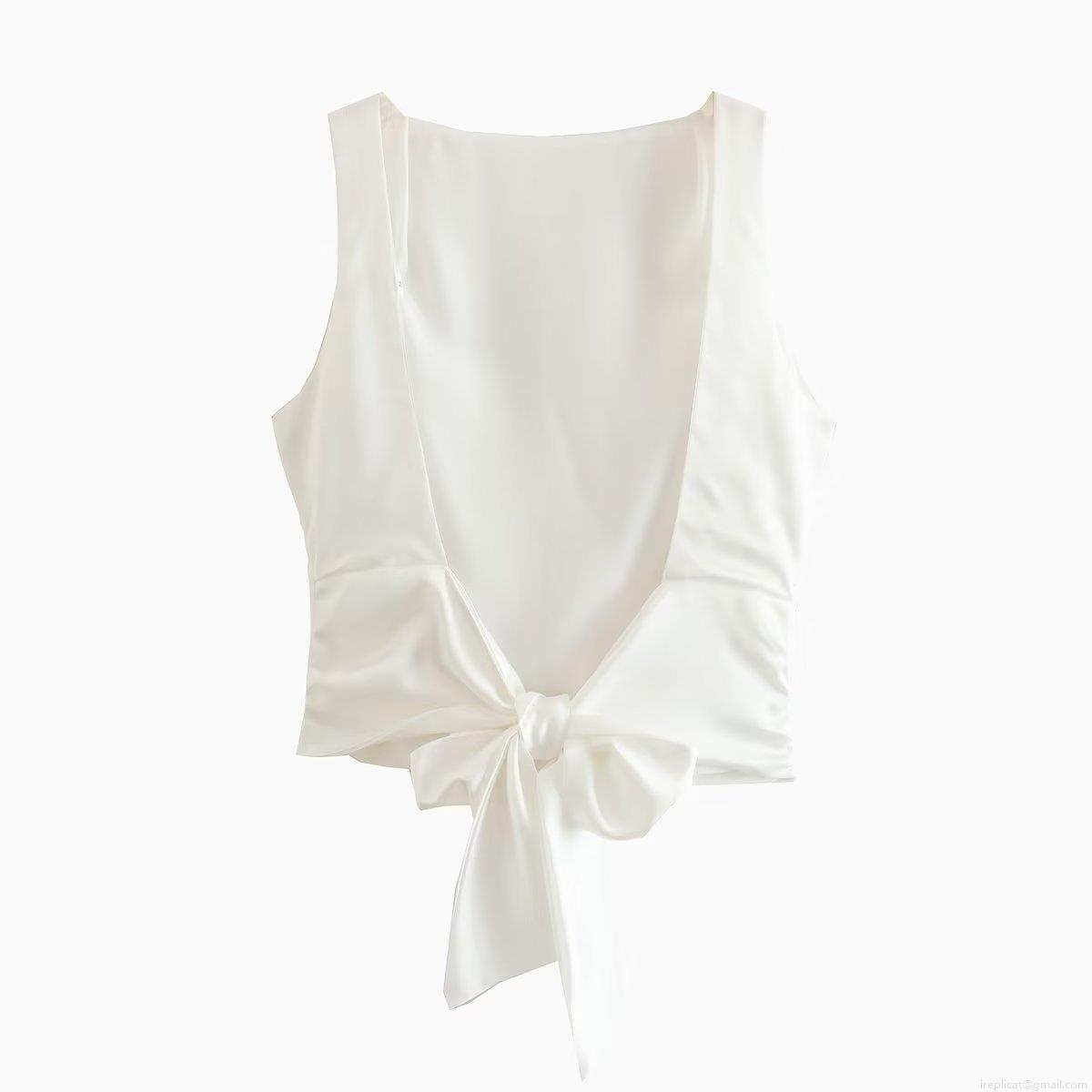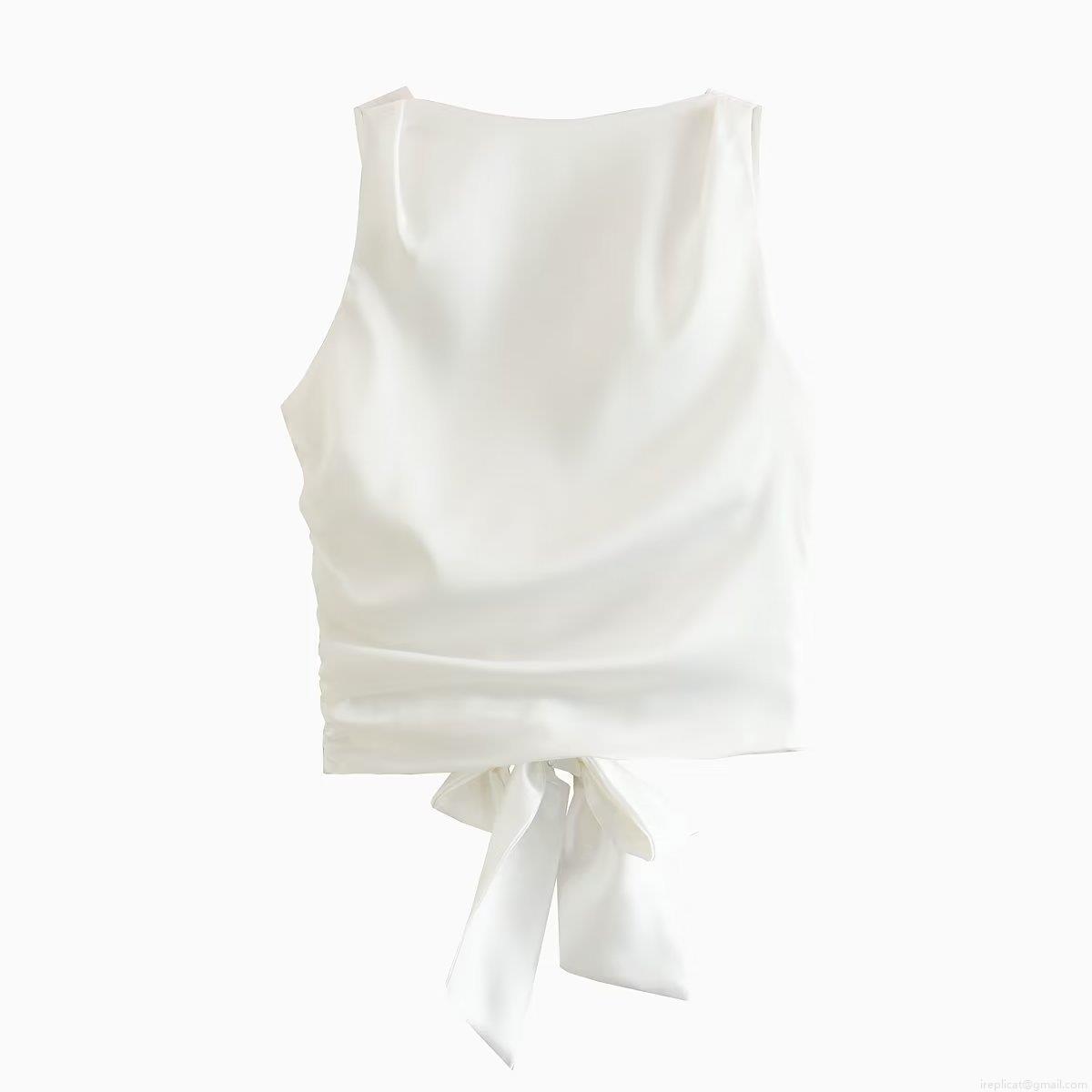 • Women's Y2K Satin Backless Tank Top Sexy Bow Tie Back Sleeveless Crop Top Summer Round Neck Solid Color Pleated Blouse Party Streetwear Cami