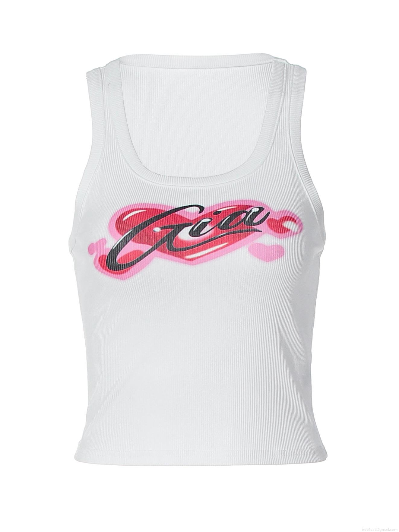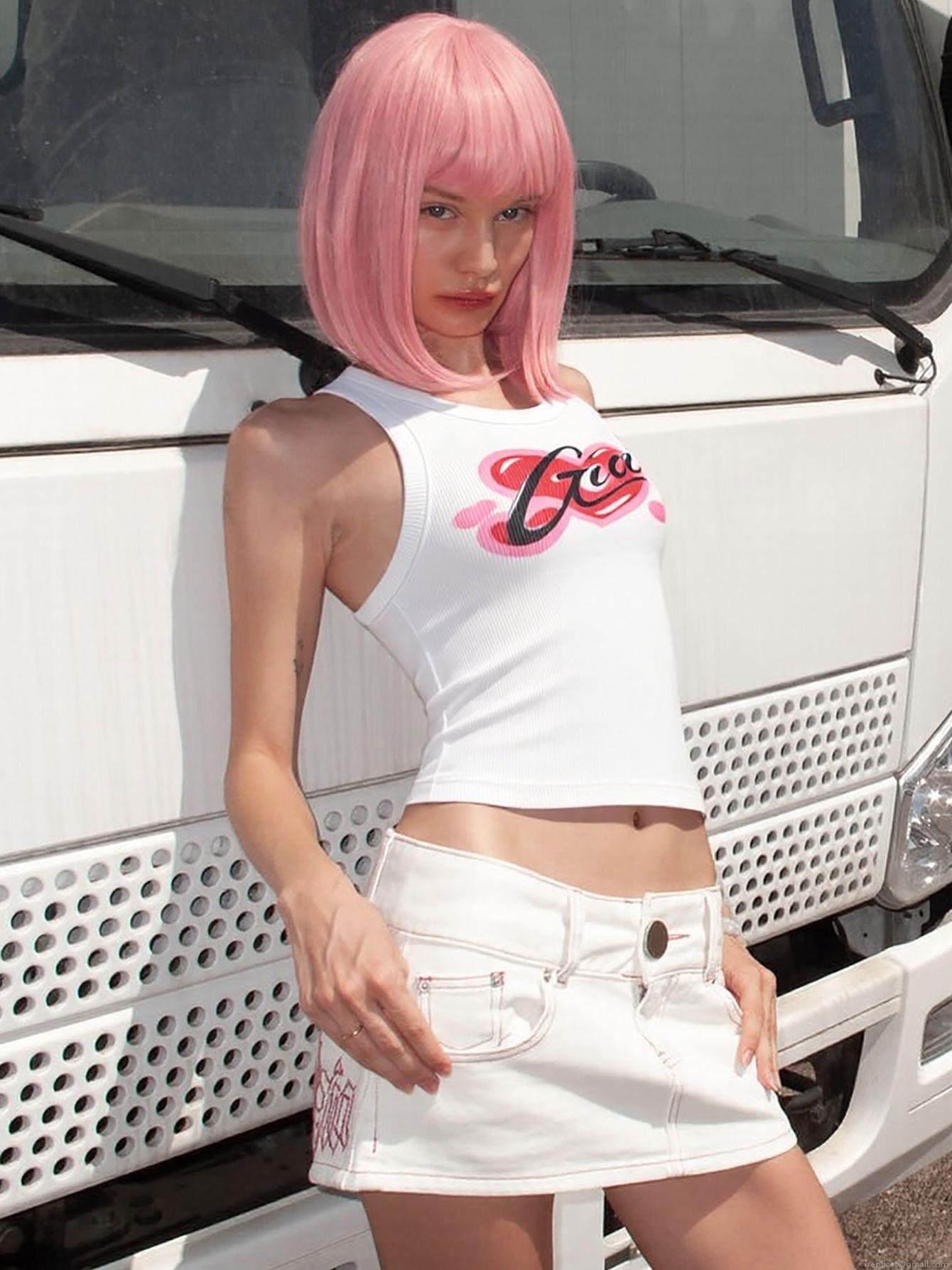 • Women's Y2K Sleeveless Ribbed Knit Tank Top Polyester Spandex Slim Fit Crew Neck Letter Heart Print Crop Top Summer Streetwear Casual Fashion White Top