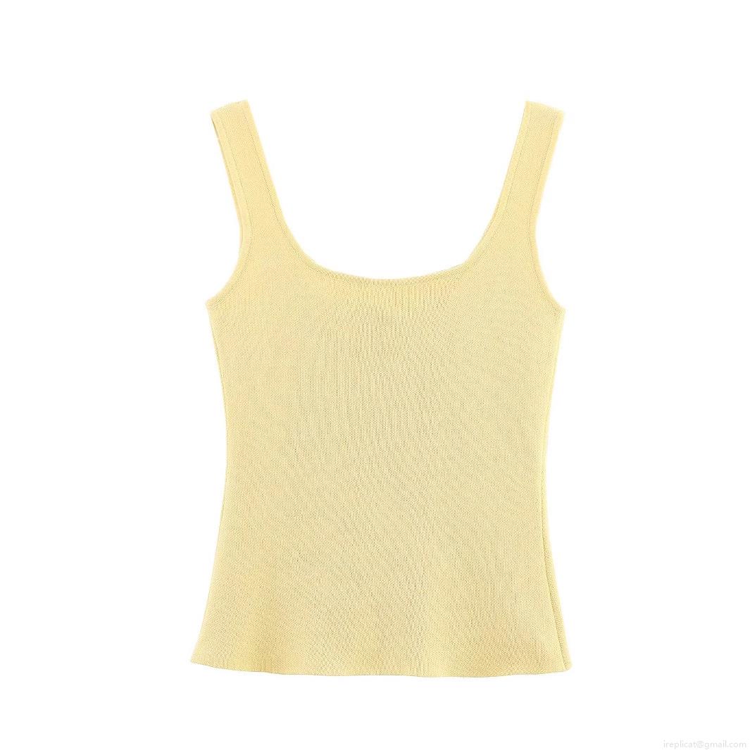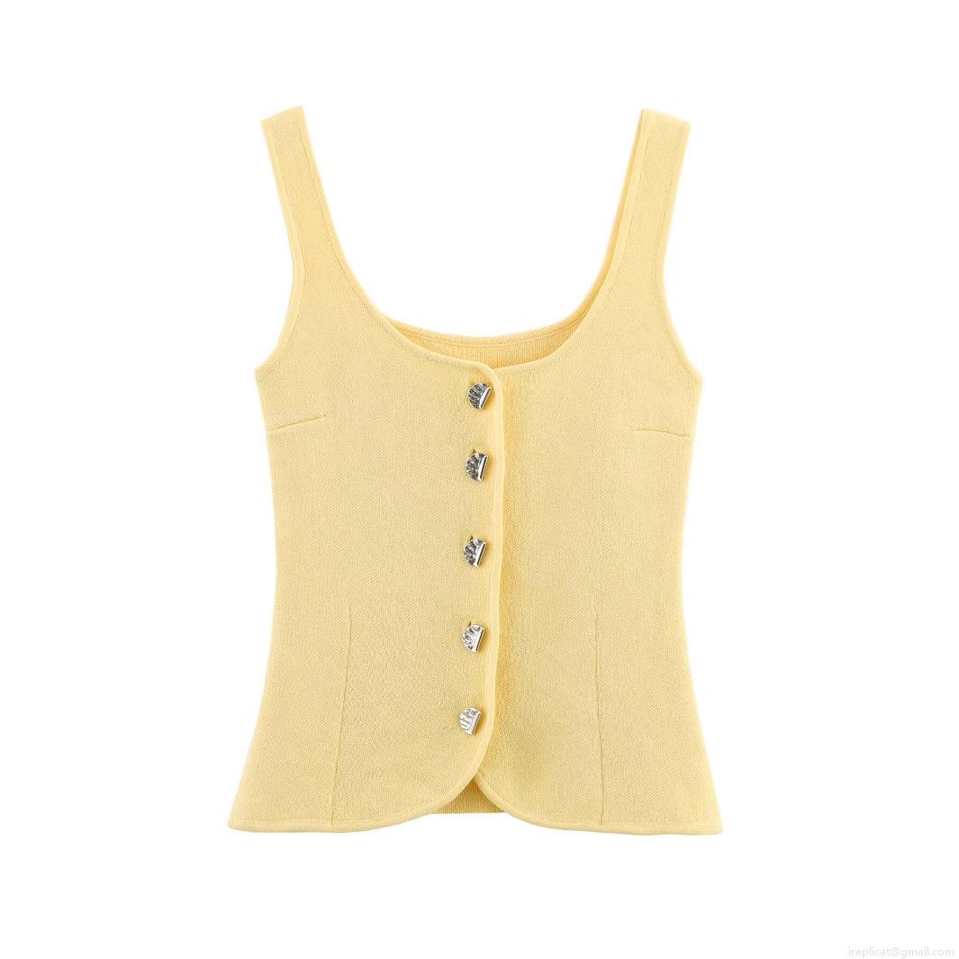 Women's Yellow Knit Tank Top Slim Fit Ribbed Sleeveless Vest With Metal Buttons Elegant U-Neck Polyester Knitwear For Summer Daily Vacation Fashion Lady Top