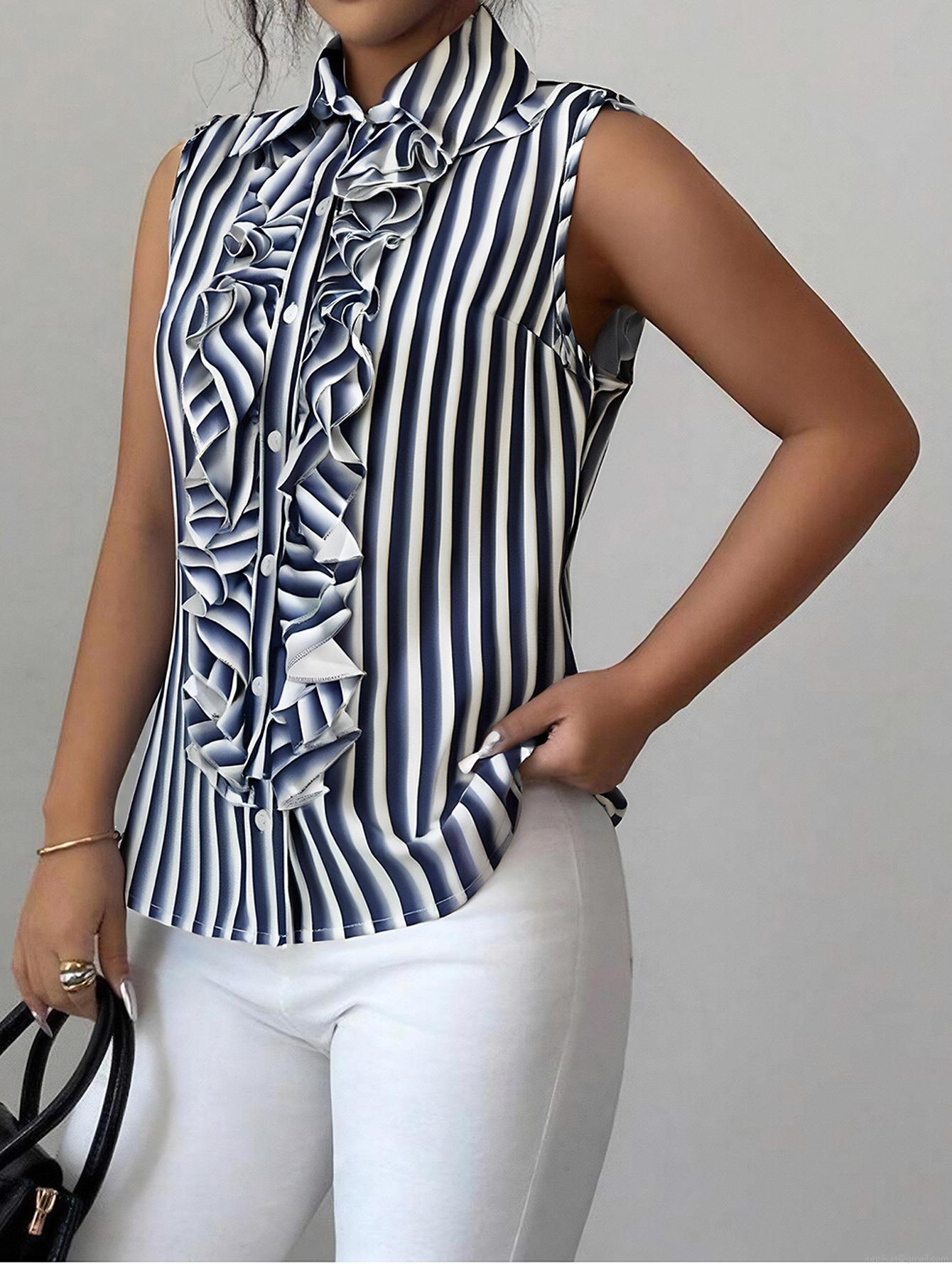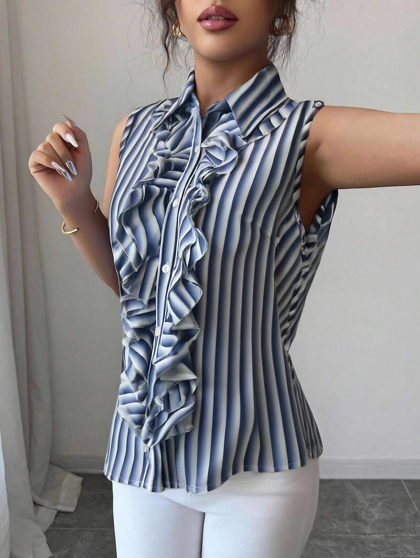 Elegant Women Blue White Striped Sleeveless Blouse Polyester Ruffle Trim Button Down Lapel Shirt Office Commute Summer Top