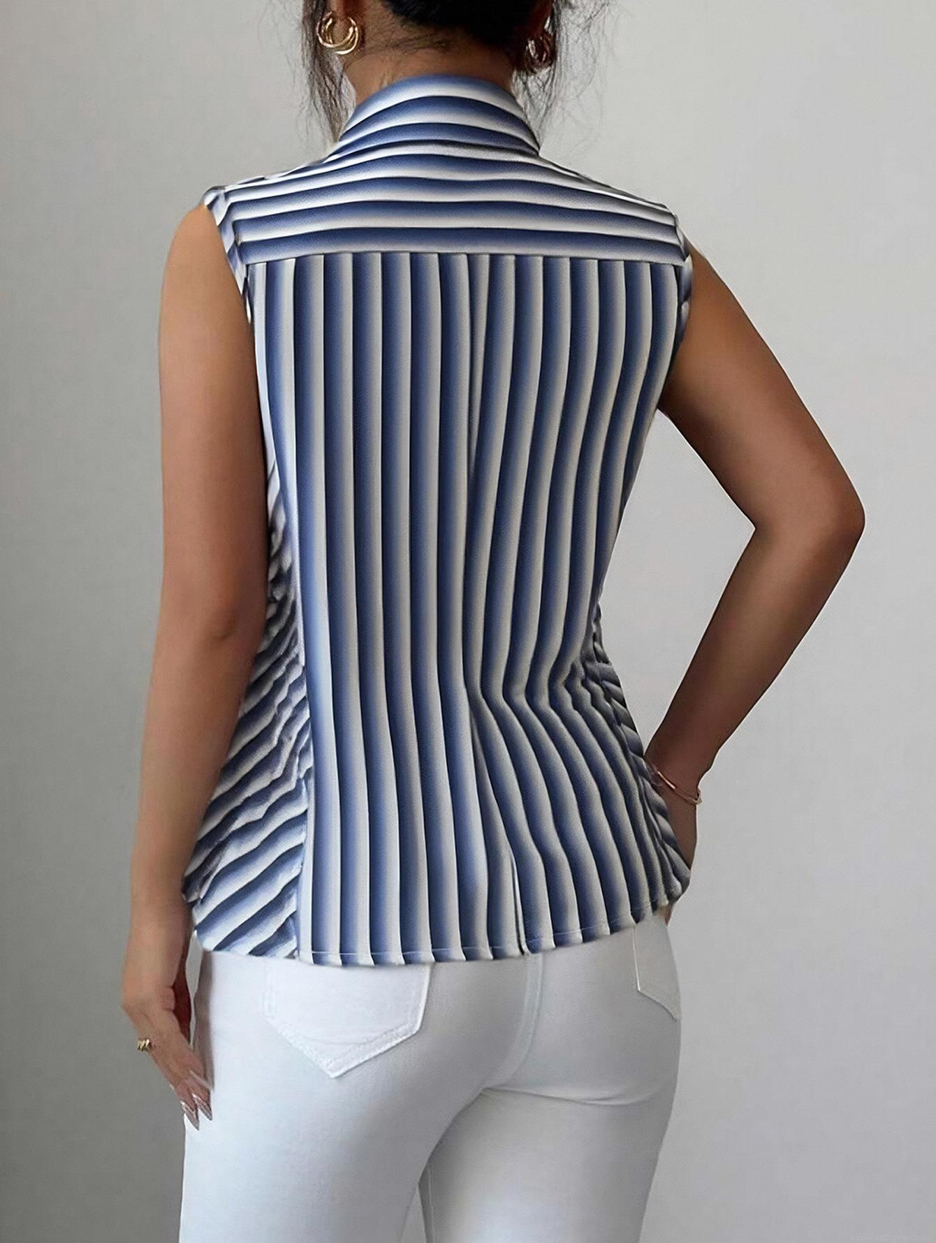 • Elegant Women Blue White Striped Sleeveless Blouse Polyester Ruffle Trim Button Down Lapel Shirt Office Commute Summer Top
