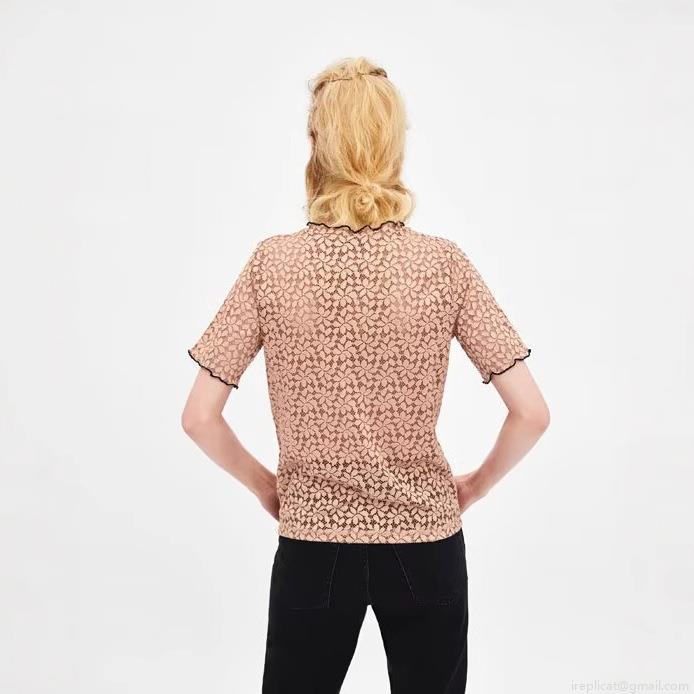 • Elegant Women's Lace Top Contrast Wave Edge Hollow Out Flower Design Round Neck Short Sleeve Blouse Sexy Transparent Summer Daily Shirt Polyester