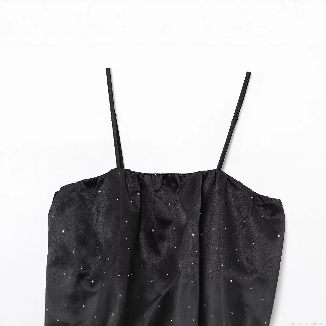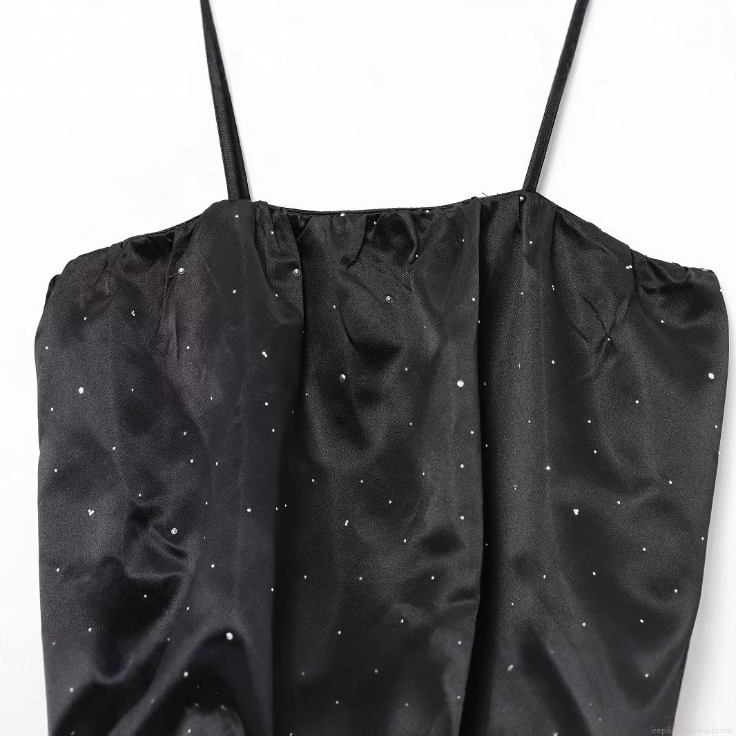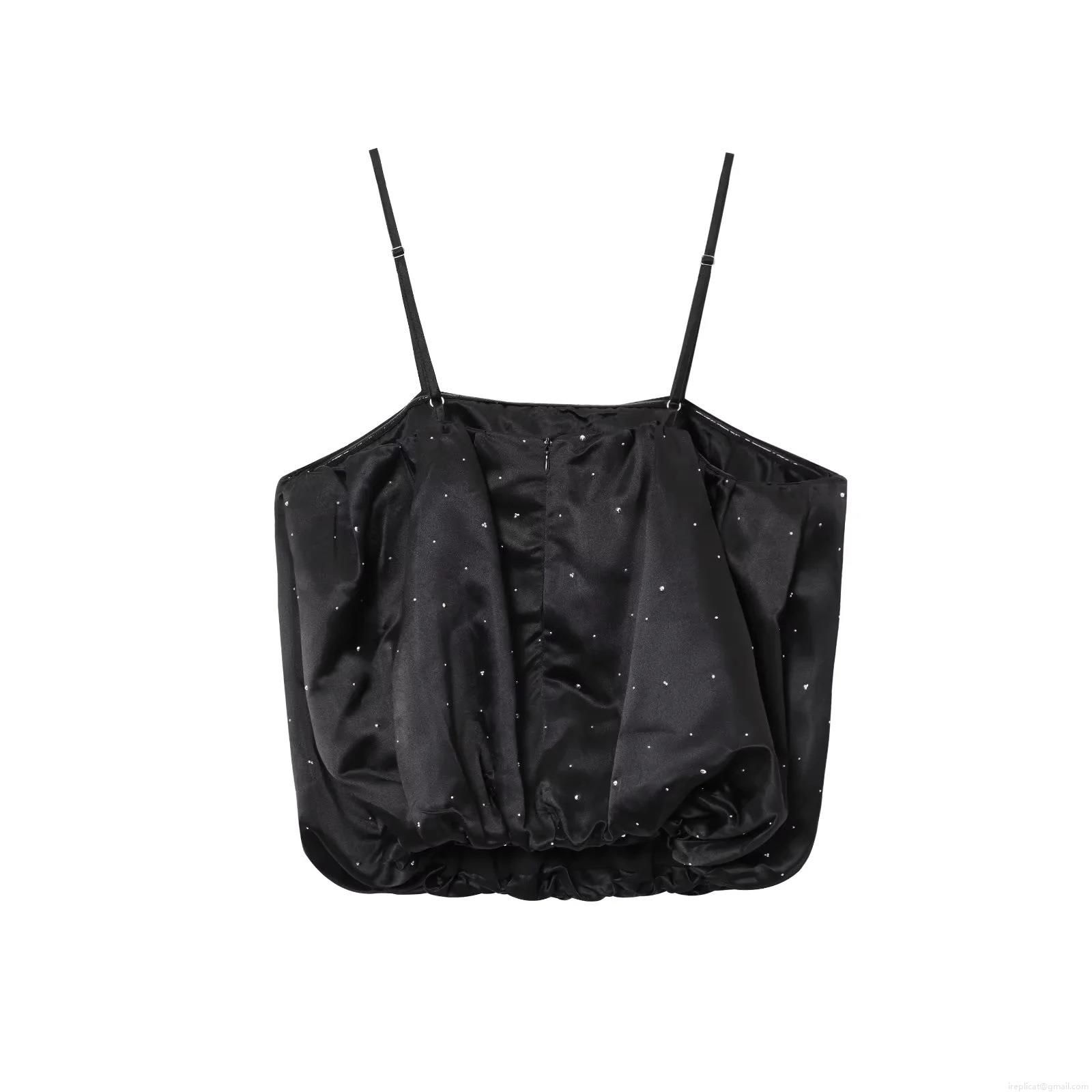 French Elegant Women's Black Rhinestone Balloon Hem Camisole Top Bridal Satin Spaghetti Strap Sexy Crop Tank Top For Party Date