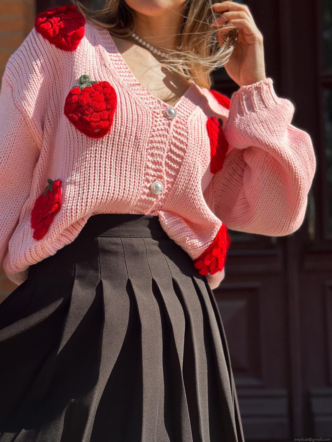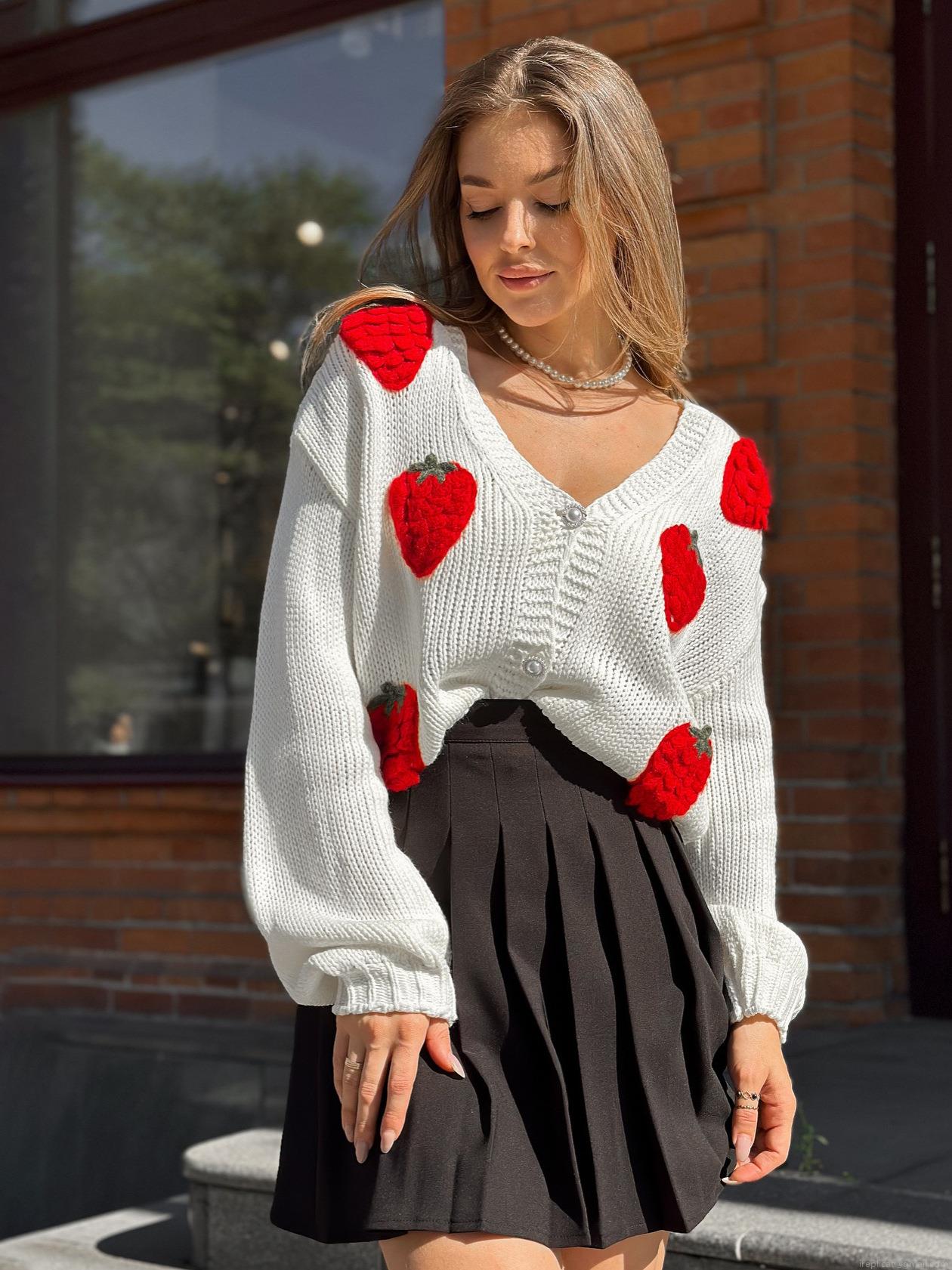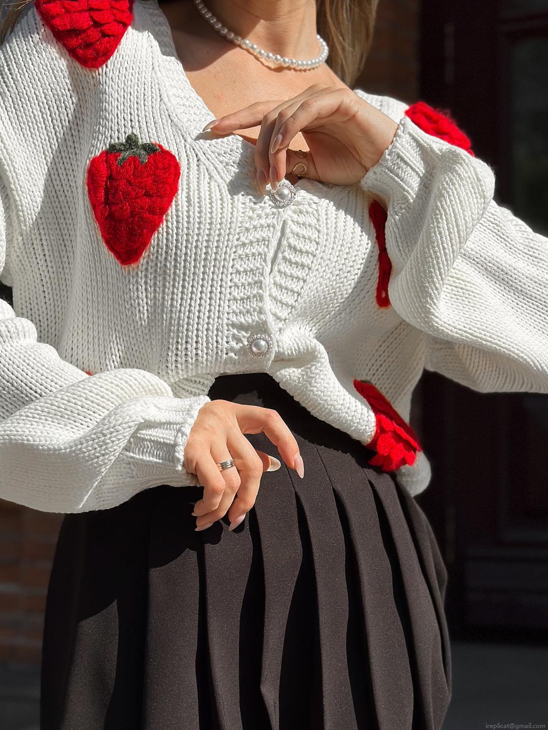• French Vintage Sweet Strawberry Flocked Knit Cardigan Sweater Women Pearl Button Round Neck Long Sleeve Cotton Blend Casual Top