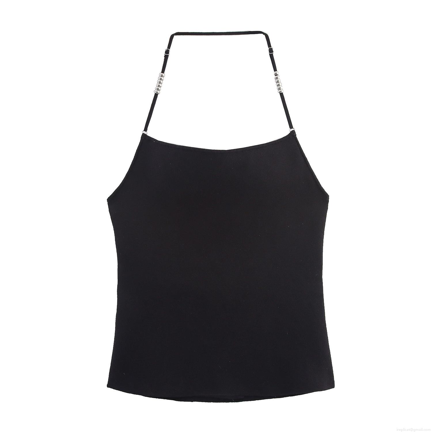 • Sexy Halter Neck Knitted Tank Top With Silver Metal Beads Backless Slim Fit Side Slit Sleeveless Camisole For Women Party Clubwear Solid Black Knit Top