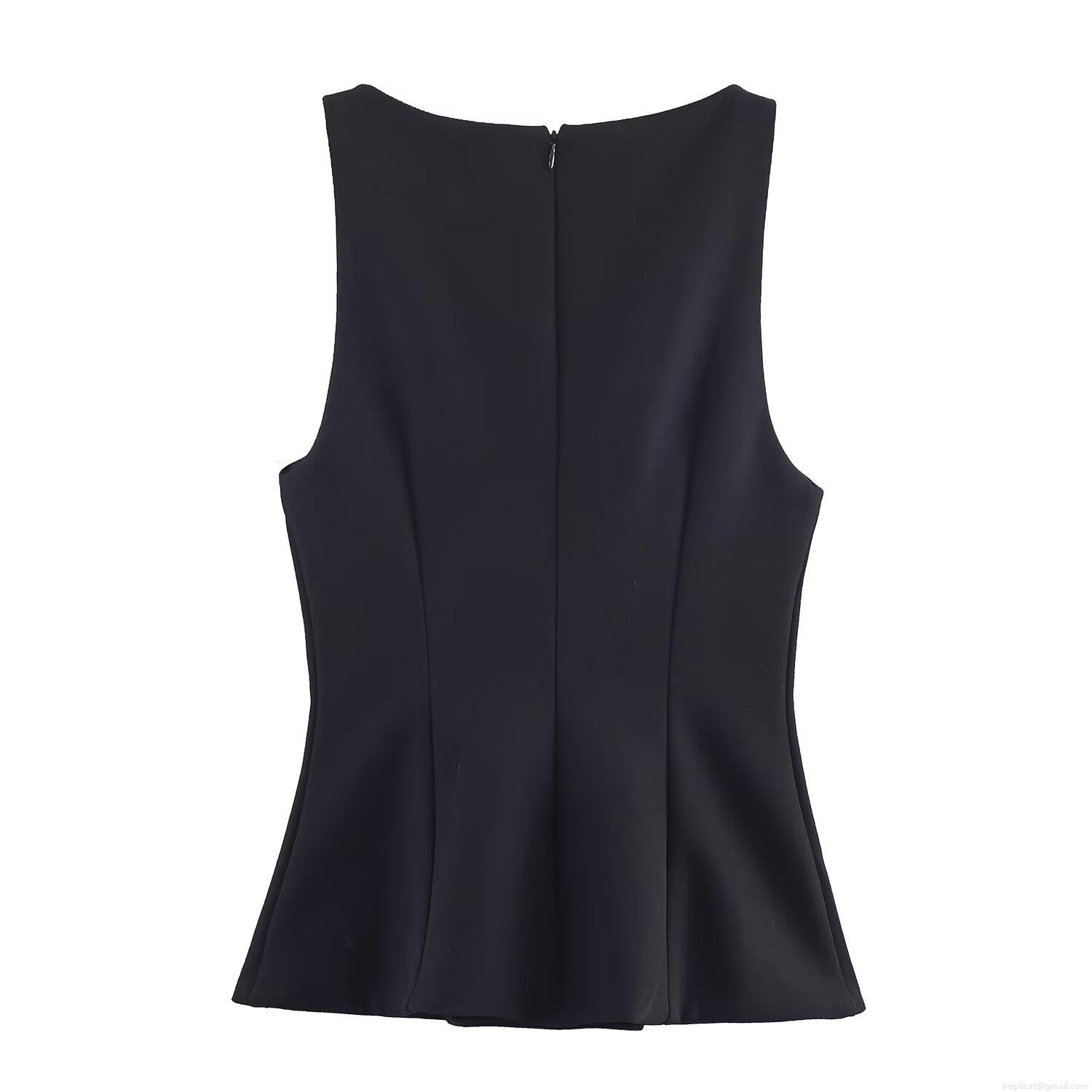 Women Black Sleeveless Slim Fit Top With Large Rhinestone Jewel Buttons Elegant Crew Neck Party Dating Vest With Back Zipper