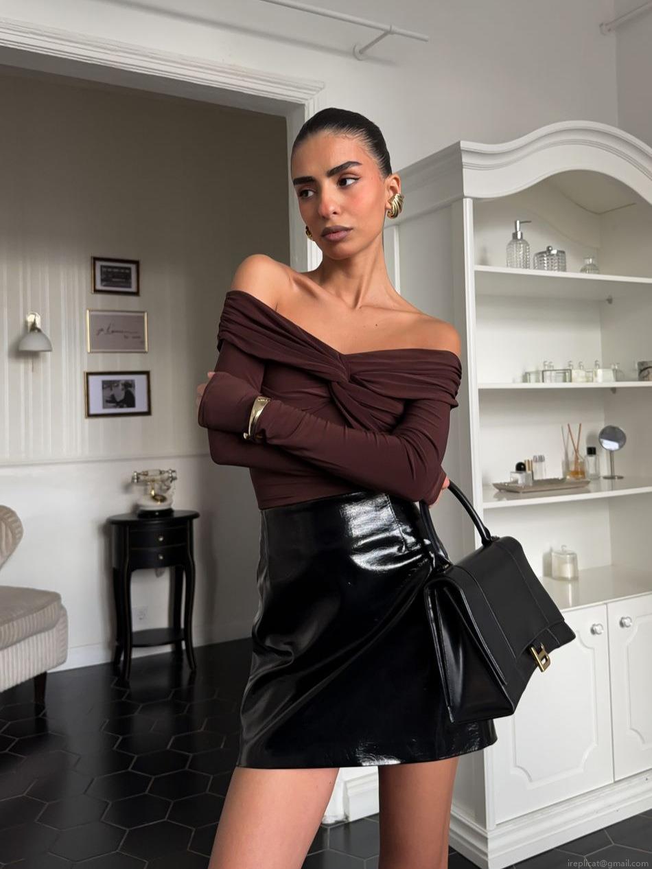 • Women Off Shoulder Twist Front Long Sleeve T-Shirt Sexy Slim Fit Solid Color Cotton Blend Cropped Top Streetwear Party Clubwear Tee