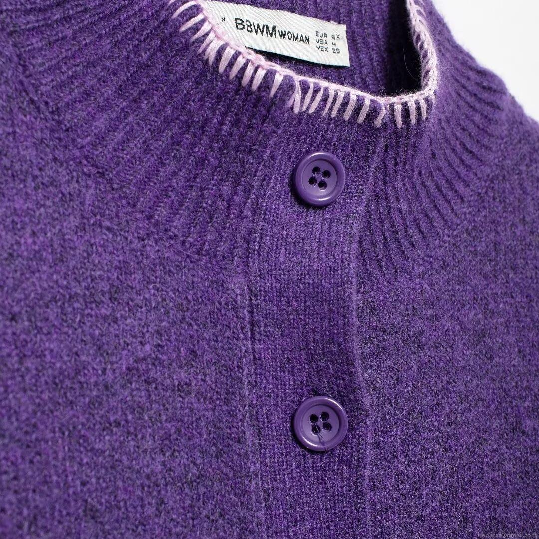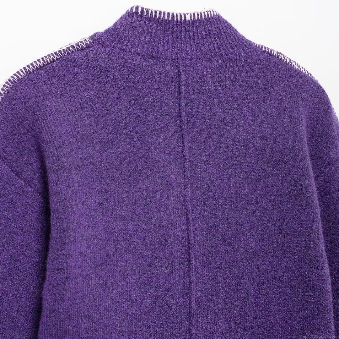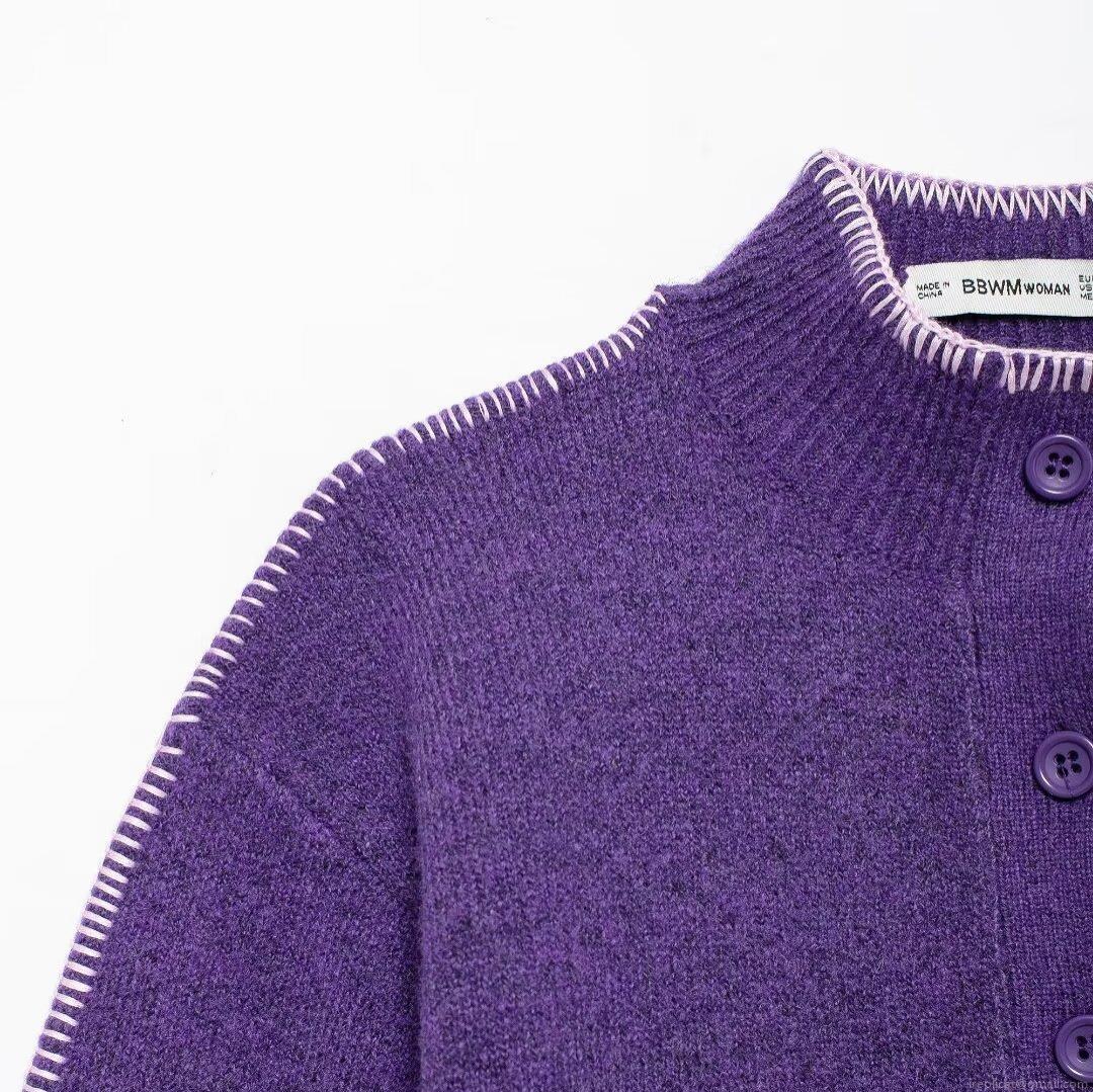 • Women Purple Knitted Cardigan Sweater 100% Polyester Contrast Stitching High Neck Loose Long Sleeve Knitwear For Autumn Winter Daily Wear Casual Lazy Style