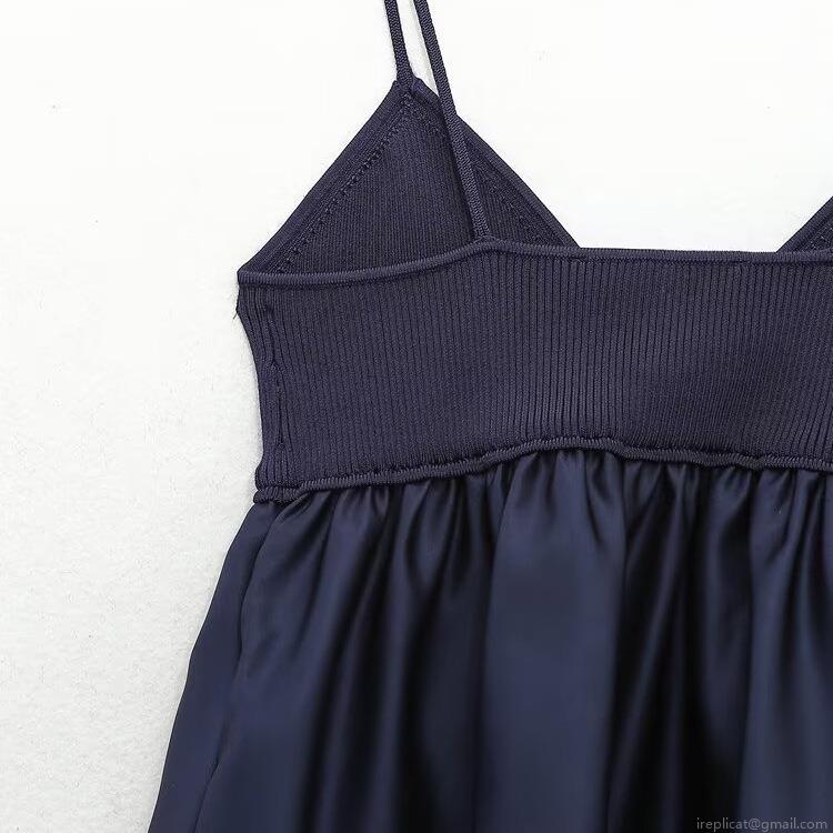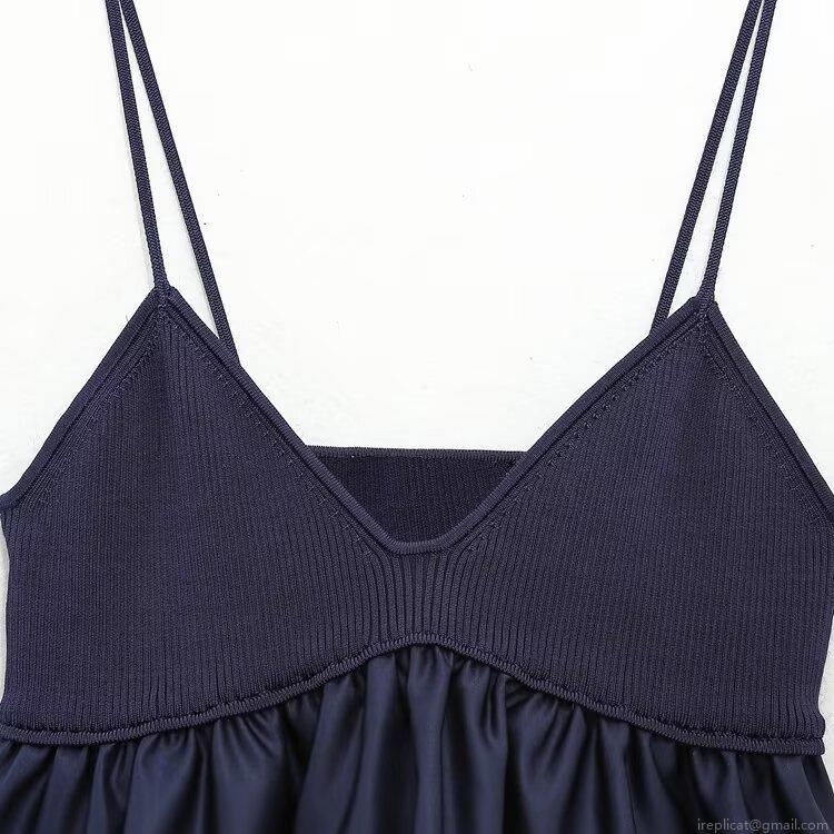 • Women Sexy Deep Blue Patchwork Camisole Ribbed Knit And Satin V-Neck Spaghetti Strap Top A-Line Flowy Sleeveless Tank Top For Dating Daily Party Wear