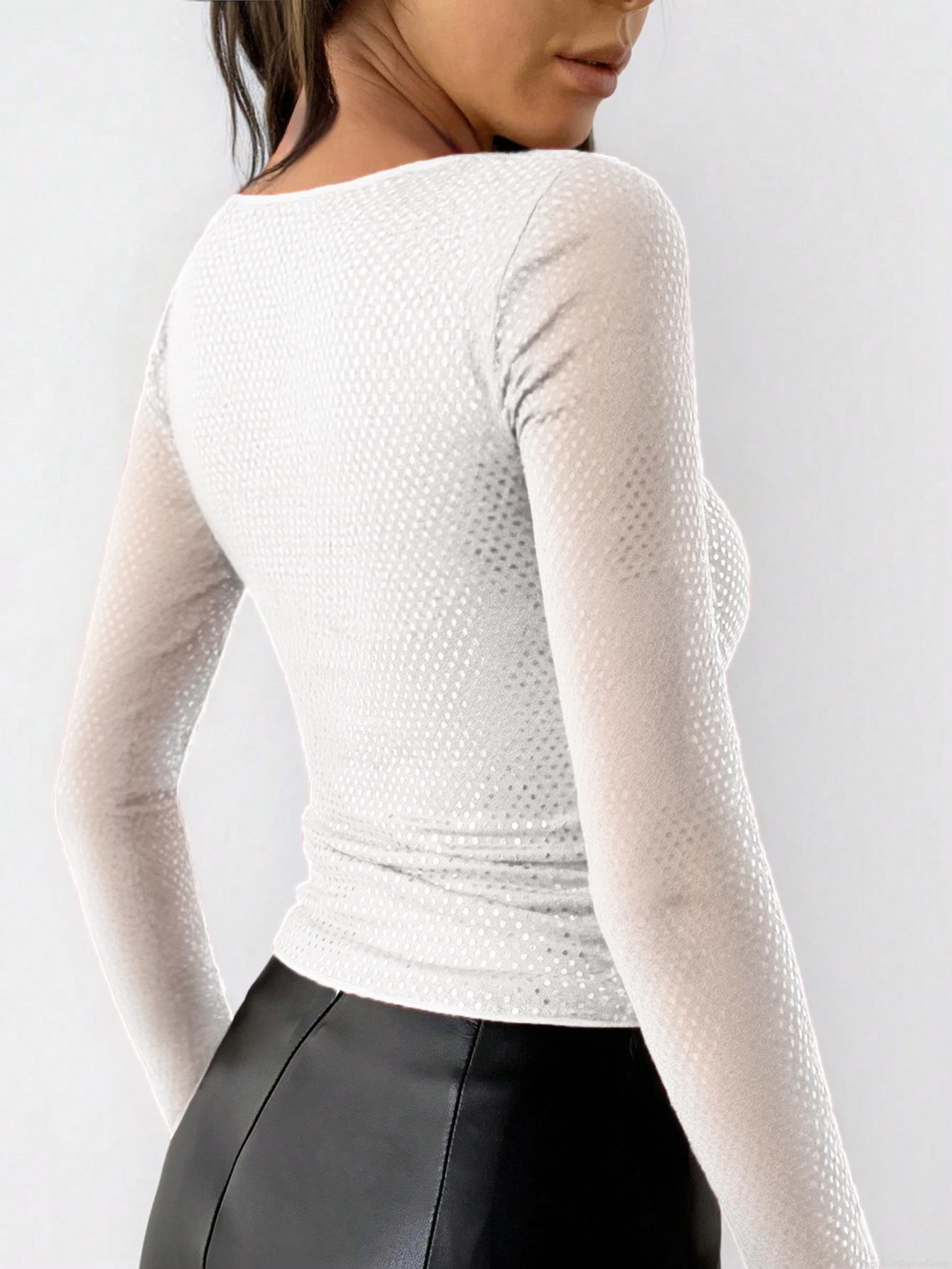 Women Sexy Deep V Neck Long Sleeve T-Shirt Polyester Spandex Sparkly Sequin Mesh Polka Dot Slim Fit Y2K Hot Girl Style Top For Club Party Streetwear