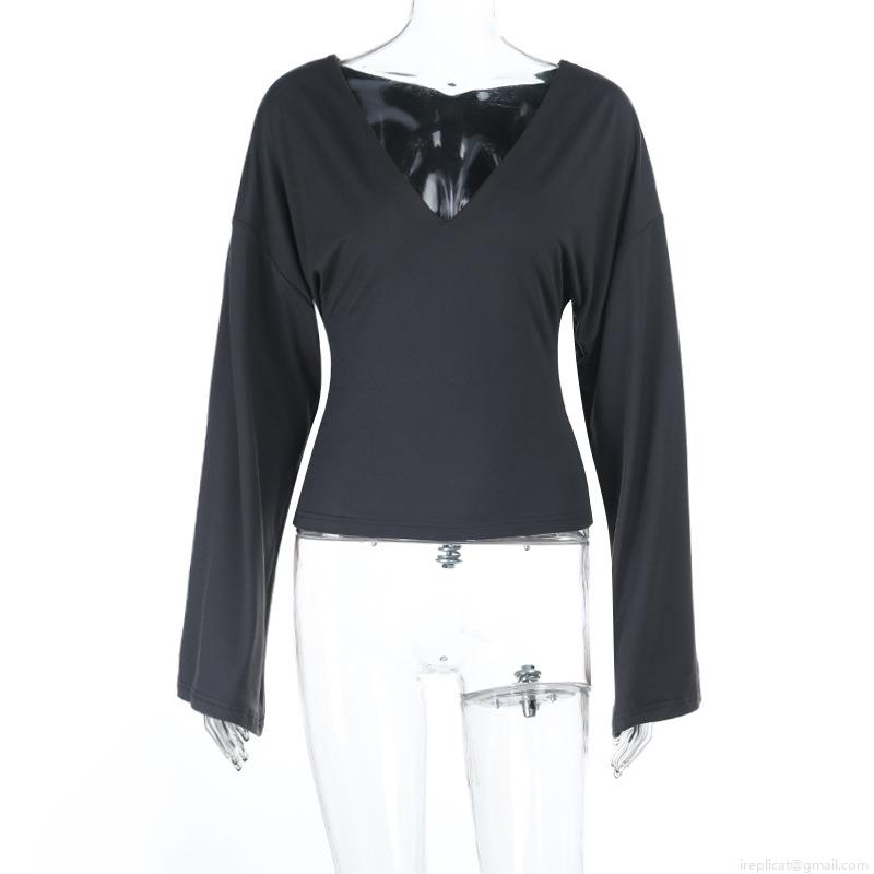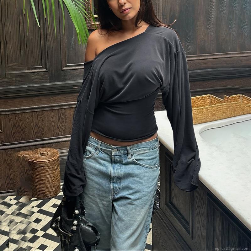 • Women Sexy Deep V-Neck Off-Shoulder Long Sleeve Top Slim Fit Ruched Knitted Pullover Solid Color Base Layer Tee For Party Dating