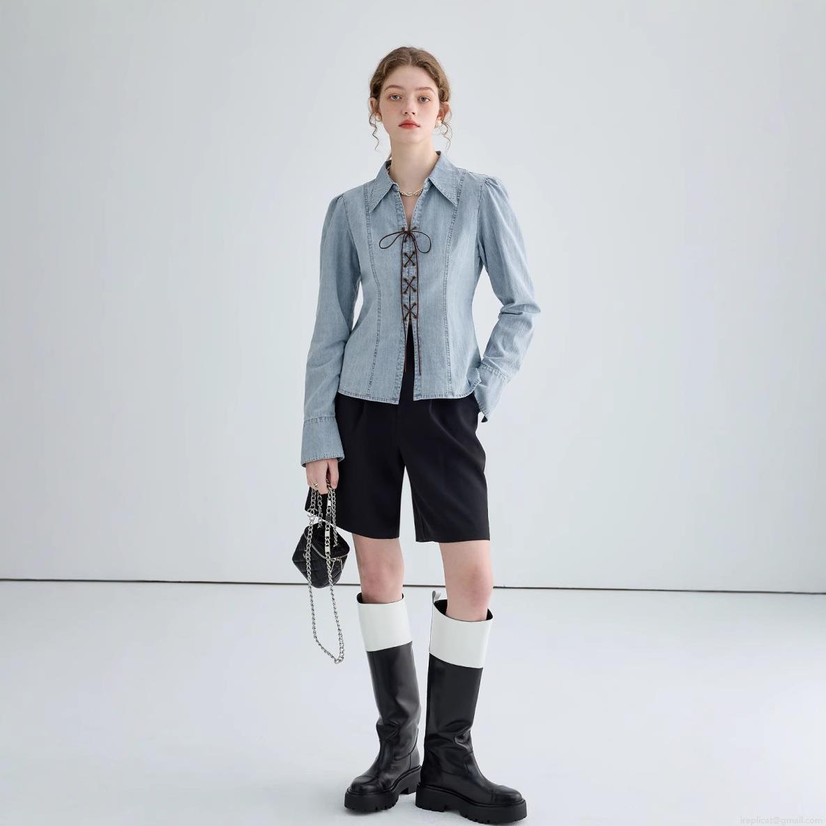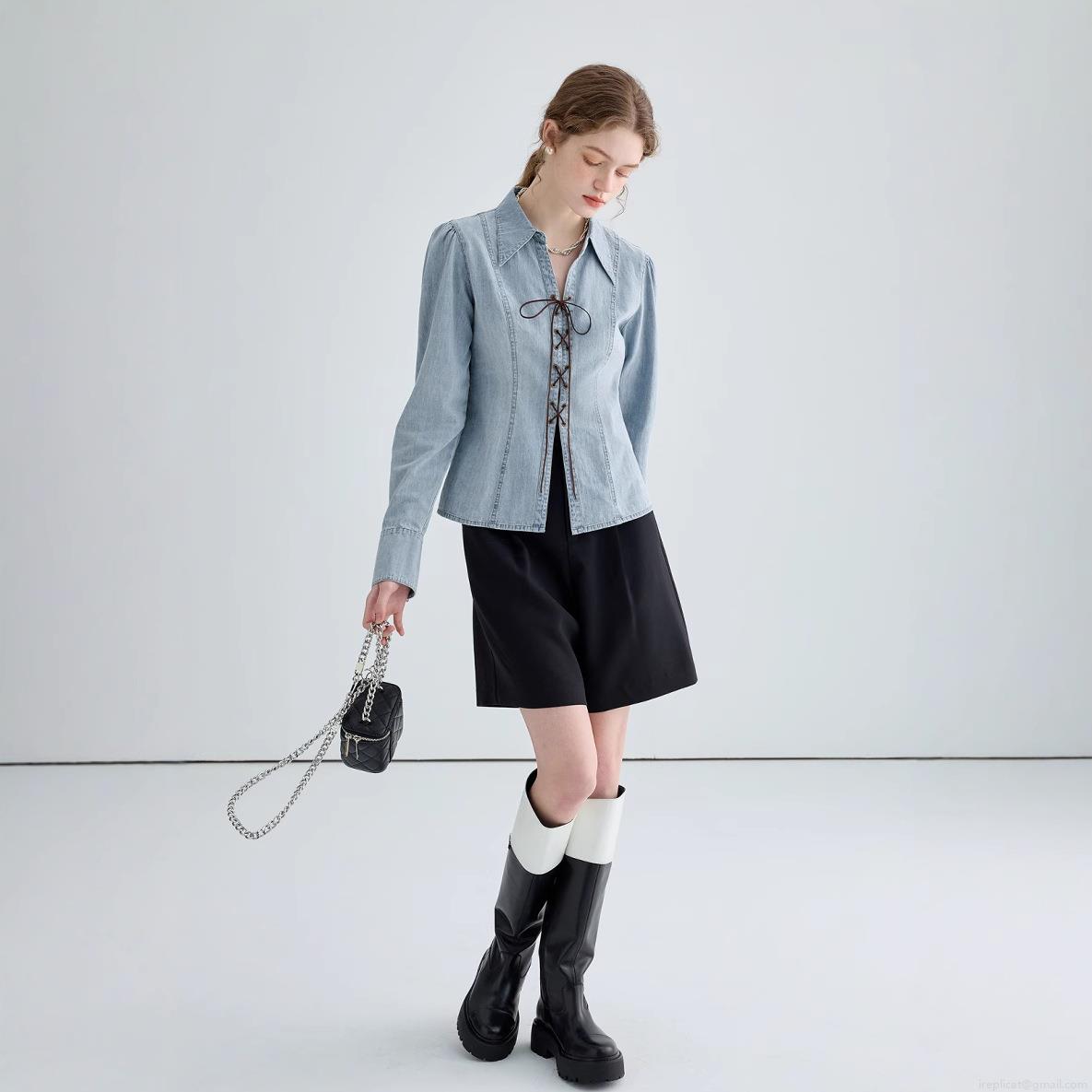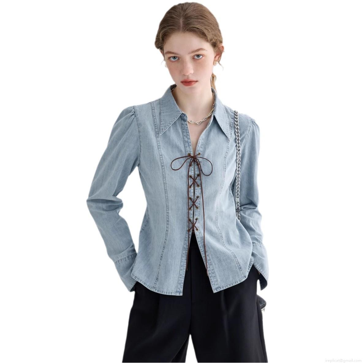 • Women Sexy Lace-up Denim Shirt Jacket Slim Fit V-neck Long Puff Sleeve Washed Light Blue Streetwear Blouse For Women Party Dating Casual Wear