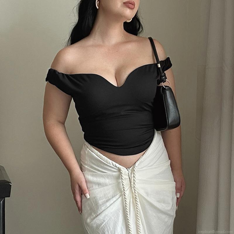 • Women Sexy Off Shoulder Crop Top V Neck Curved Hem Slim Fit Polyester Spandex Short Sleeve Summer Clubwear Streetwear Solid Black Tee