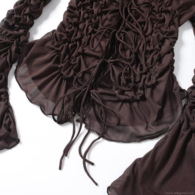 Women Sexy Sheer Mesh V Neck Top Ruched Drawstring Long Flare Sleeve T-Shirt Lace Trim Slim Fit Autumn Party Bodycon Clubwear Top