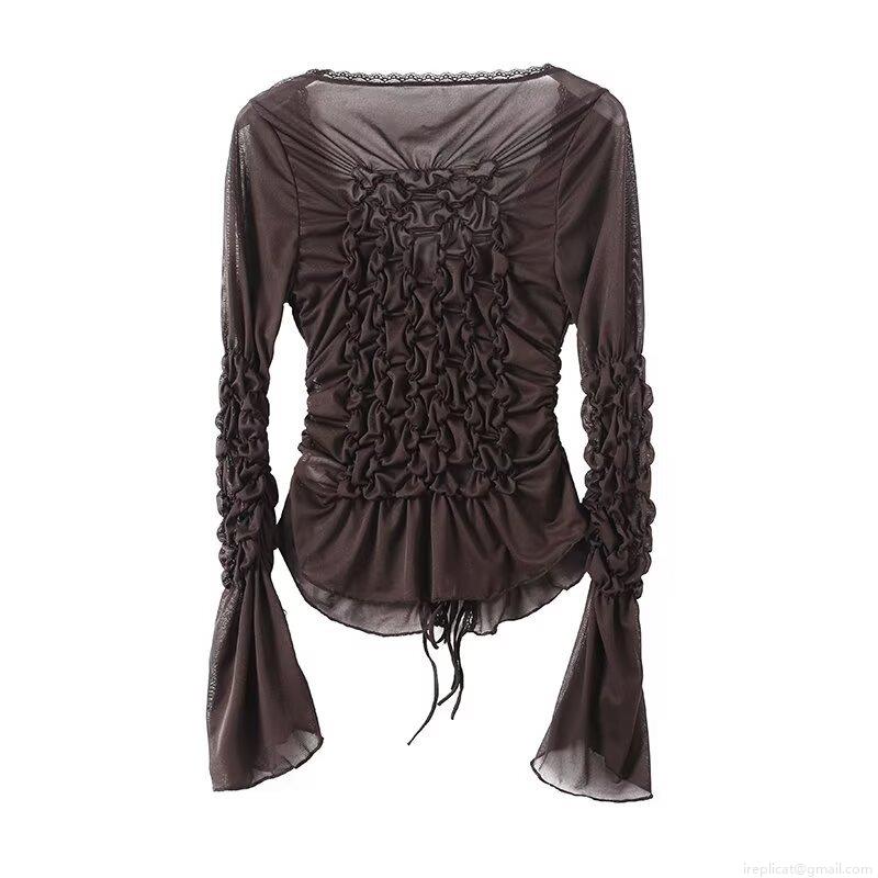 • Women Sexy Sheer Mesh V Neck Top Ruched Drawstring Long Flare Sleeve T-Shirt Lace Trim Slim Fit Autumn Party Bodycon Clubwear Top