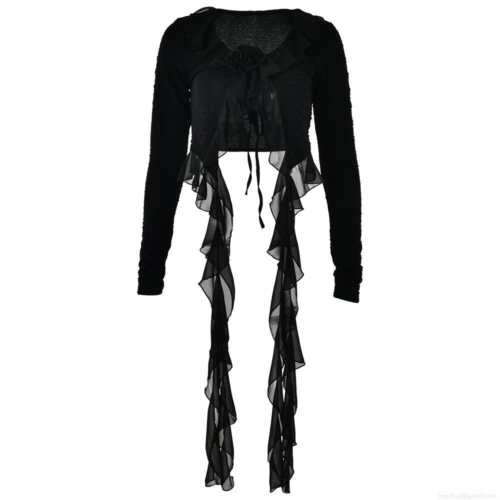 • Women Sexy V Neck Lace Up Long Sleeve T-Shirt Polyester Chiffon Spliced 3D Flower Ruffle Slim Fit Short Cardigan Top Streetwear