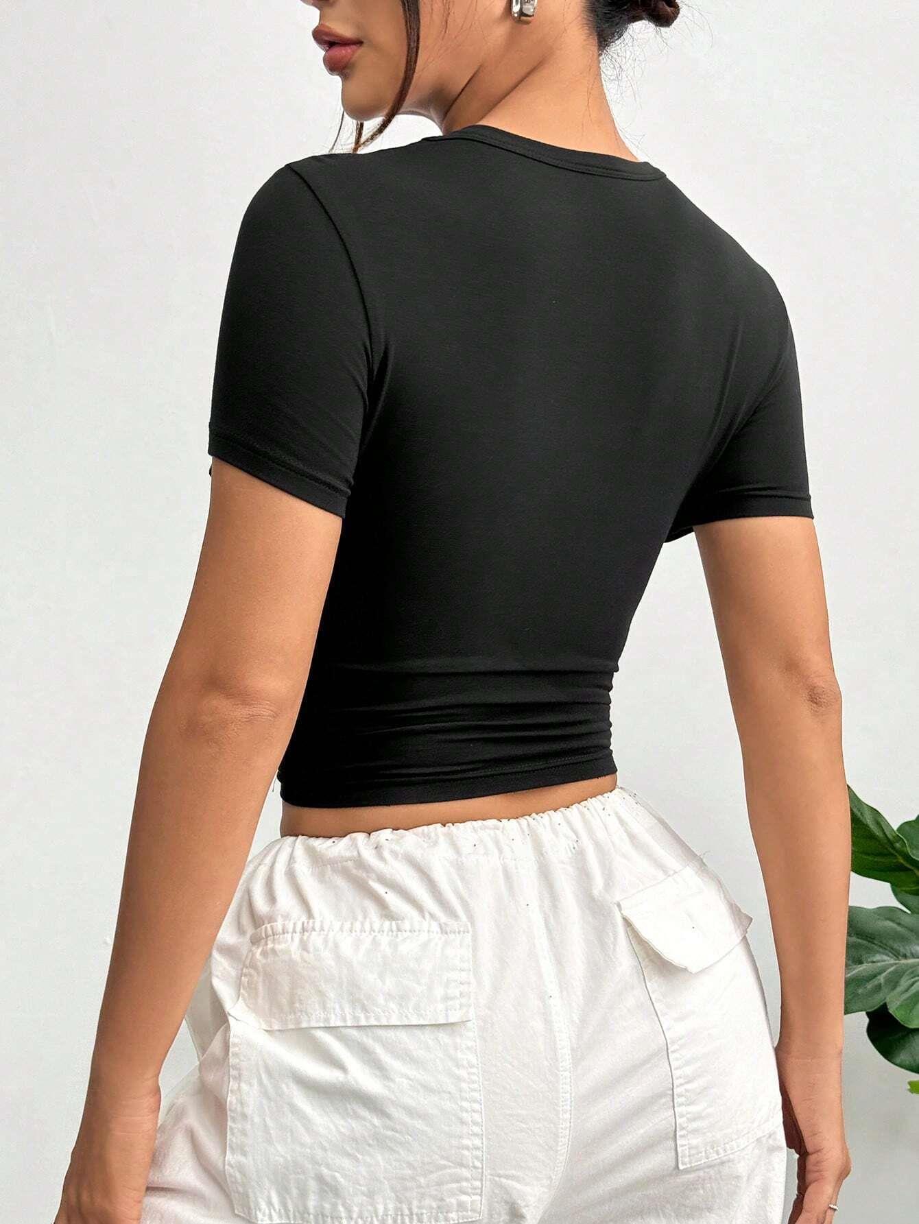 • Women Sexy Y2K Hollow Out Crop Top Viscose Elastane Slim Fit Short Sleeve T-Shirt Solid Black Cut Out Streetwear Summer Casual Tee For Women