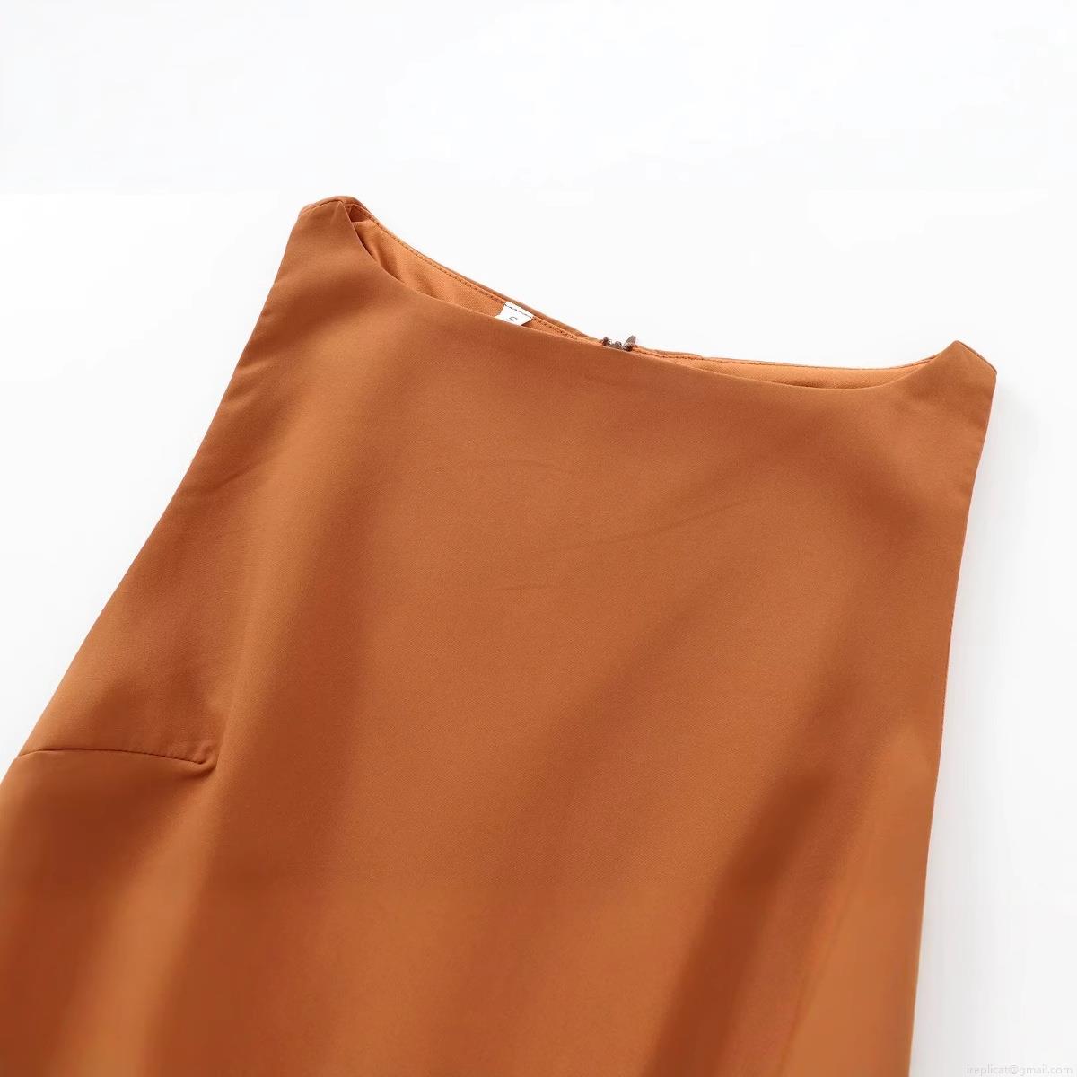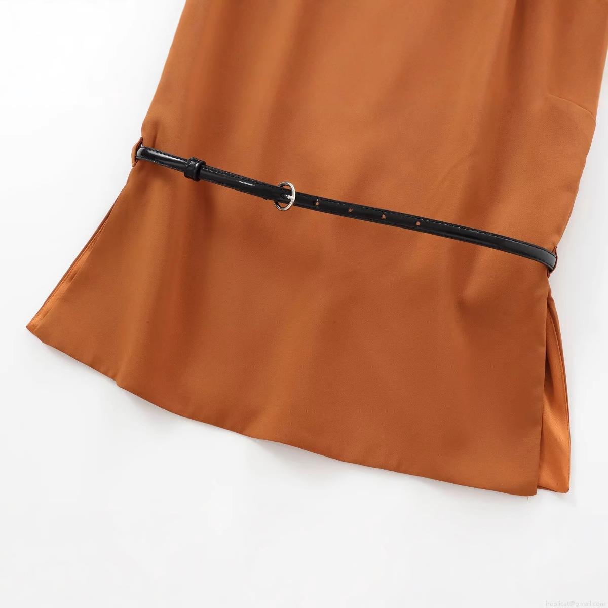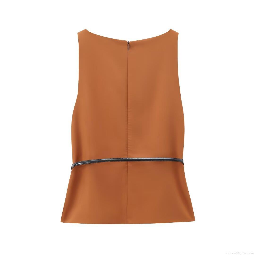 • Women Sleeveless Tank Top Caramel Polyester Slim Fit Round Neck Elegant Blouse With Belt For Summer Daily Date Wear Chic Women Tops