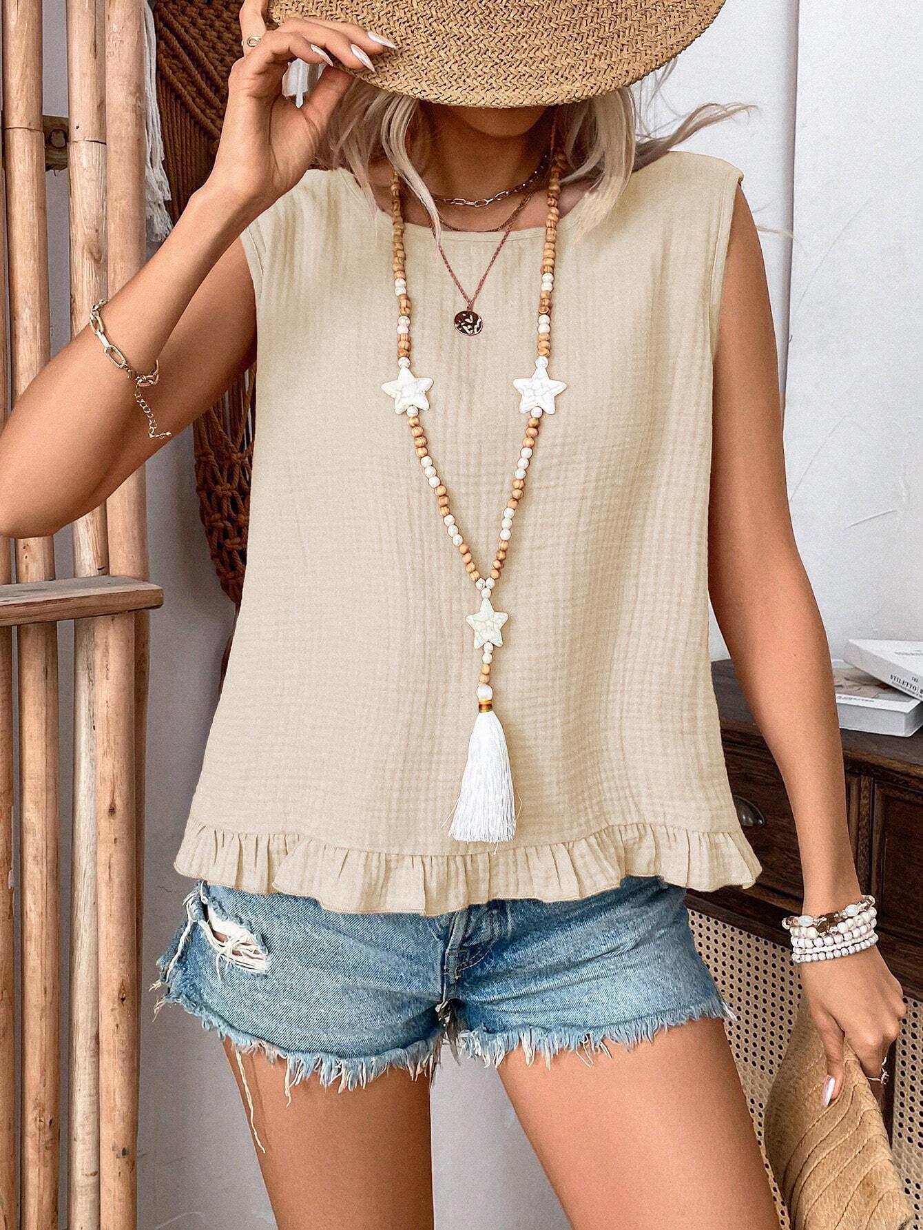 Women's 100% Cotton Ruffle Sleeveless Top Summer Casual Open Back Peplum Tank Top Wrinkled Texture Bohemian Pastoral Style For Beach