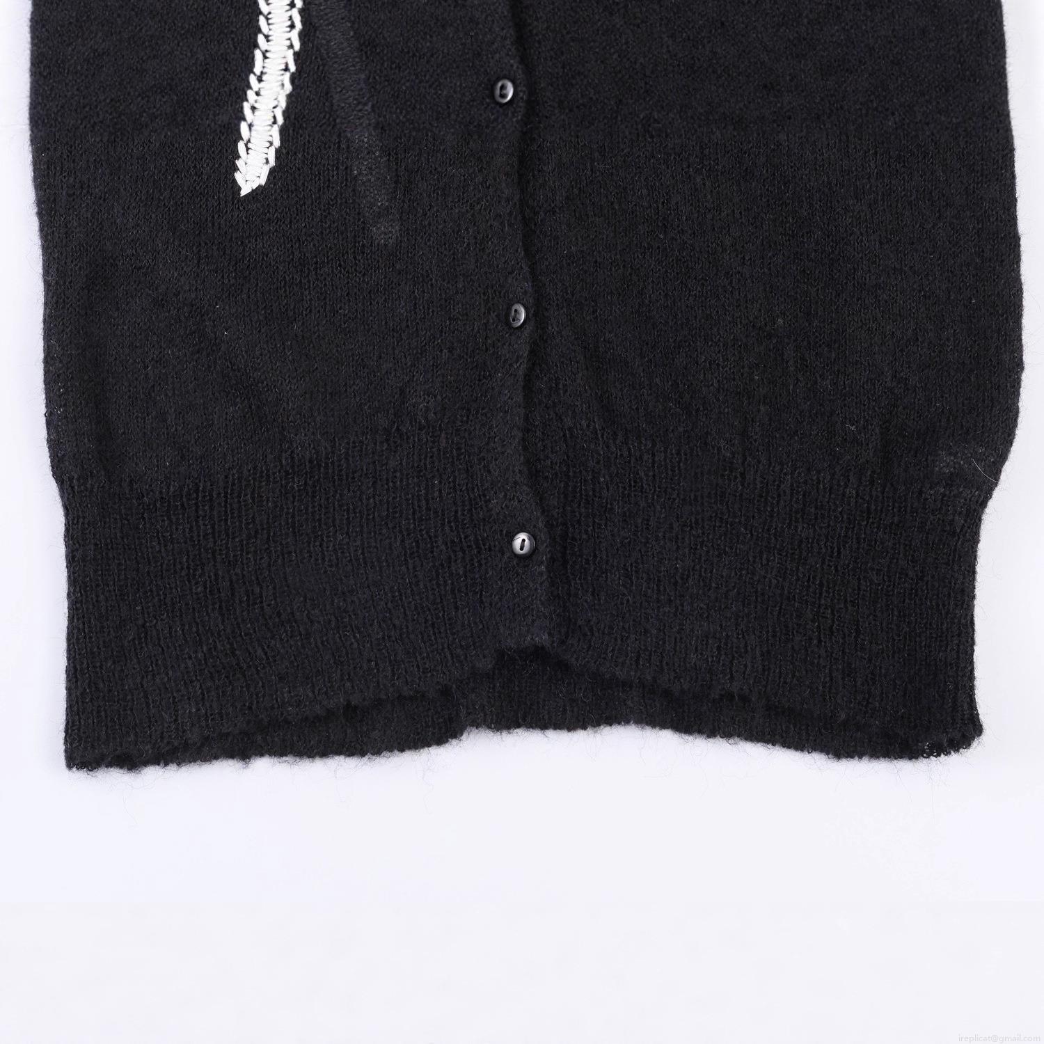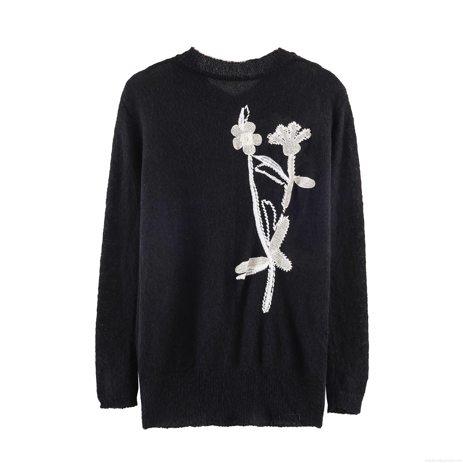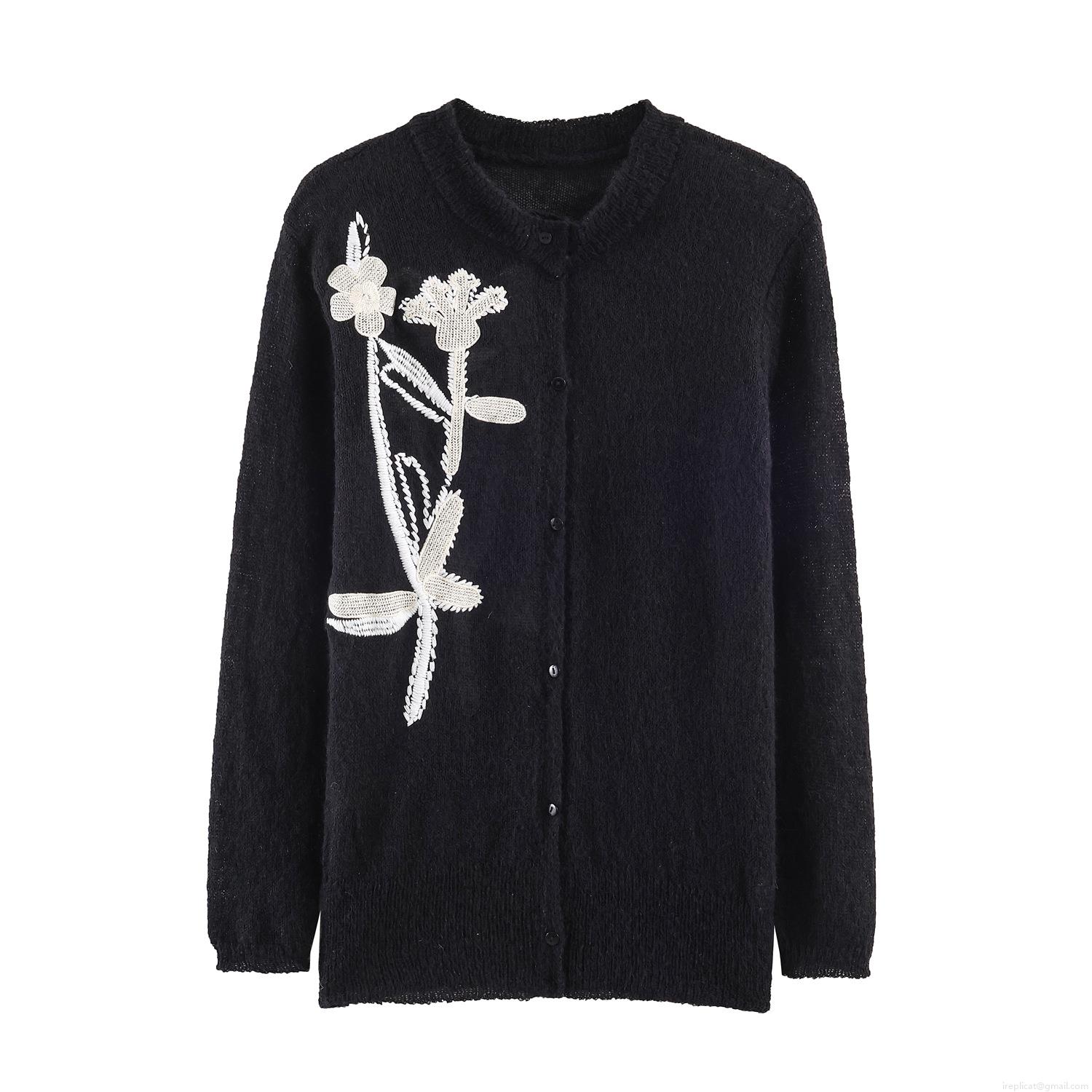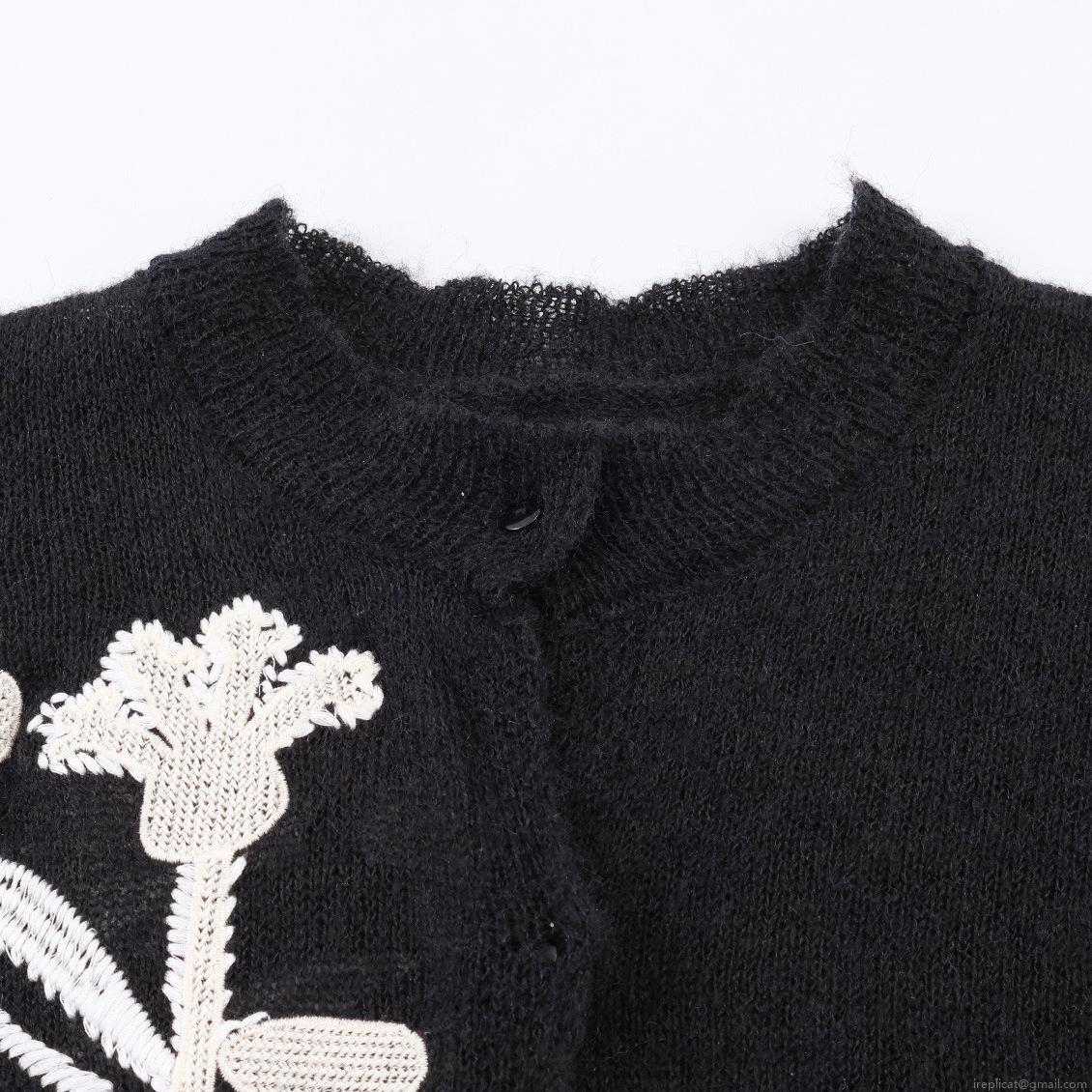 Women's Black Knit Cardigan Sweater With White Flower Embroidery Crew Neck Long Sleeve Button Up Casual Street Style Autumn Winter Knitwear Coat