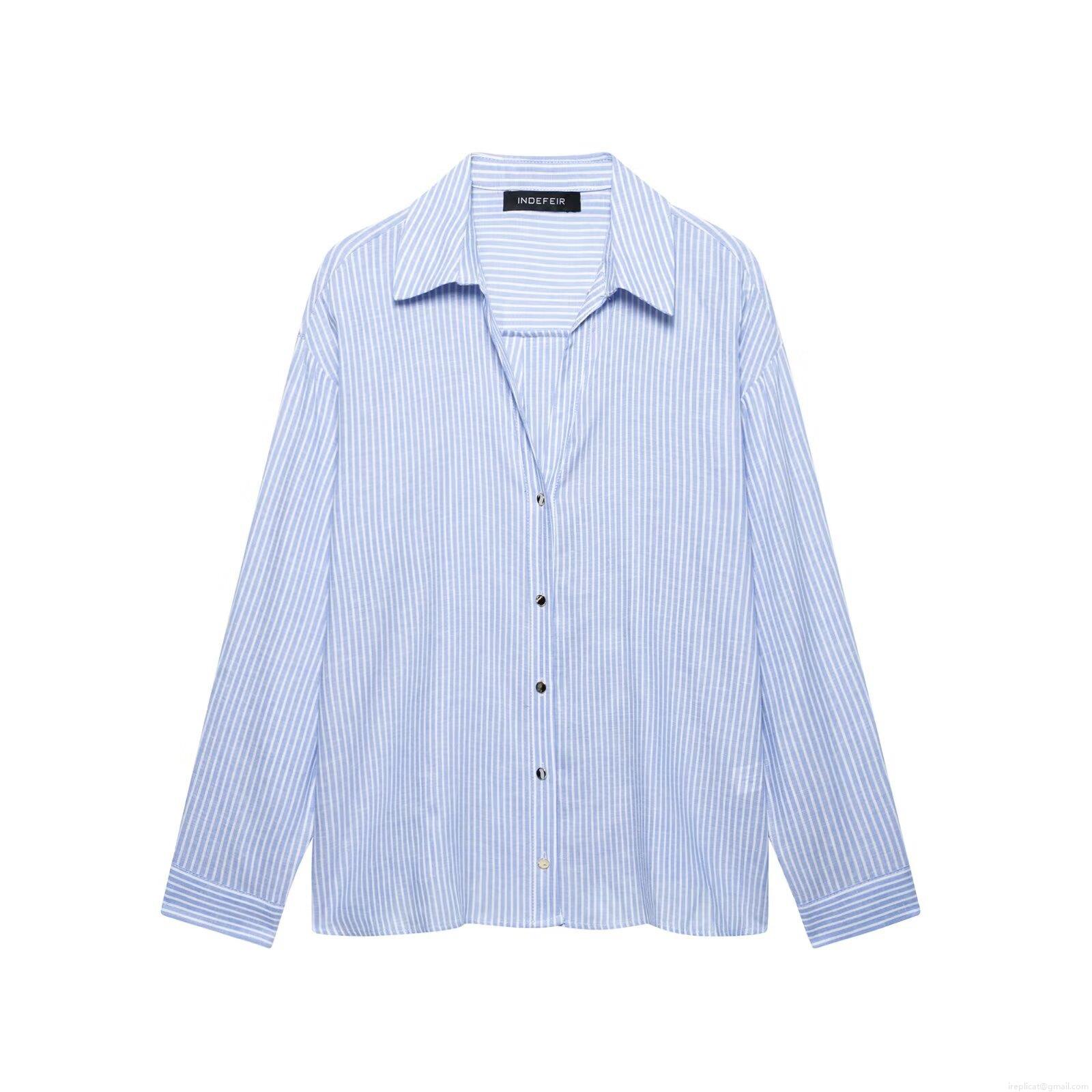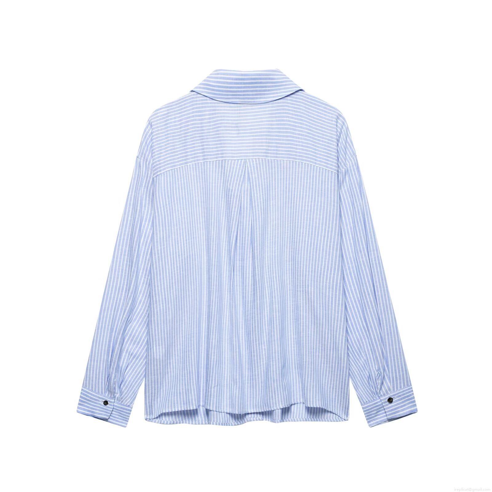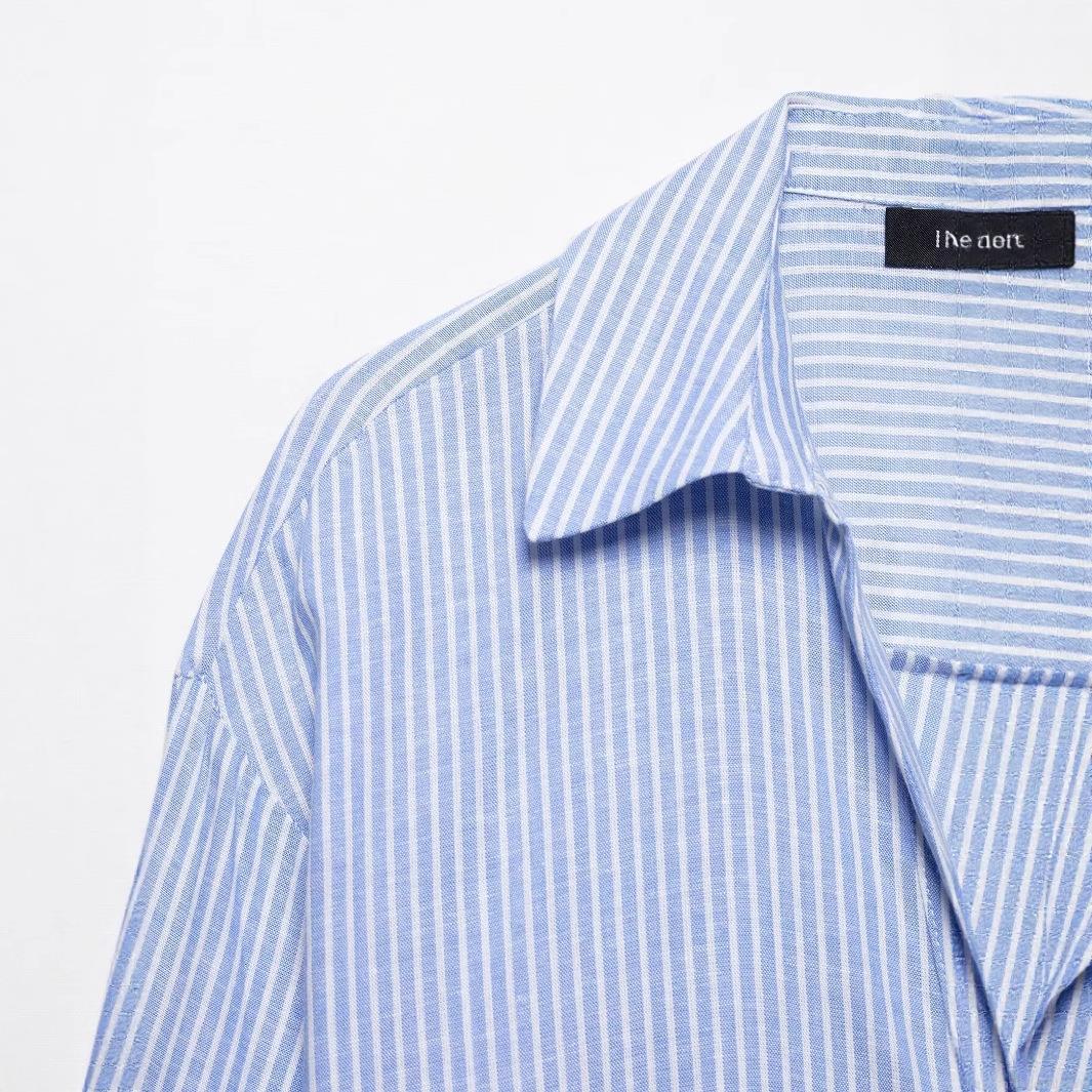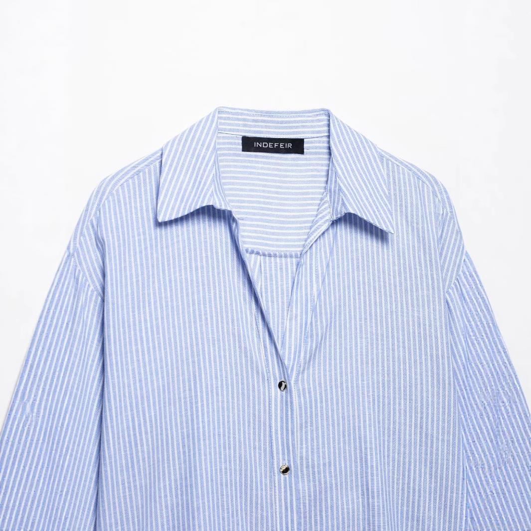 • Women's Casual Blue White Vertical Striped Long Sleeve Shirt Linen Blend Button Up Loose Blouse Top For Work Office Daily Wear