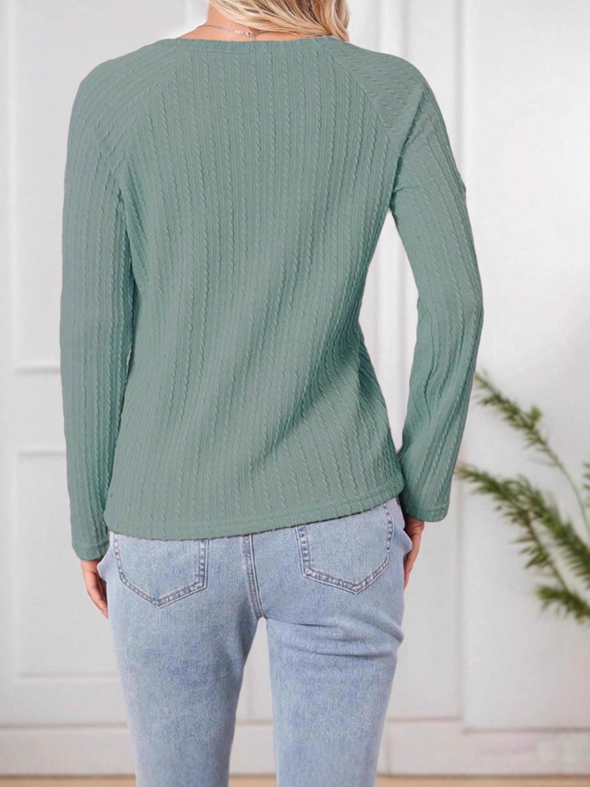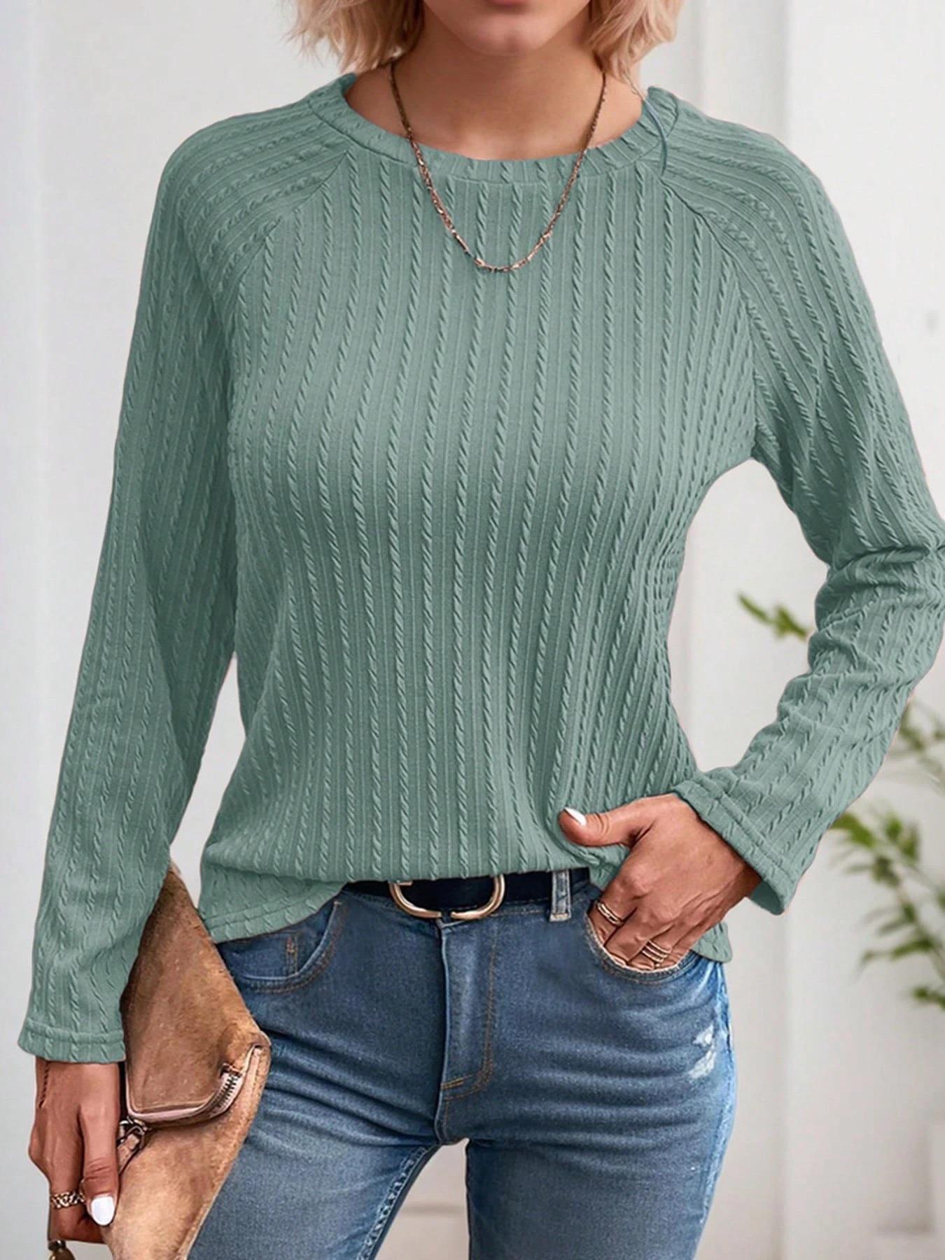 • Women's Casual Long Sleeve Knit T-Shirt Sage Green Round Neck Ribbed Texture Pullover Top Solid Color Autumn Winter Fashion Clothing For Daily Wear