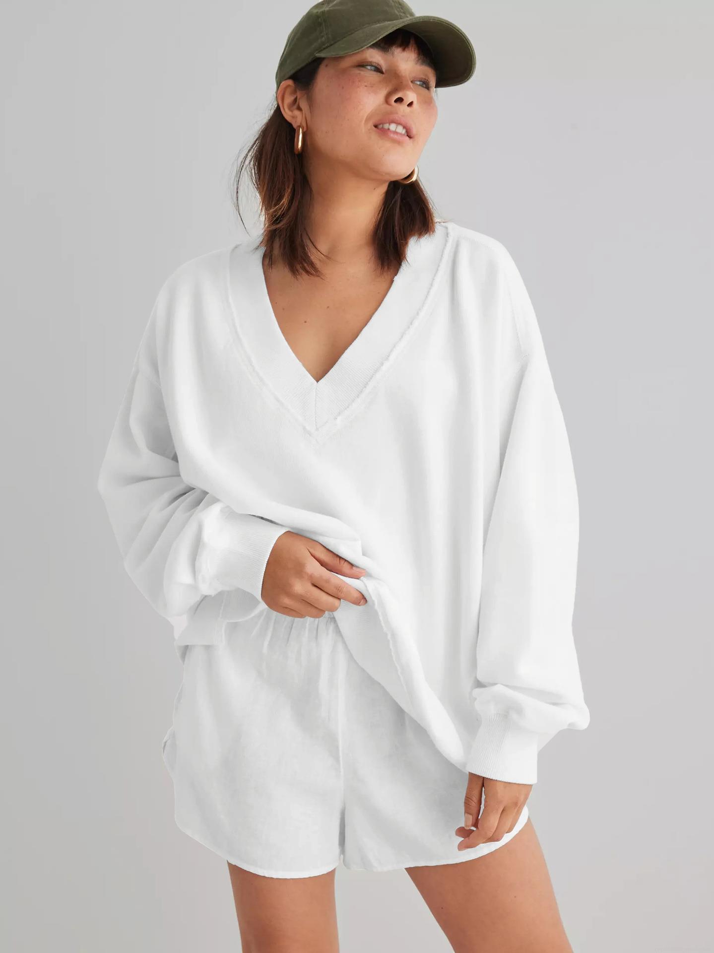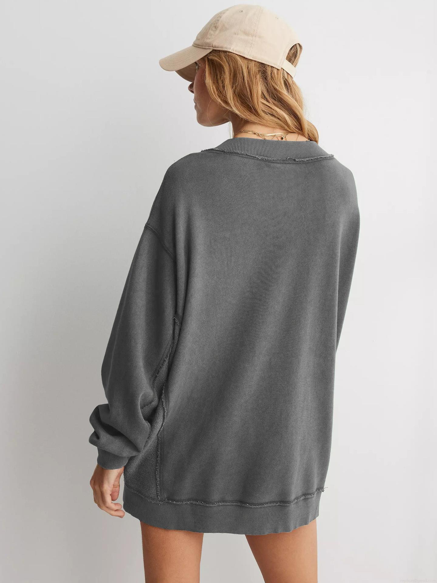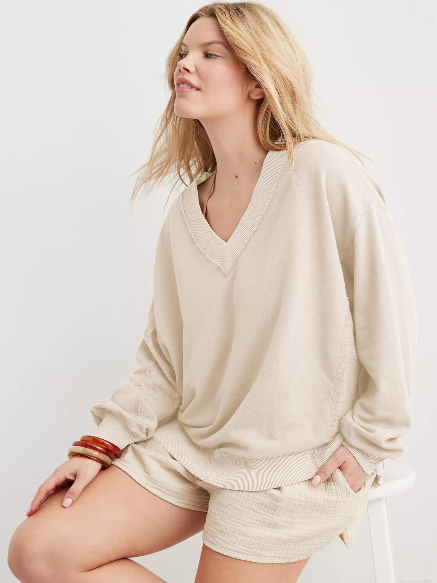 Solid Color, V-neck, Dropped Shoulder Sleeves, Threaded End, Loose Silhouette, Edge Beveling Decoration