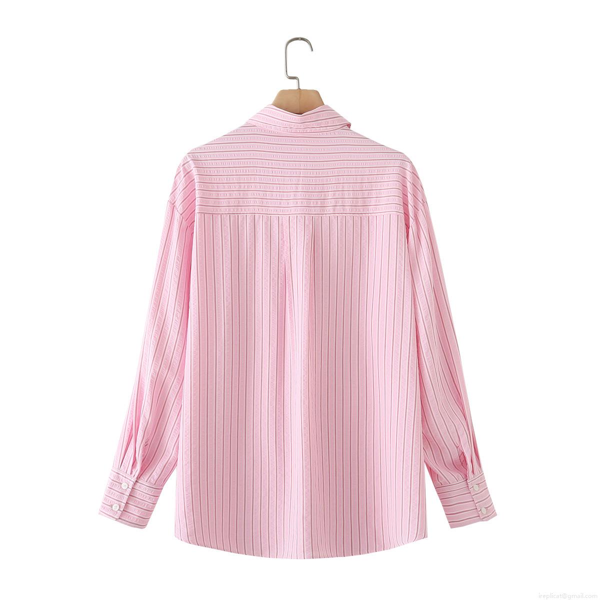 Women's Casual Pink White Striped Seersucker Shirt Loose Fit Long Sleeve Button Down Blouse With Chest Pocket Lapel Top For Spring Autumn Streetwear