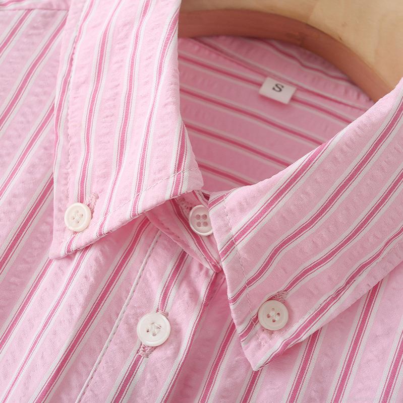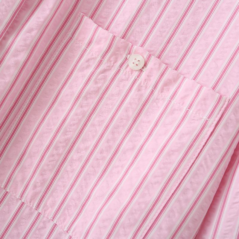 • Women's Casual Pink White Striped Seersucker Shirt Loose Fit Long Sleeve Button Down Blouse With Chest Pocket Lapel Top For Spring Autumn Streetwear