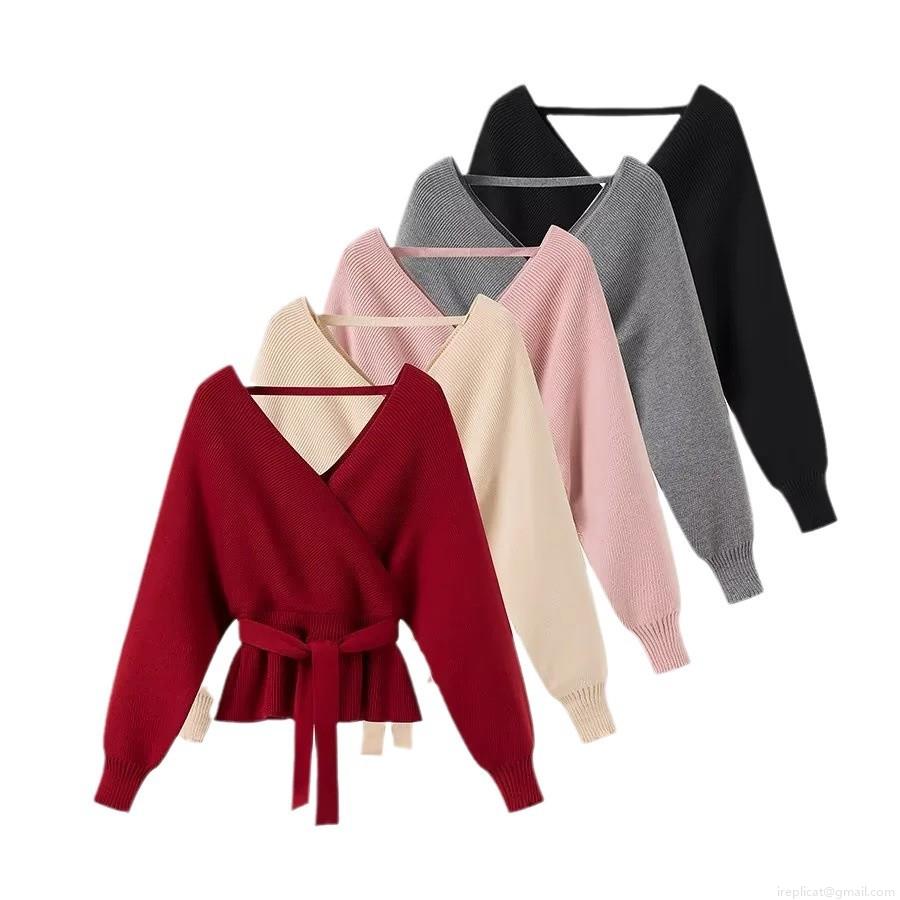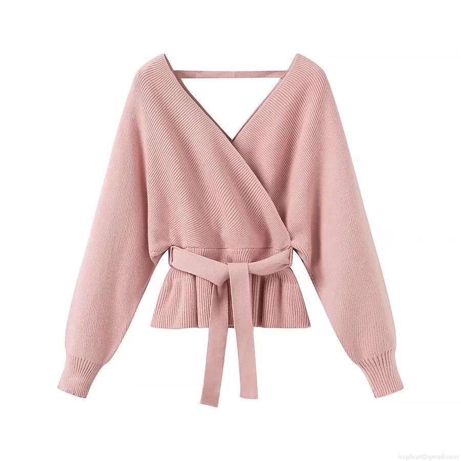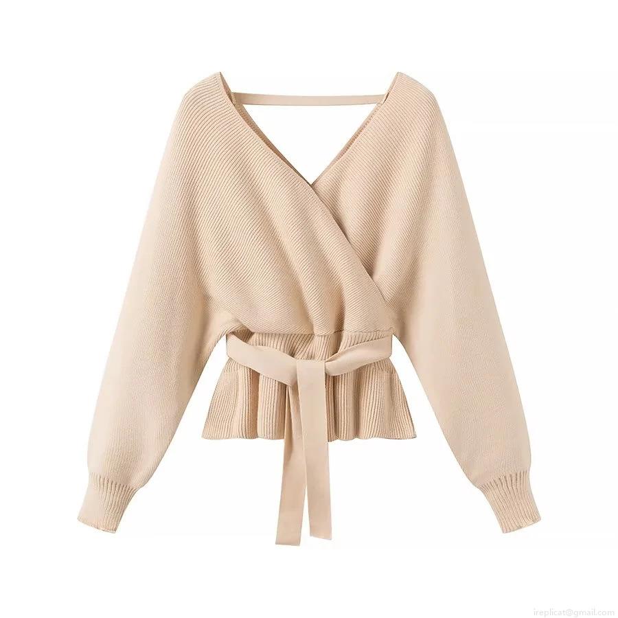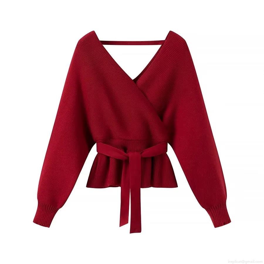 • Women's Chic Wrap V-Neck Knit Sweater Casual Tie-Waist Ribbed Pullover Long Sleeve Peplum Top For Daily Date Party Ladies