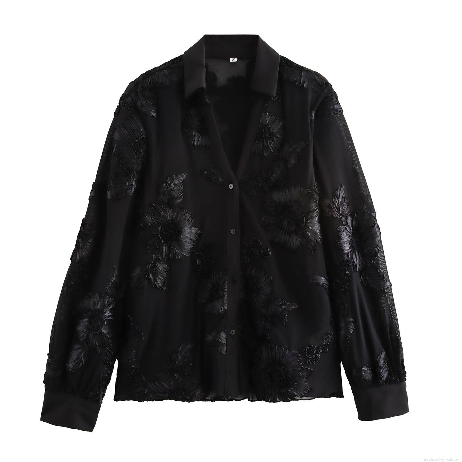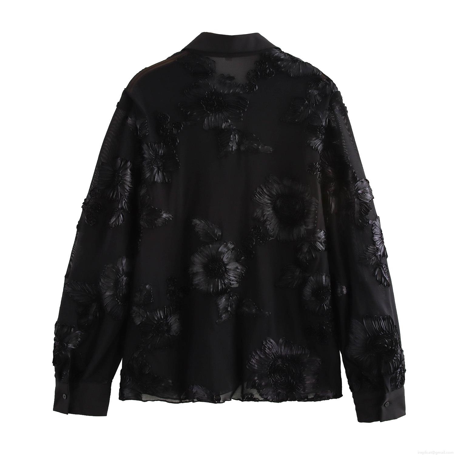• Women's Elegant Mesh Shirt 3D Floral Embroidery V-Neck Long Sleeve Sheer Sexy Blouse Office Lady Commute Autumn Casual Black Top Apparel