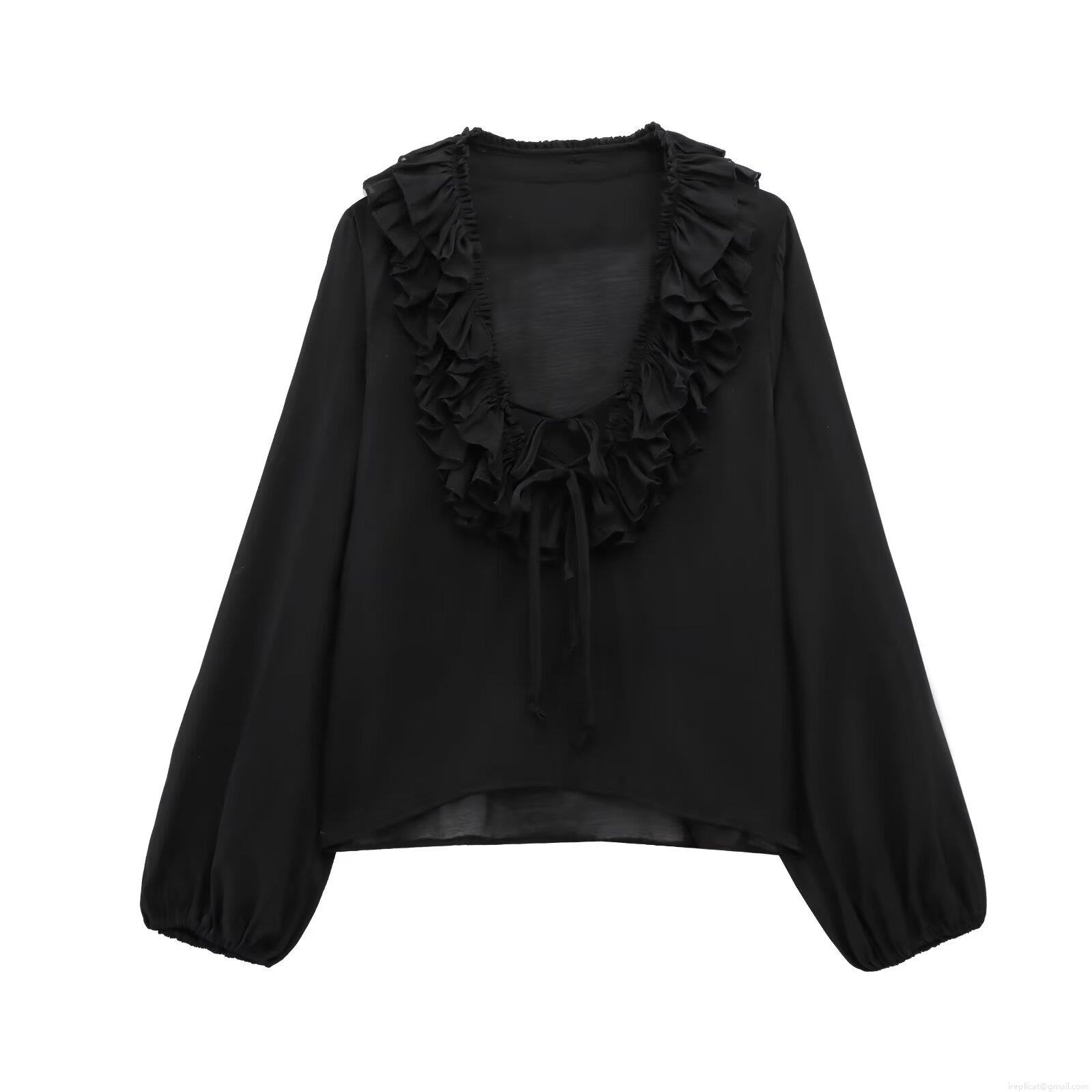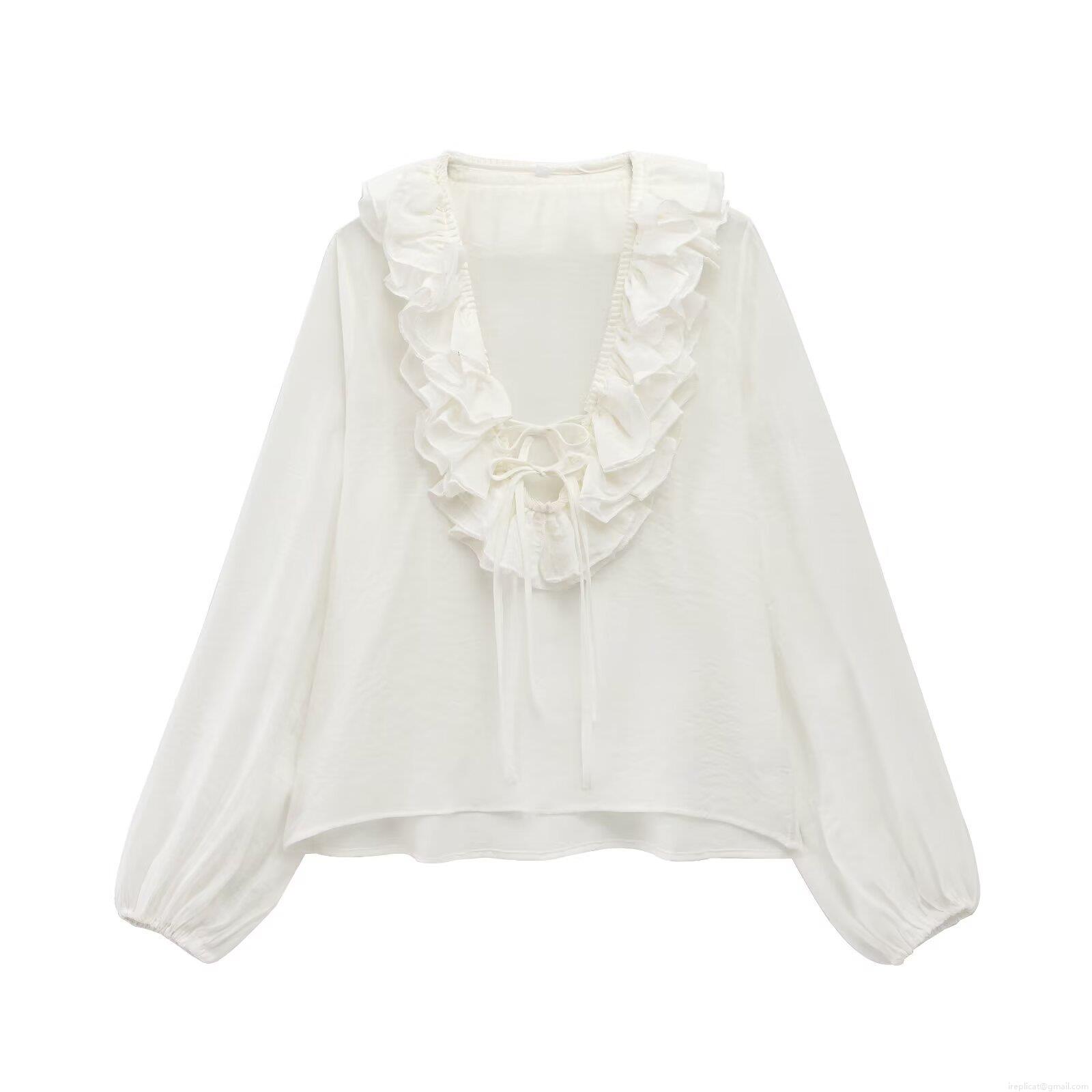 • Women's Elegant Ruffle Blouse Long Sleeve V-Neck Tie-Up Front Solid Color Polyester Shirt For Office Daily Casual Party Fashion Tops
