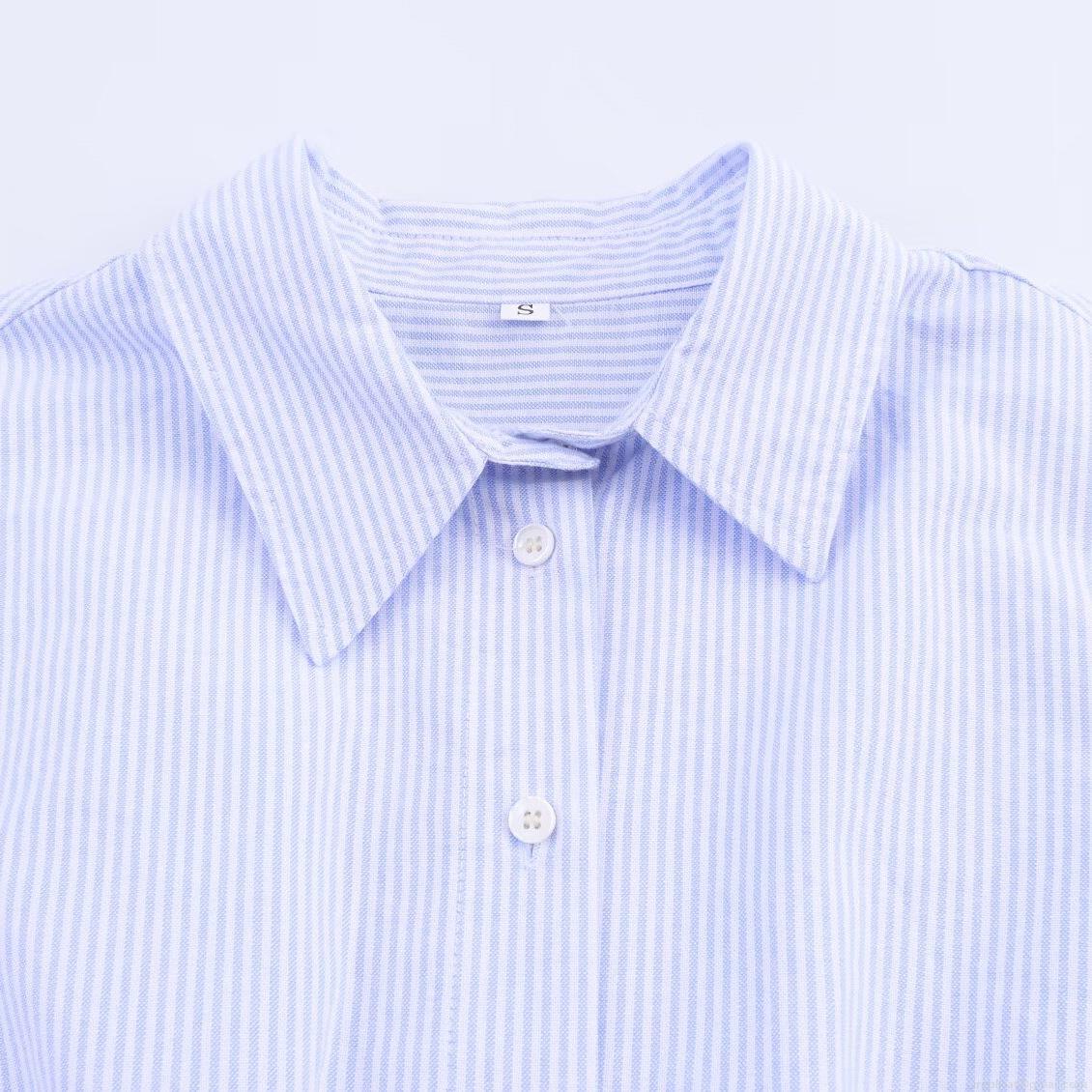 Women's Fashion Striped Long Sleeve Shirt With Pleated Waist Button Down Lapel Collar Casual Office Blouse Polyester Top For Women