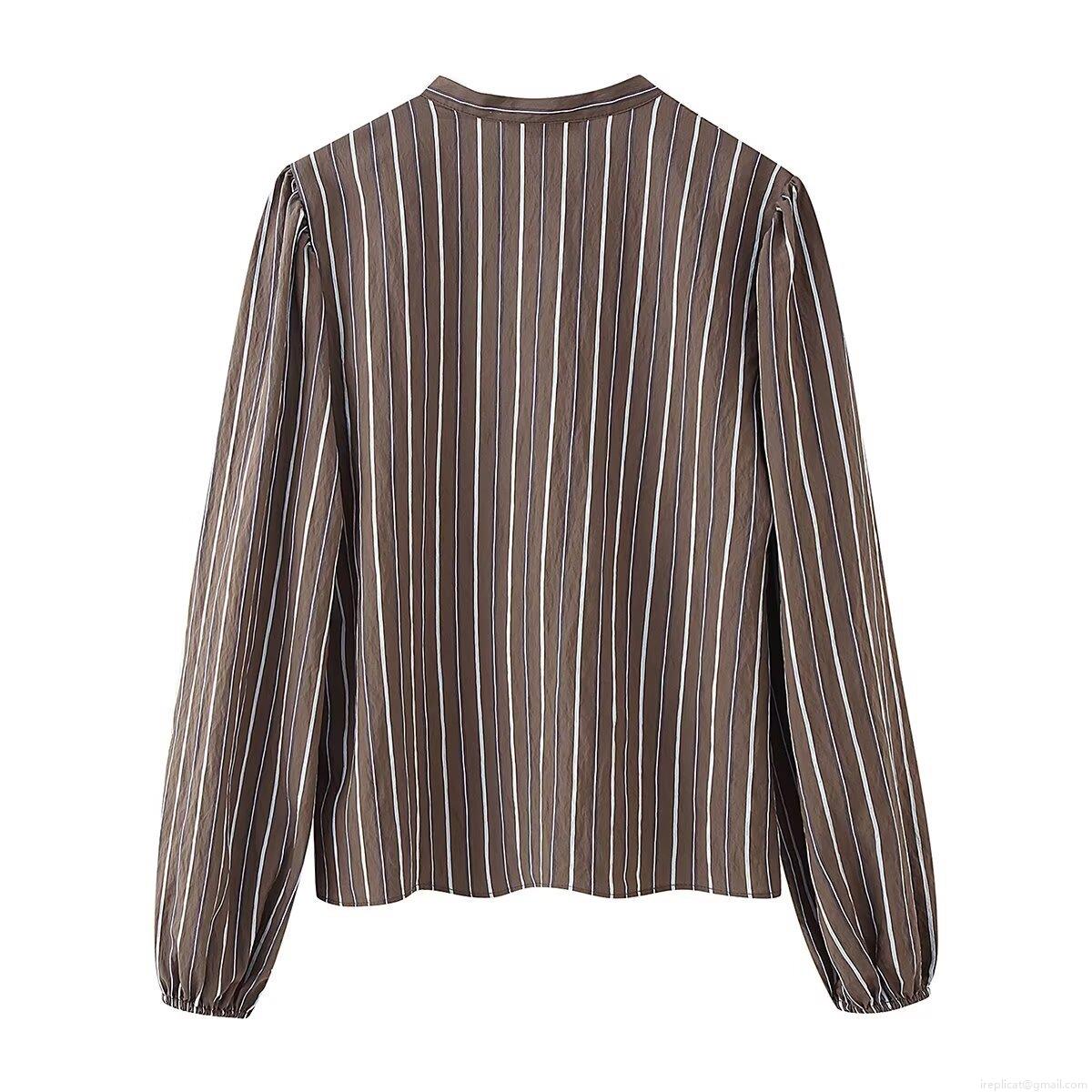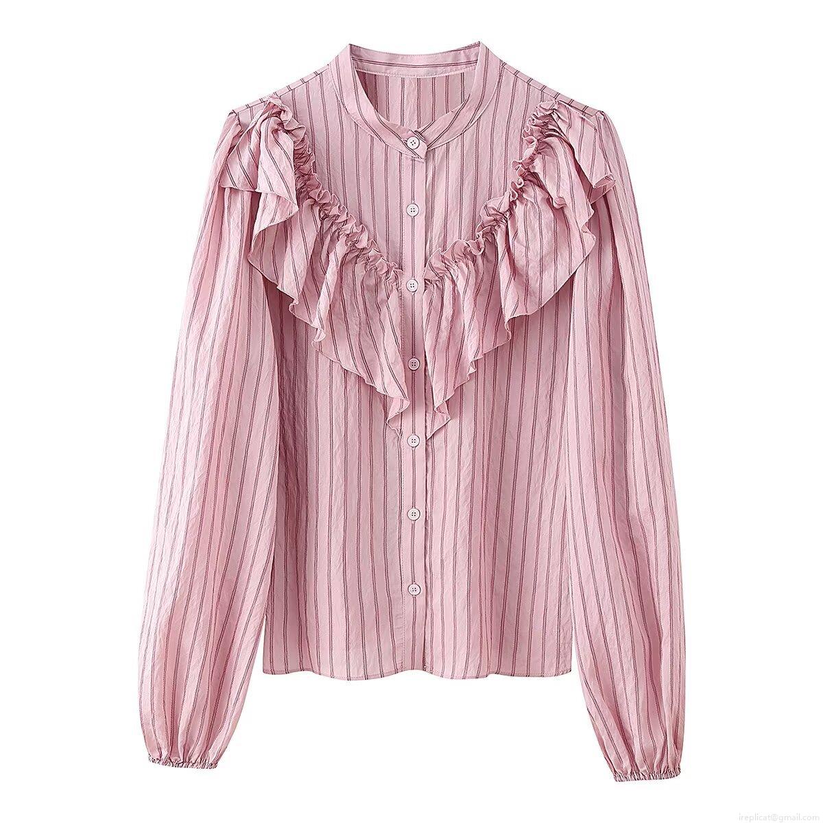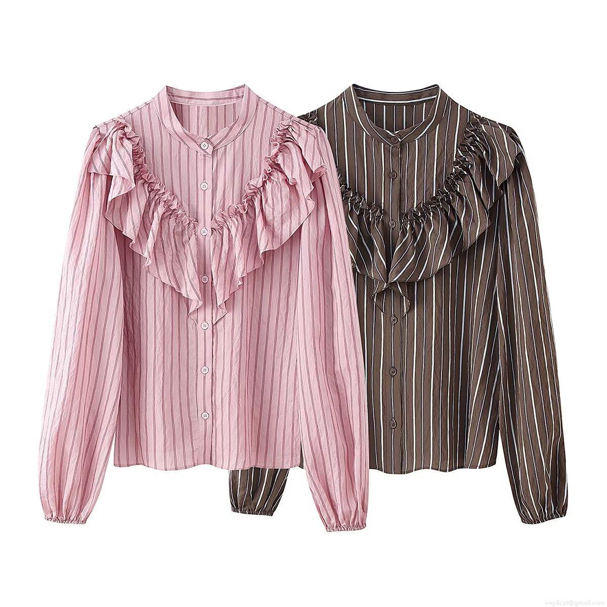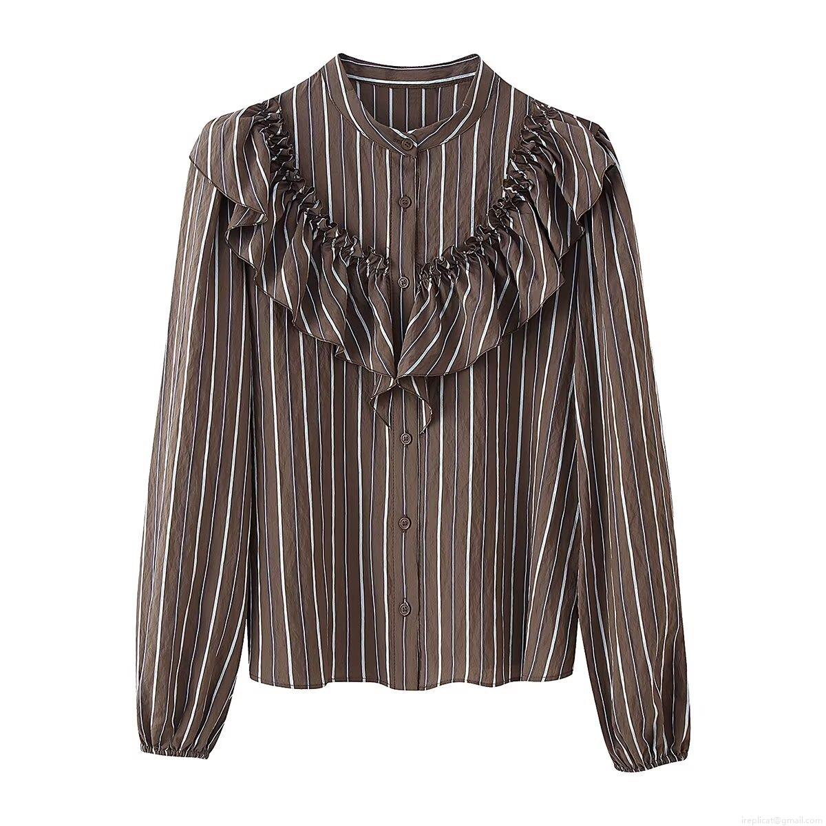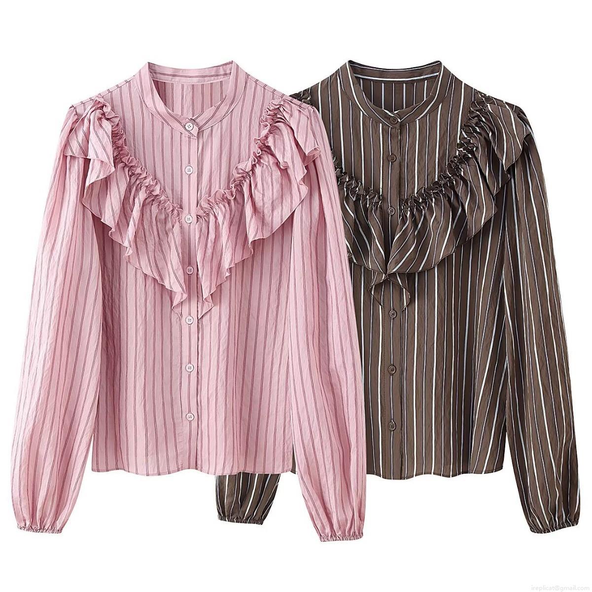Women's Fashion Vertical Stripe Ruffle Blouse Vintage Long Sleeve Button Down Shirt Casual Office Lady Sweet Polyester Tops