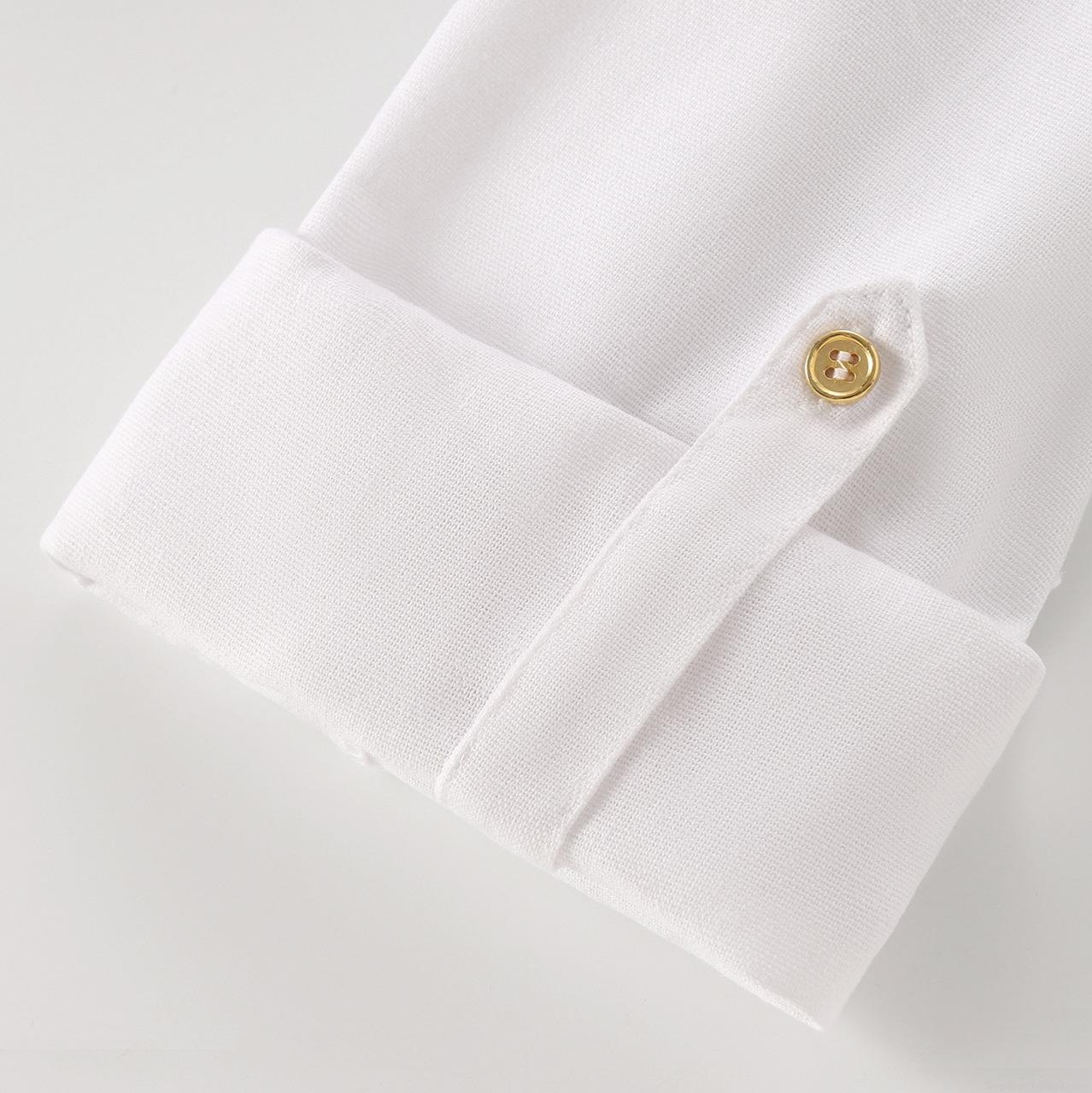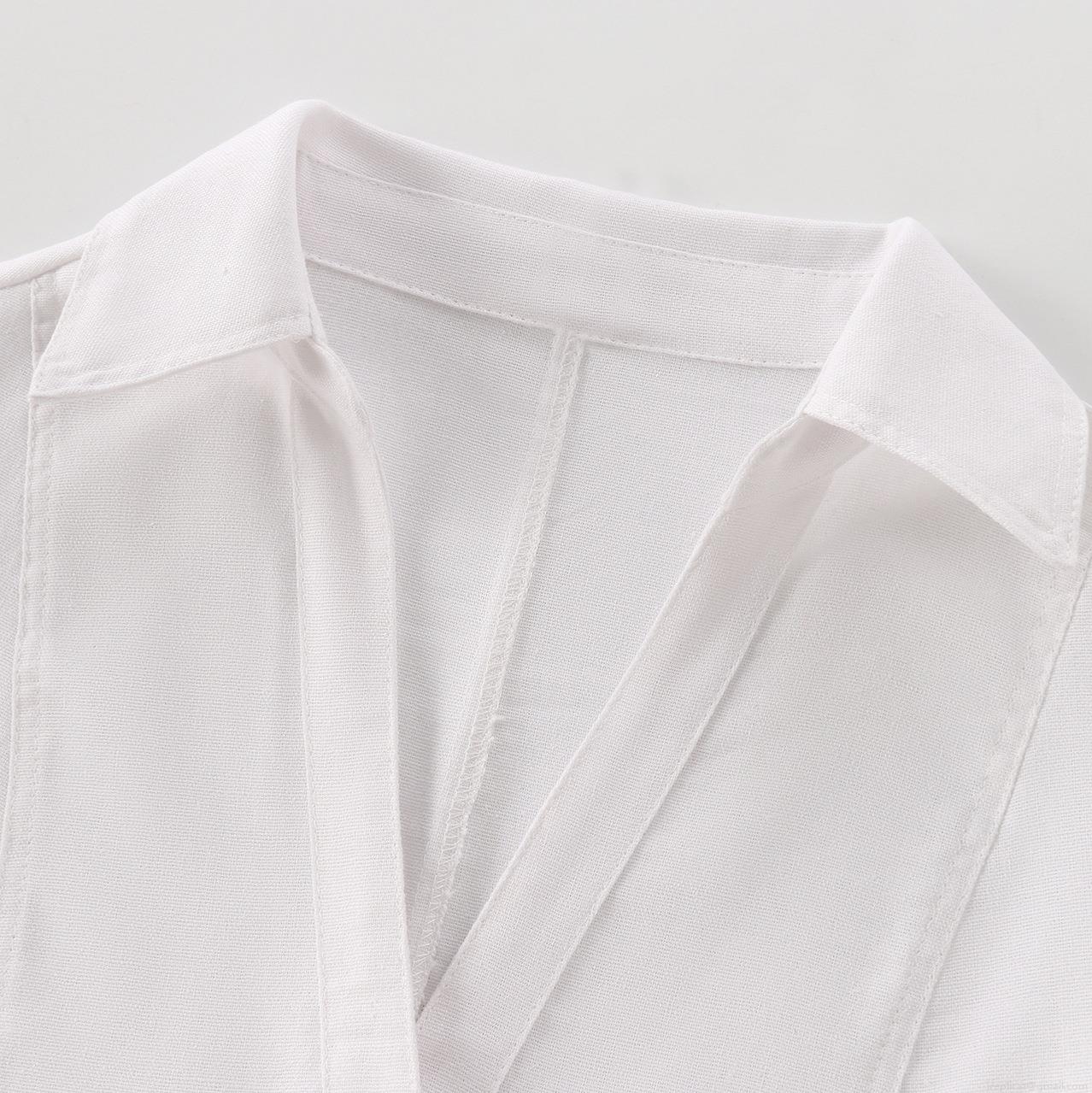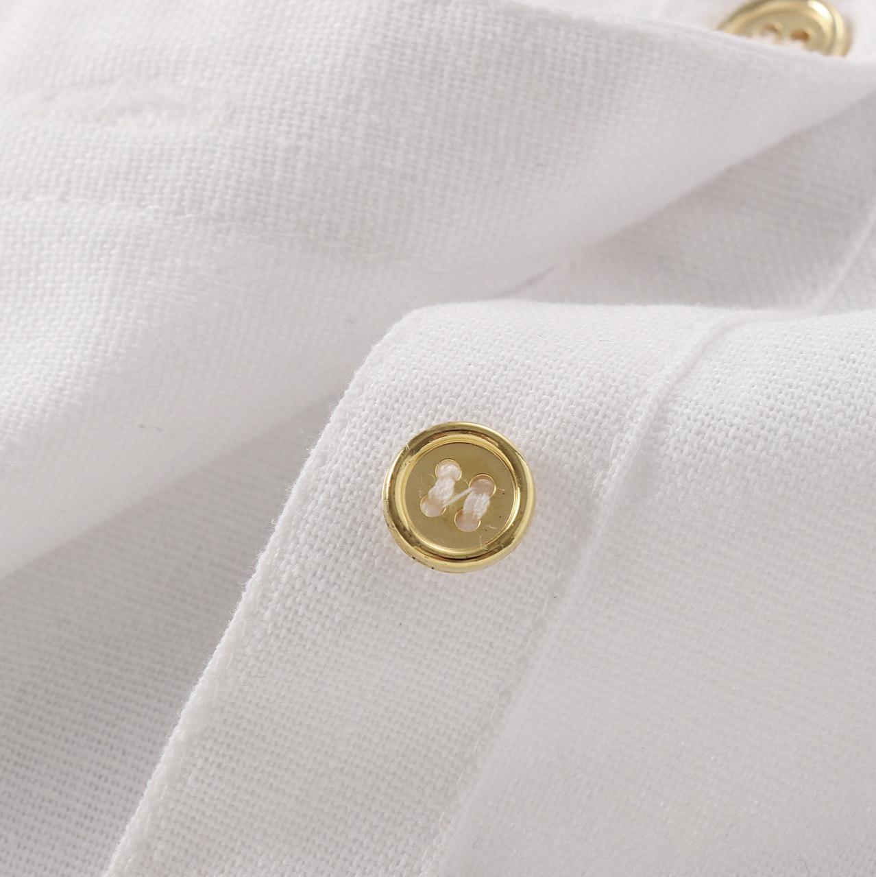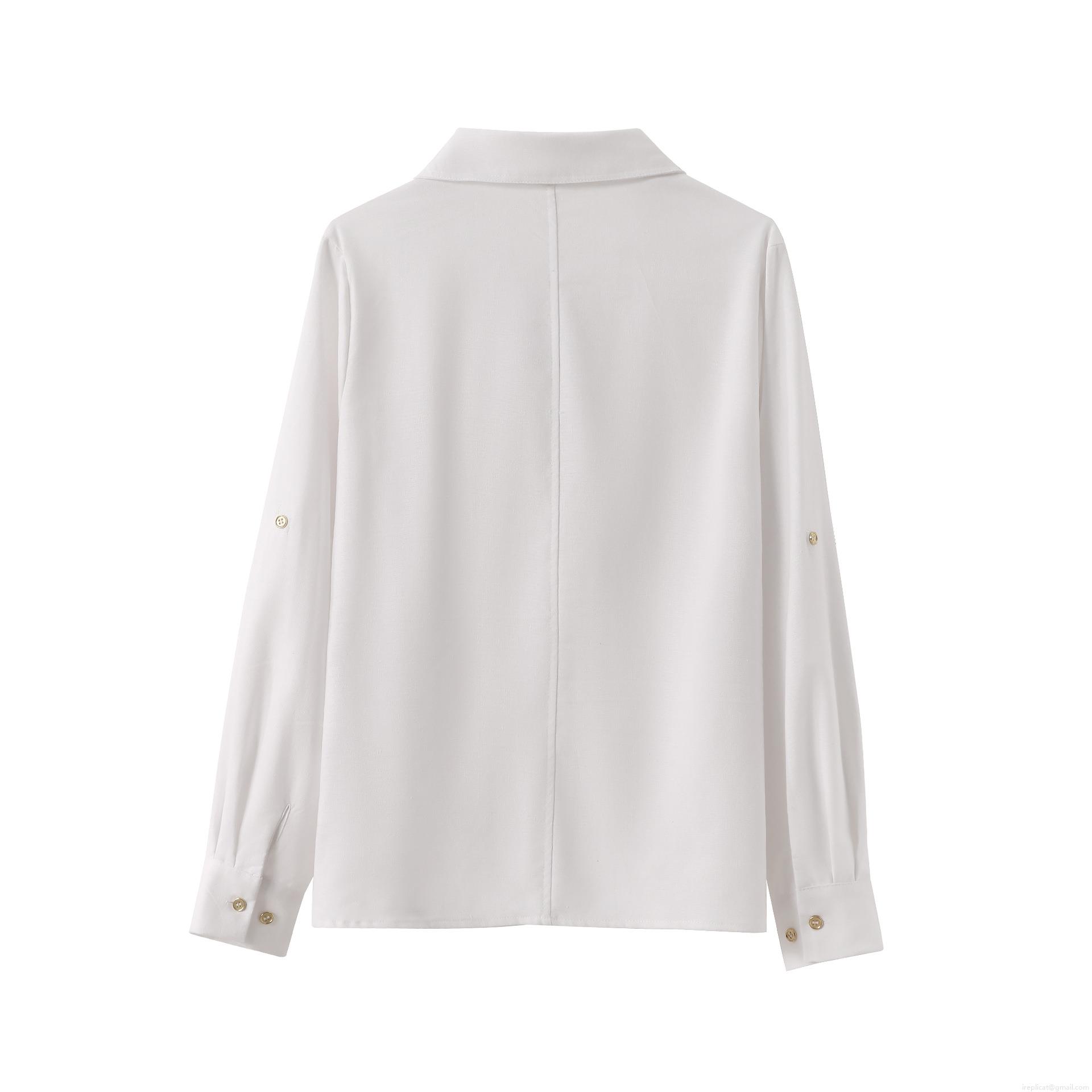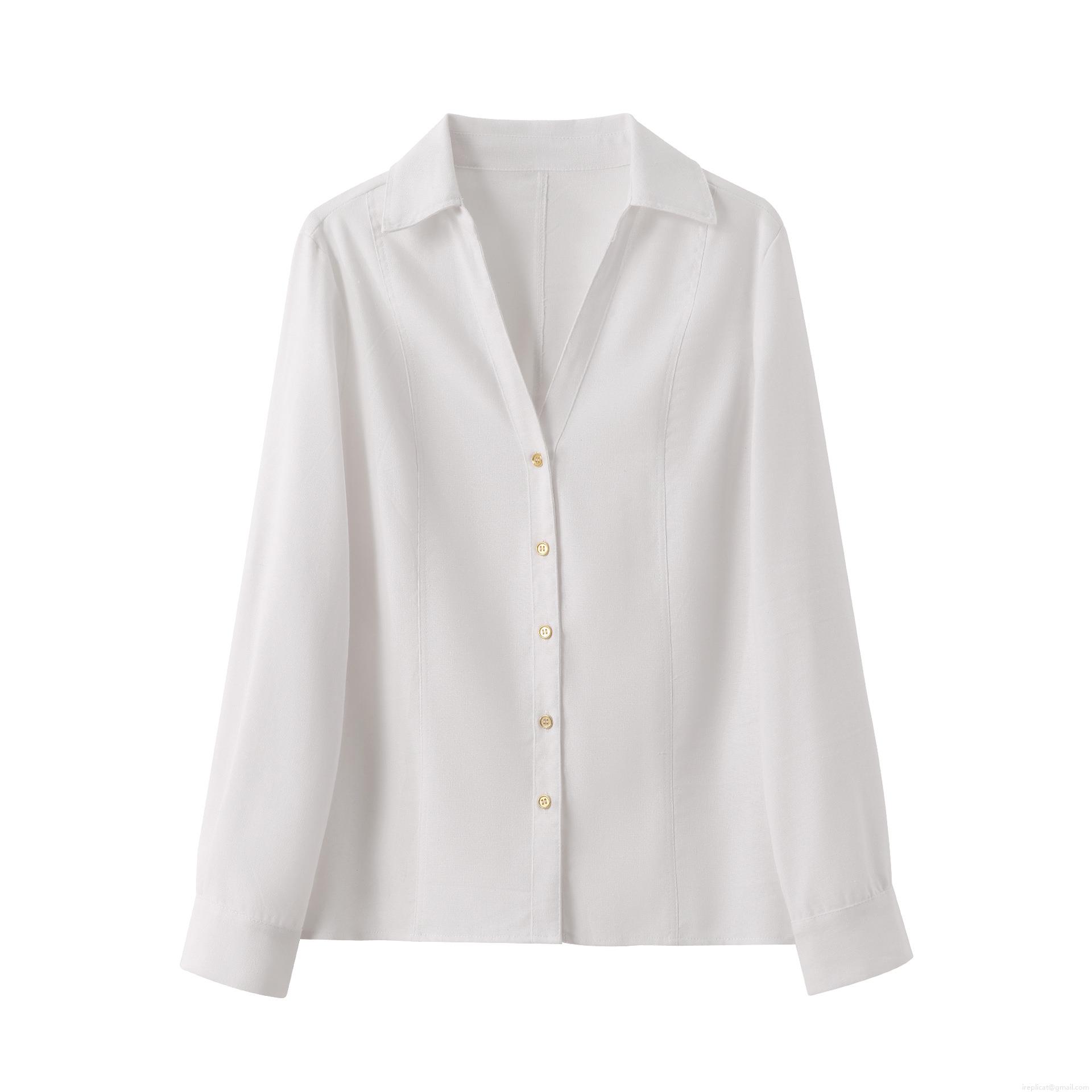 • Women's Fashion White V Neck Shirt Elegant Linen Blend Long Sleeve Blouse With Gold Buttons Casual Rolled Sleeve Top For Office Commute Ladies Clothing