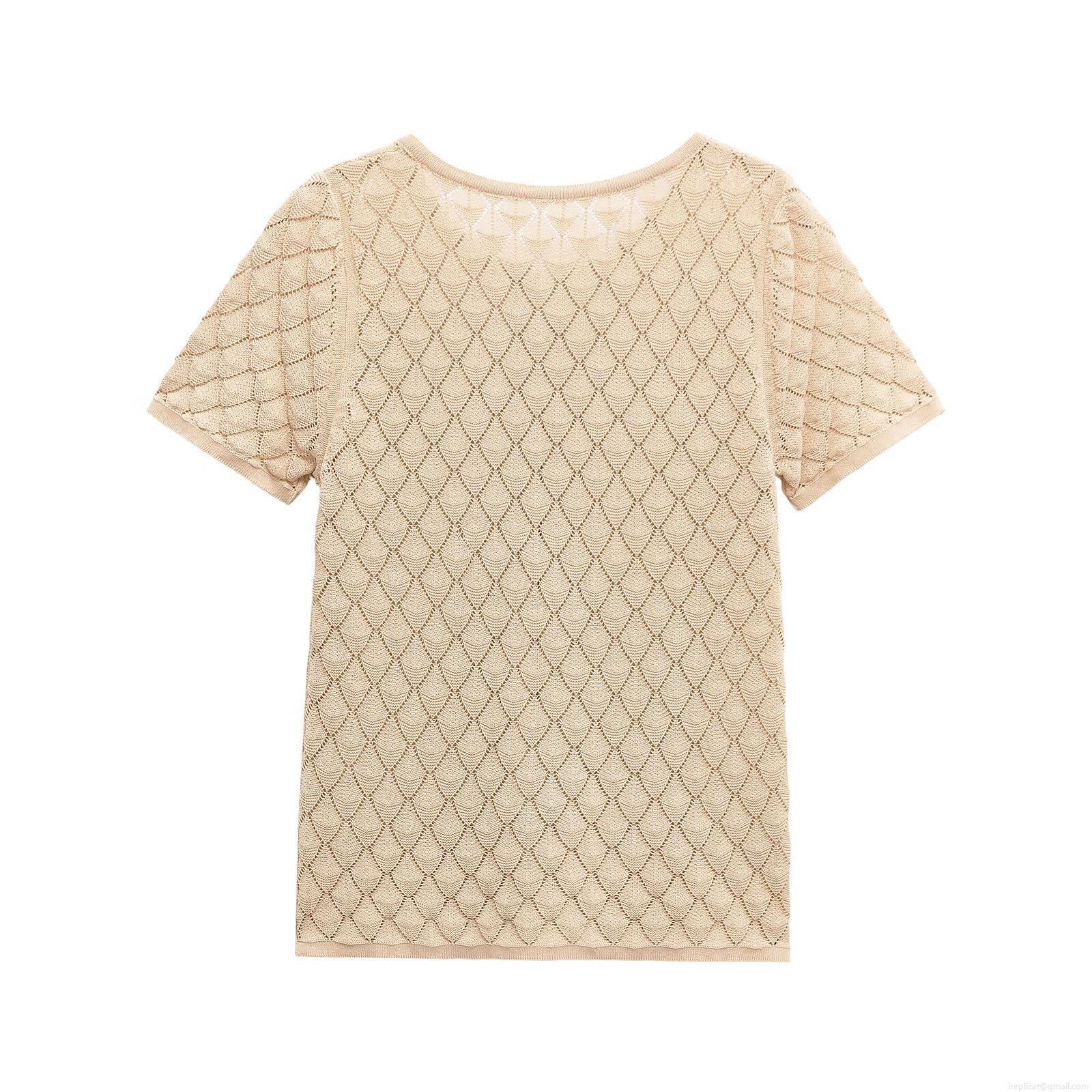 • Women's Hollow Out Knit T-Shirt Short Sleeve Round Neck Crochet Cardigan Solid Color Beige Spandex Polyester Summer Casual Fashion Tops For Ladies