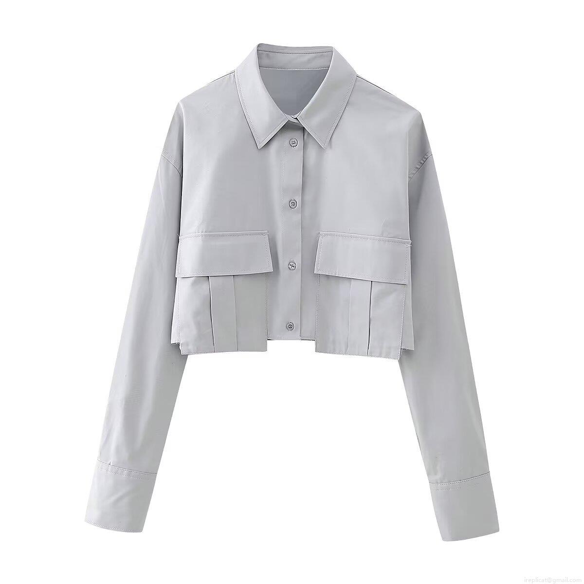 • Women's Long Sleeve Crop Shirt 100% Polyester Workwear Cargo Style Blouse with Double Flap Pockets Single Breasted Streetwear Top for Ladies