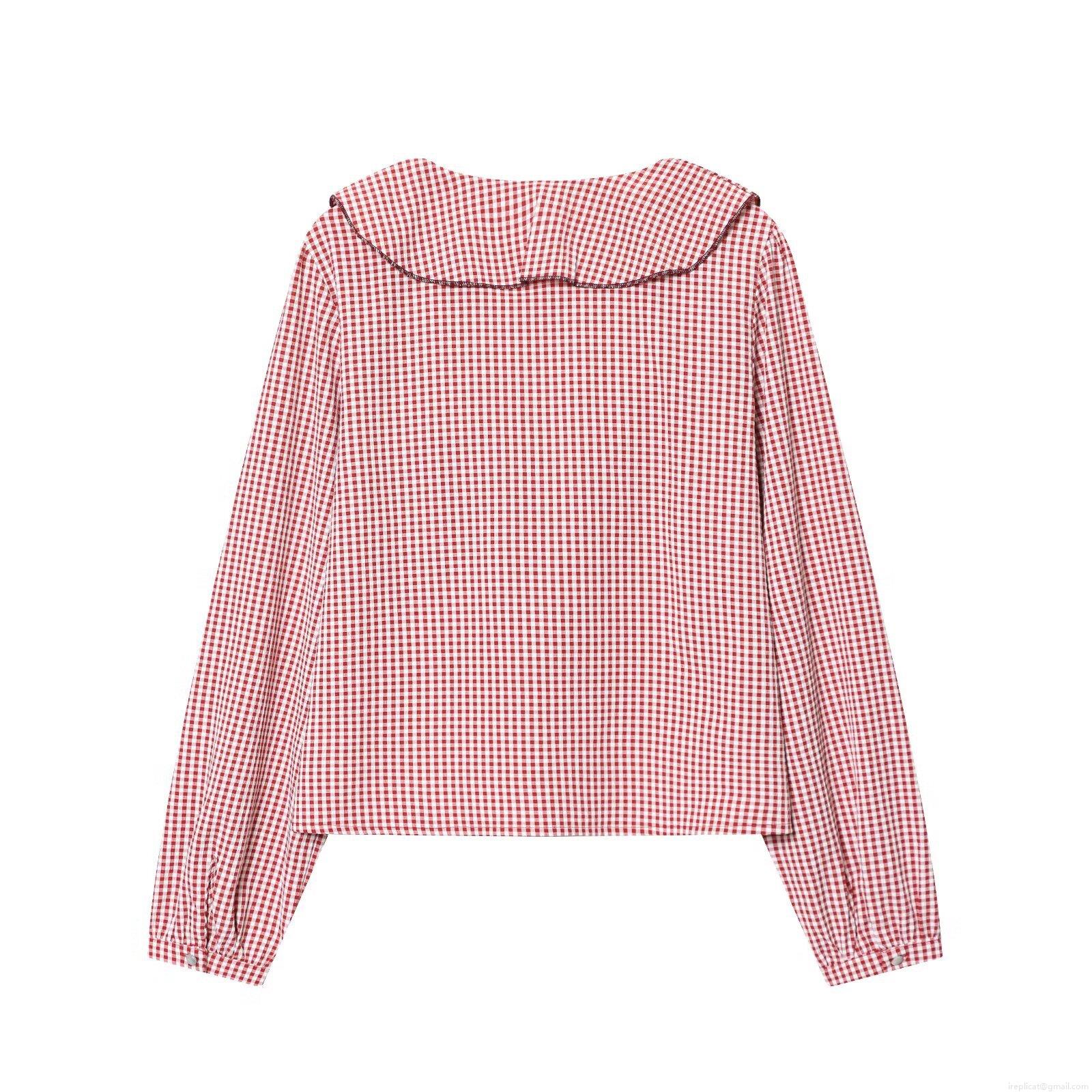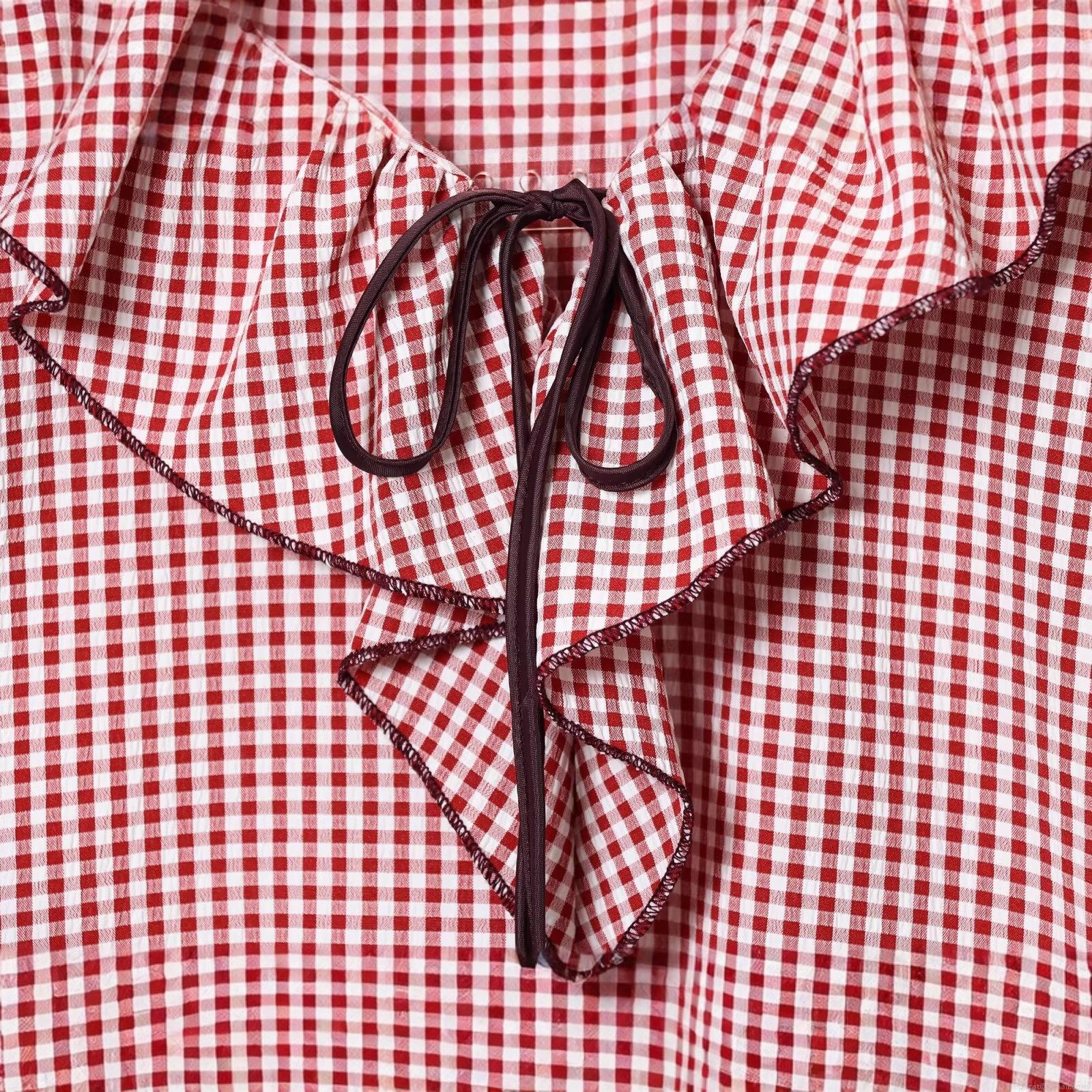 • Women's Long Sleeve Red White Gingham Plaid Blouse Ruffle V-Neck Tie Detail Vintage Sweet Casual Tops Shirt