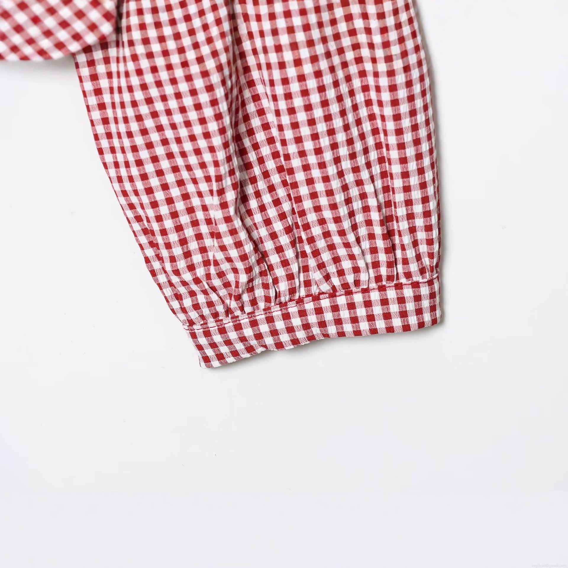 Women's Long Sleeve Red White Gingham Plaid Blouse Ruffle V-Neck Tie Detail Vintage Sweet Casual Tops Shirt