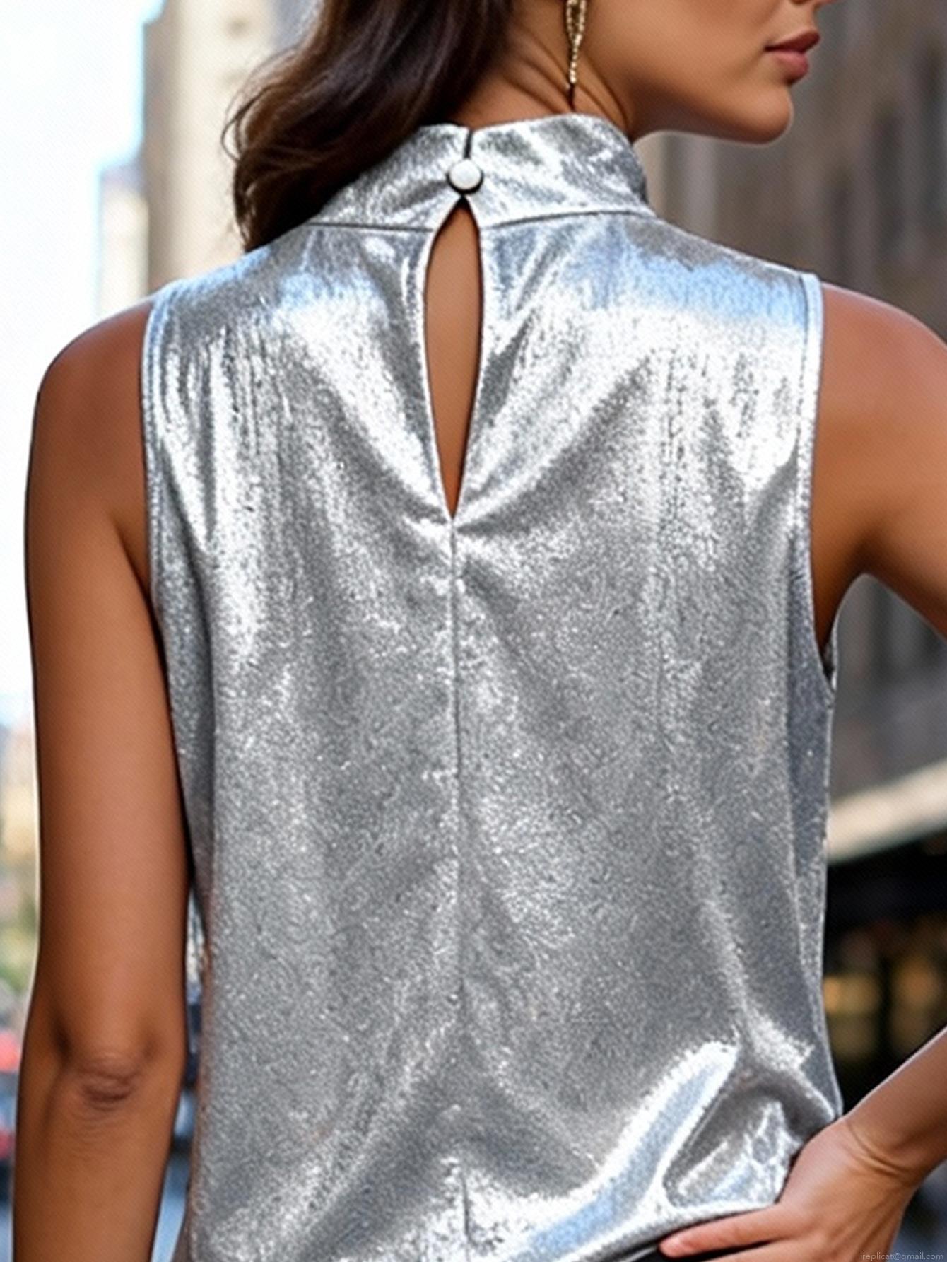 • Women's Metallic Silver Sleeveless T-Shirt Shiny Foil Mock Neck Vest Top Casual Chic Streetwear Party Fashion Polyester Top For Women