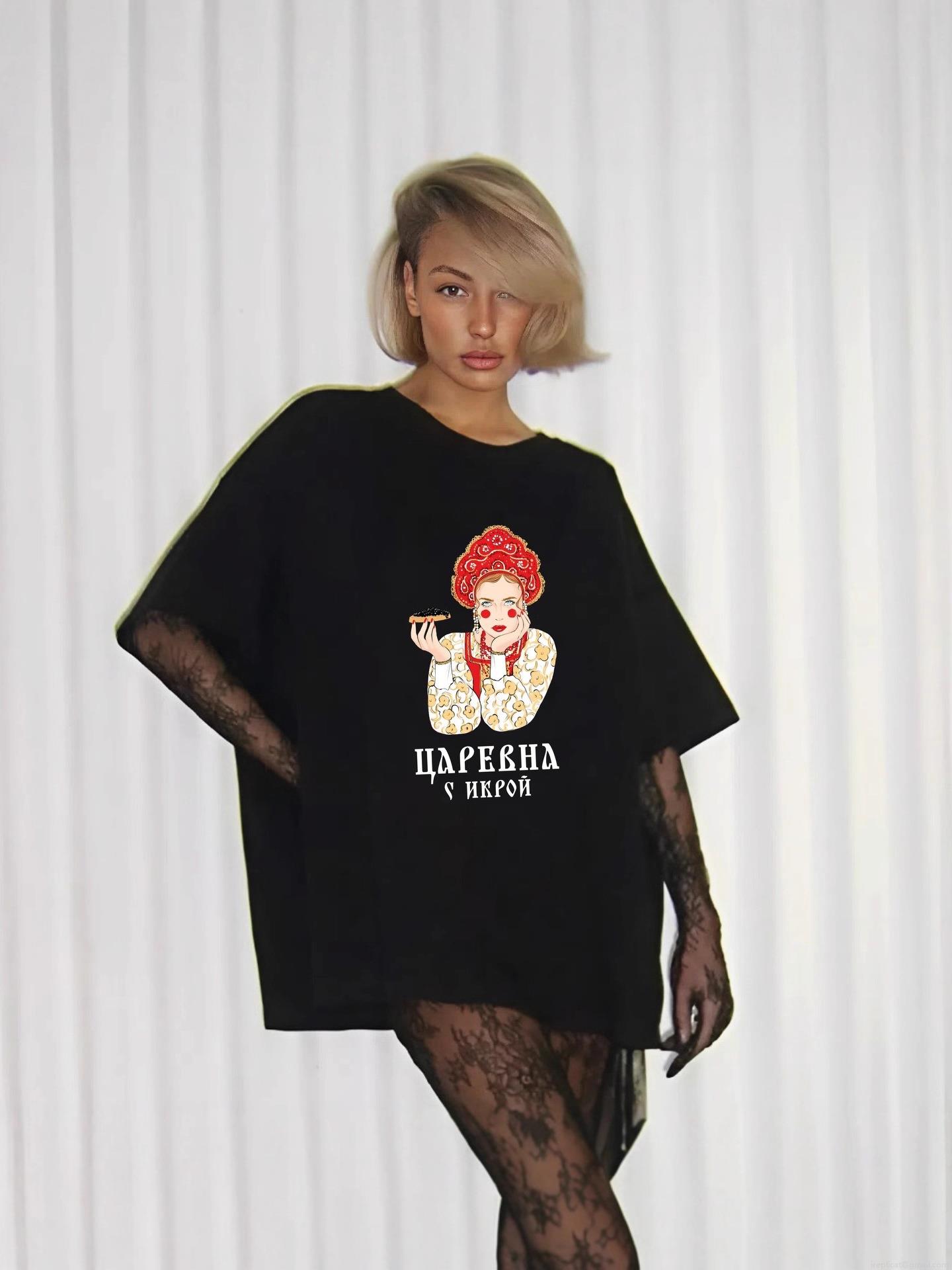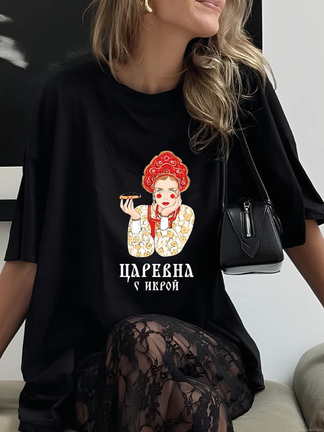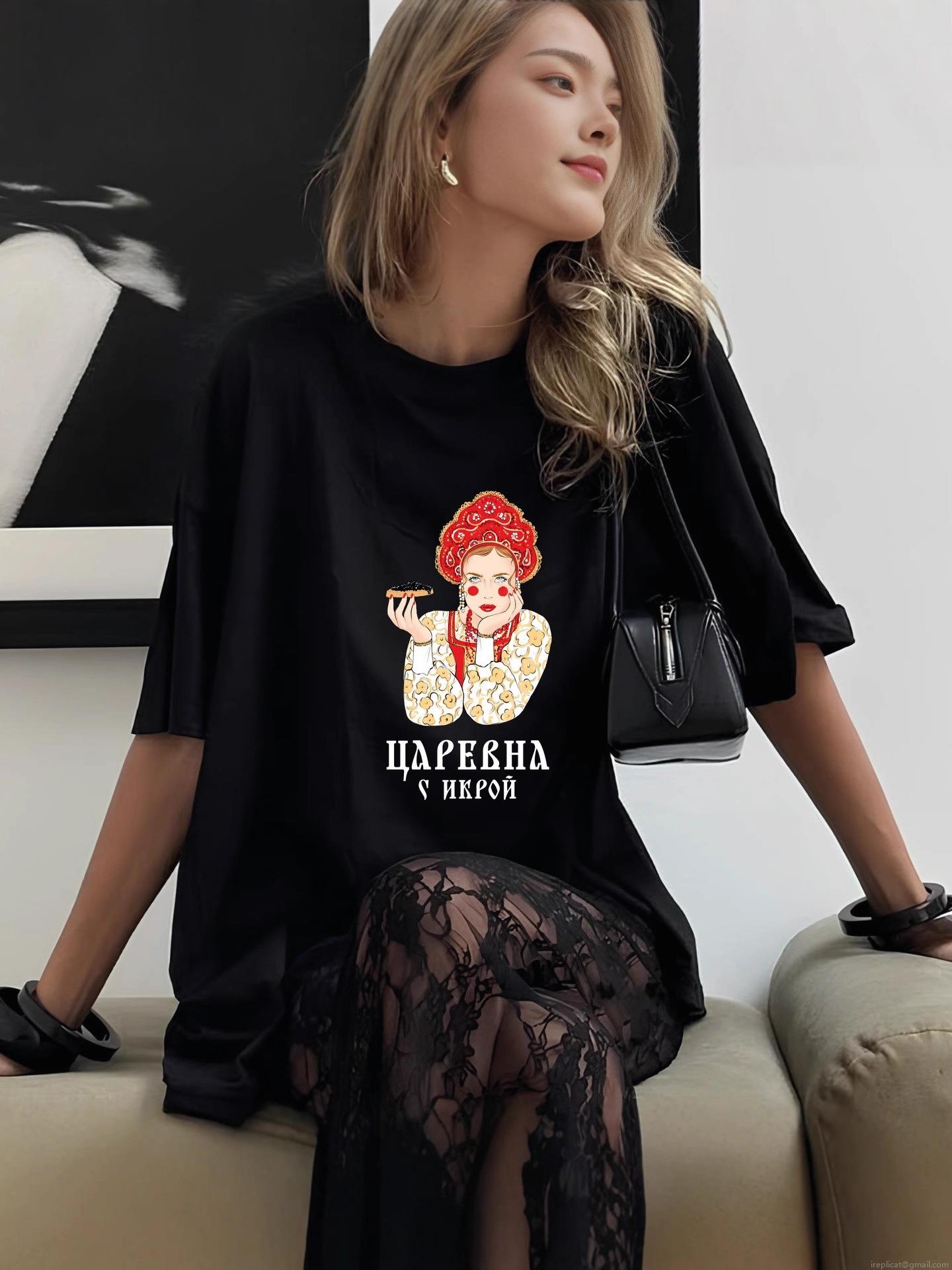Women's Oversized Cotton T-Shirt Round Neck Short Sleeve Russian Folklore Princess Graphic Print Casual Streetwear Loose Top For Summer