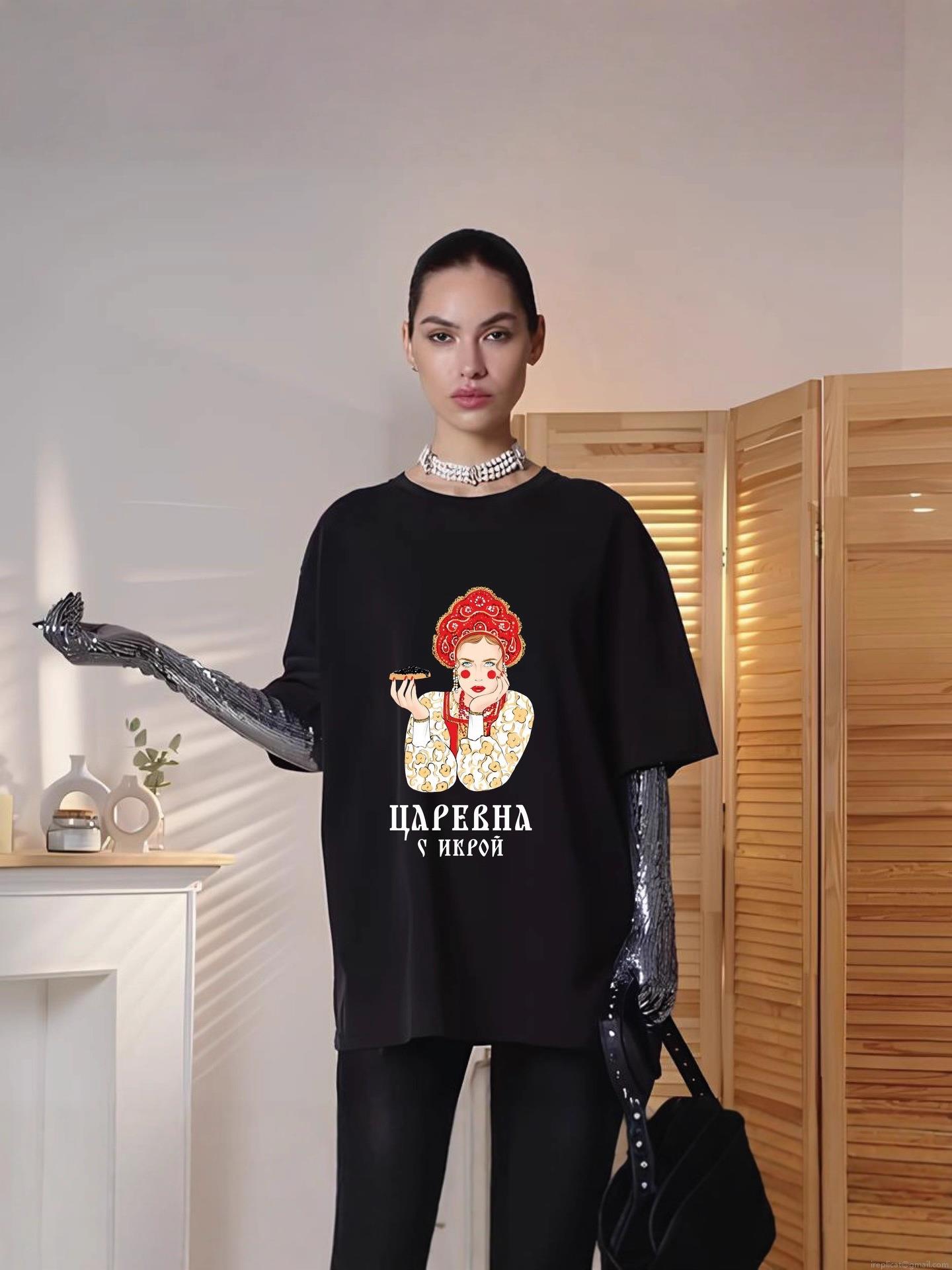Digital, Text Elements, Dropped Shoulder Sleeves, Loose Silhouette, Russian Characters, Russian Folk Illustrations, Female Characters