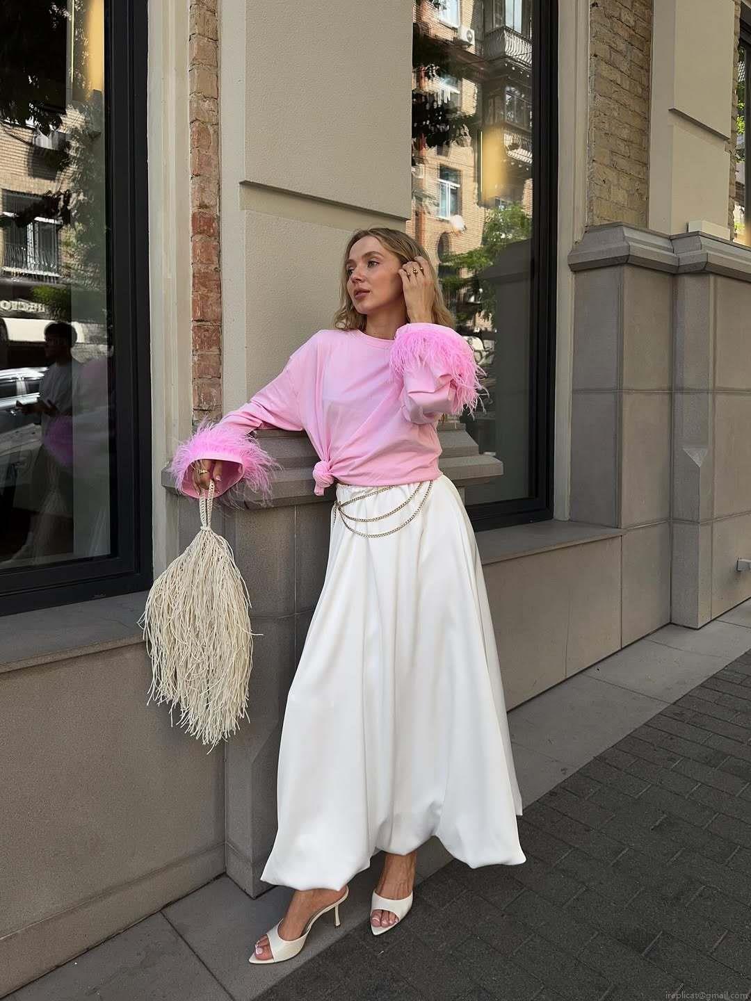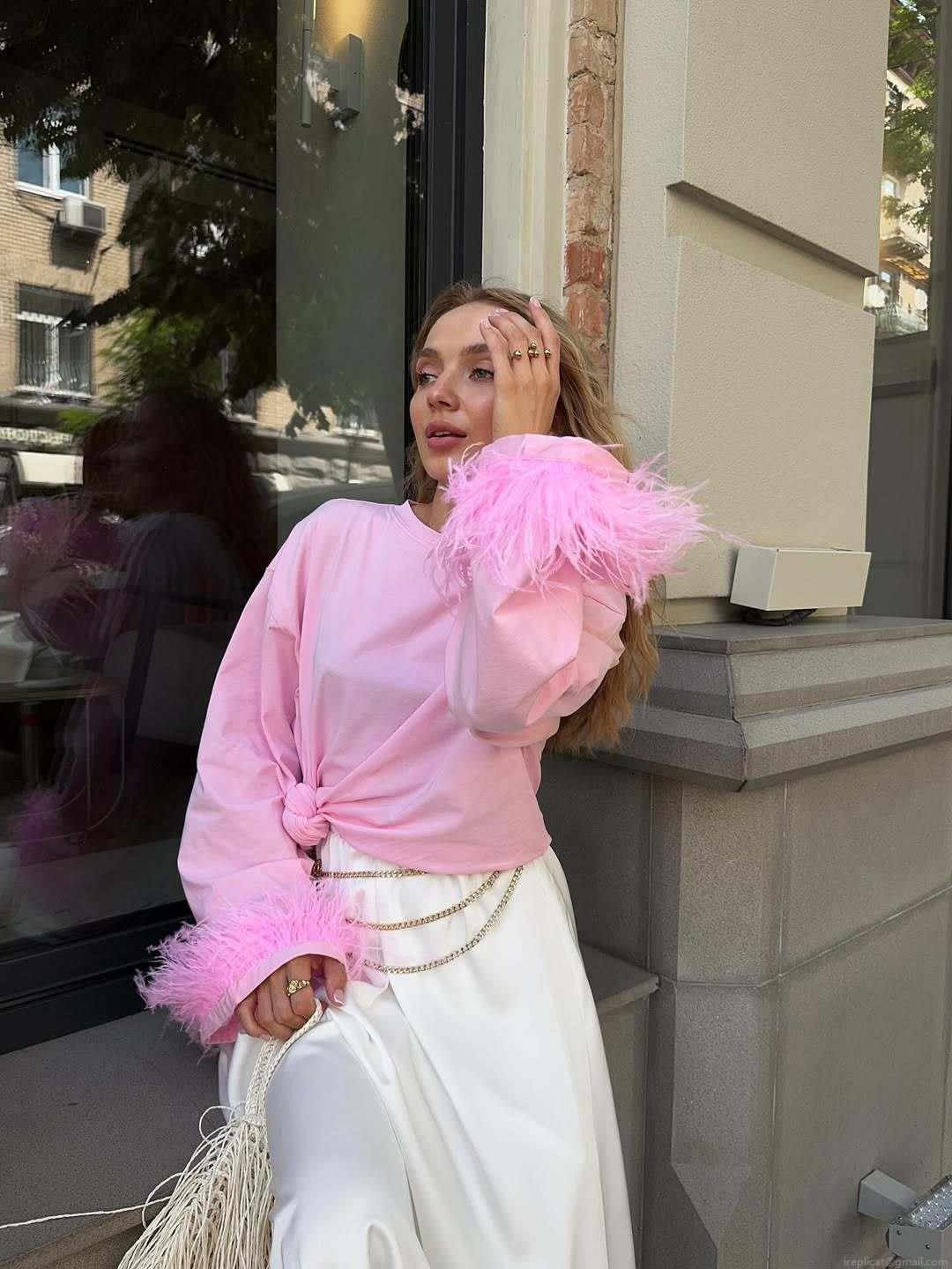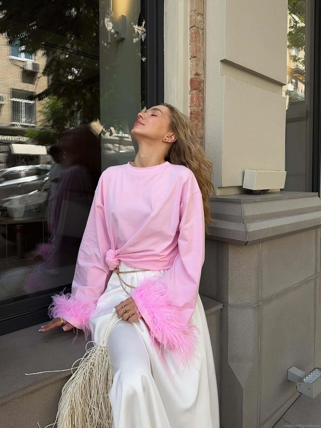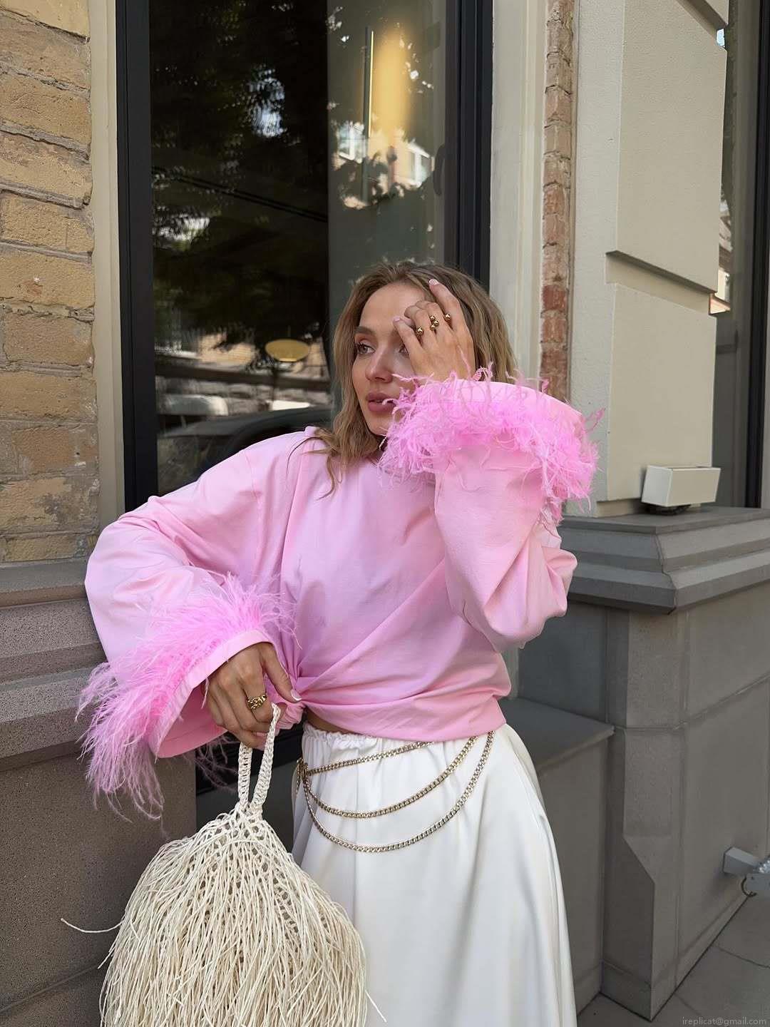 • Women's Pink Cotton Blend Knitted T-Shirt Featuring Faux Feather Cuffs Detail Oversized Long Sleeve Round Neck Sexy Streetwear Top For Date Night Party Ladies Fashion Clothing