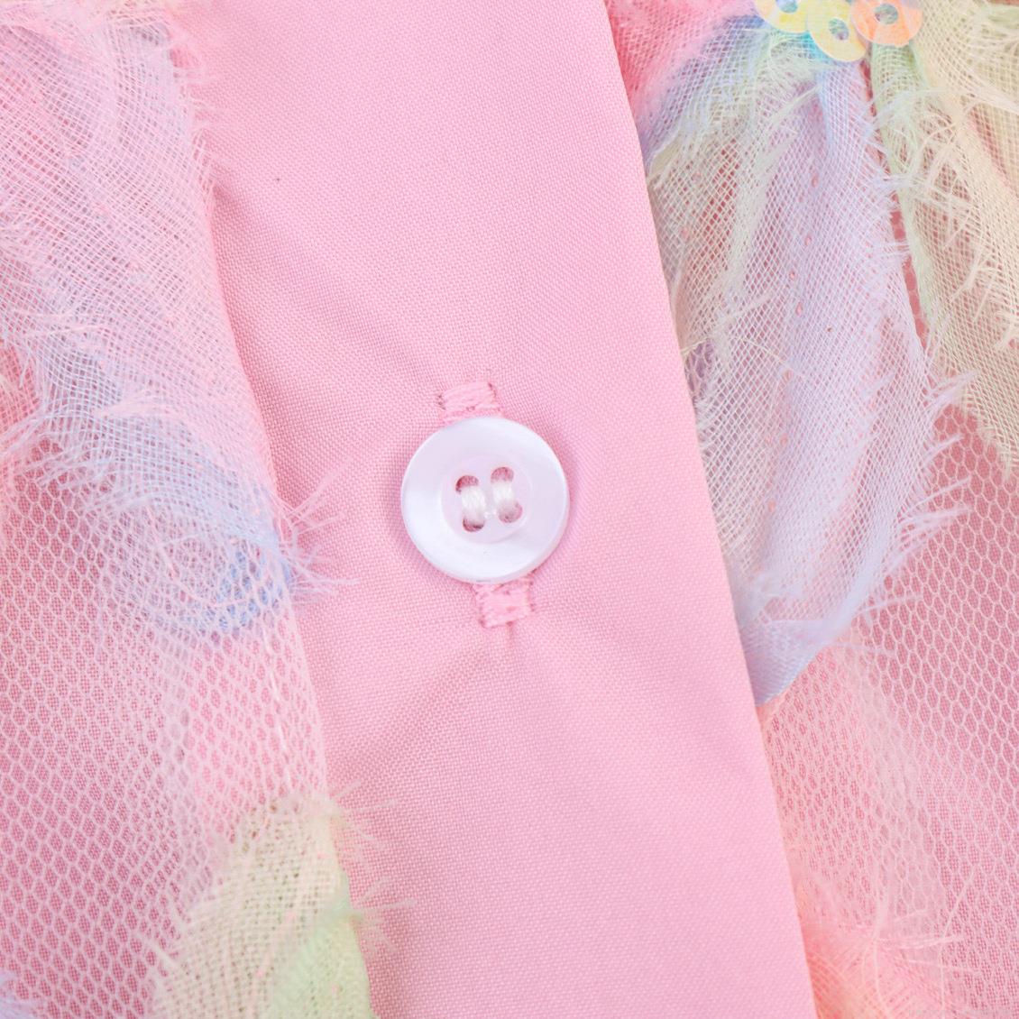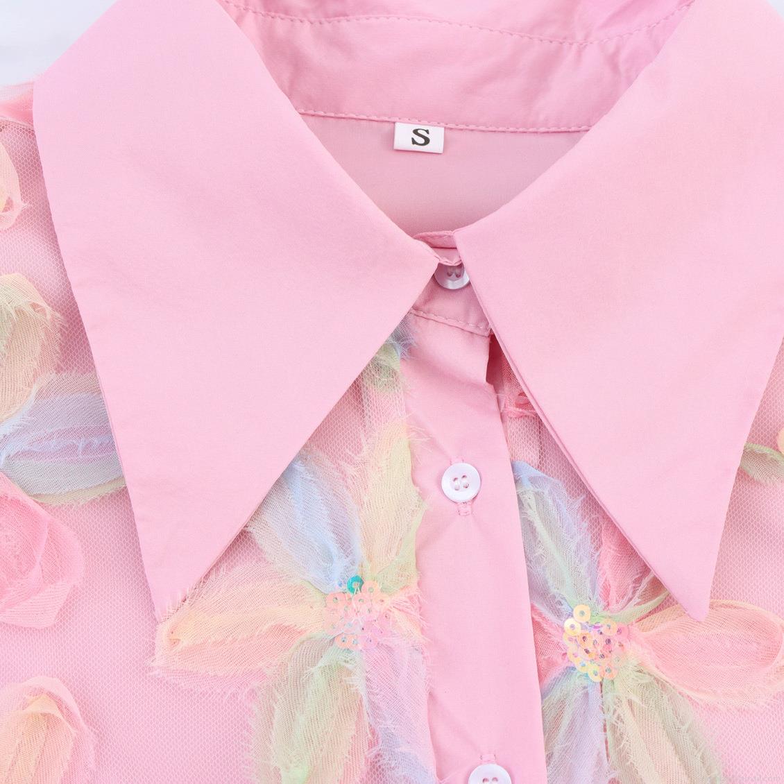 • Women's Pink Mesh Blouse Sheer Top With 3D Colorful Flowers Sequins Puff Sleeve Button Up Shirt For Party Dating Sweet Girly Style
